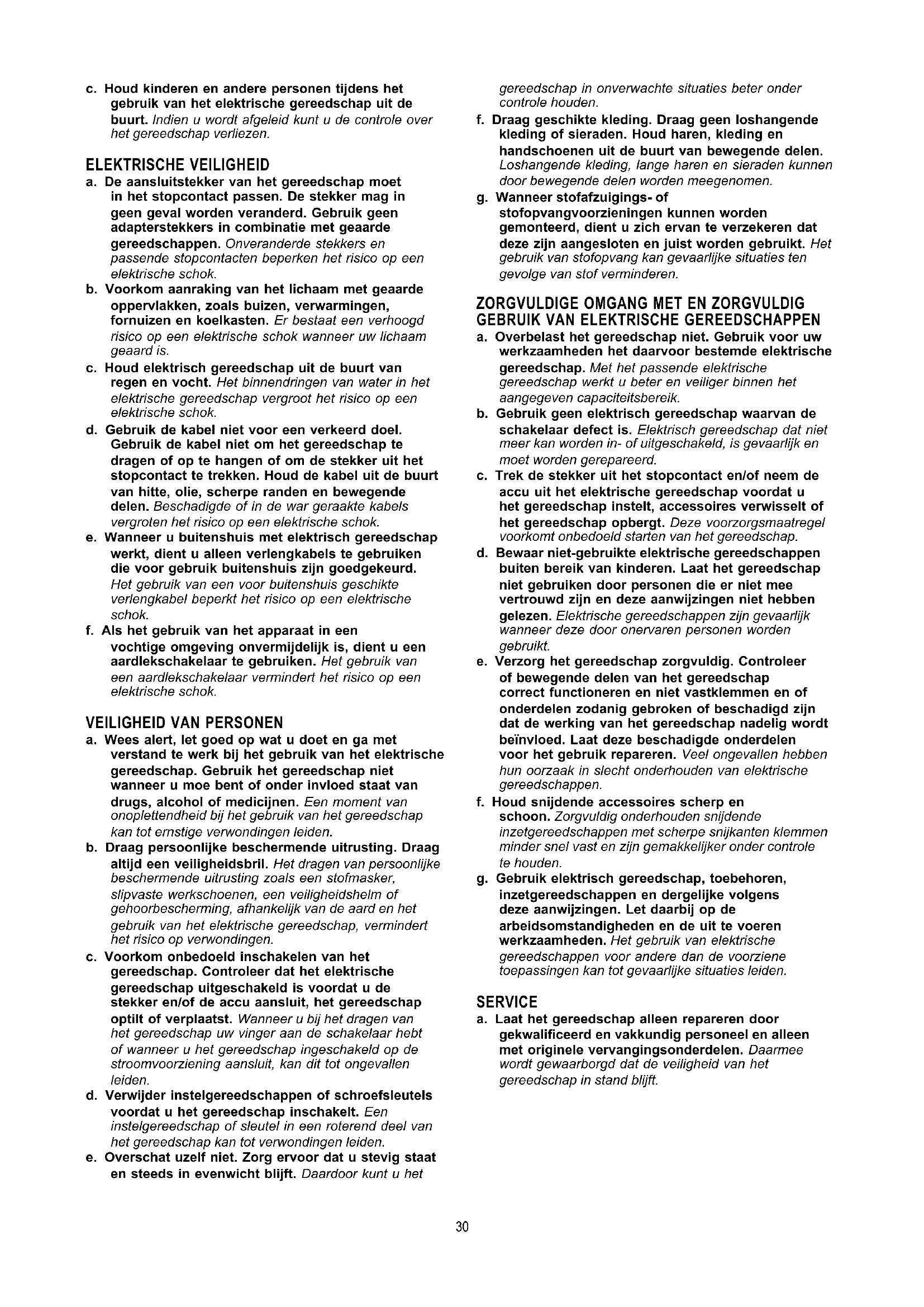 a. Houd uw werkomgeving schoon en goed verlicht. Een rommelige of onverlichte werkomgeving kan tot ongevallen leiden.b. Gebruik het gereedschap niet in een omgeving met explosiegevaar waarin zich brandbare vloeistoen, brandbare gassen of brandbare stoen bevinden. Elektrische gereedschappen veroorzaken vonken die stof of dampen tot ontsteking kunnen brengen. 29c. Houd kinderen en andere personen tijdens het gebruik van het elektrische gereedschap uit de buurt. Indien u wordt afgeleid kunt u de controle over het gereedschap verliezen. ELEKTRISCHE VEILIGHEID a. De aansluitstekker van het gereedschap moet in het stopcontact passen. De stekker mag in geen geval worden veranderd. Gebruik geen adapterstekkers in combinatie met geaarde gereedschappen. Onveranderde stekkers en passende stopcontacten beperken het risico op een elektrische schok. b. Voorkom aanraking van het lichaam met geaarde oppervlakken, zoals buizen, verwarmingen, fornuizen en koelkasten. Er bestaat een verhoogd risico op een elektrische schok wanneer uw lichaam geaard is. c. Houd elektrisch gereedschap uit de buurt van regen en vocht. Het binnendringen van water in het elektrische gereedschap vergroot het risico op een elektrische schok. d. Gebruik de kabel niet voor een verkeerd doel. Gebruik de kabel niet om het gereedschap te dragen of op te hangen of om de stekker uit het stopcontact te trekken. Houd de kabel uit de buurt van hitte, olie, scherpe randen en bewegende delen. Beschadigde of in de war geraakte kabels vergroten het risico op een elektrische schok. e. Wanneer u buitenshuis met elektrisch gereedschap werkt, dient u alleen verlengkabels te gebruiken die voor gebruik buitenshuis zijn goedgekeurd. Het gebruik van een voor buitenshuis geschikte verlengkabel beperkt het risico op een elektrische schok. f. Als het gebruik van het apparaat in een vochtige omgeving onvermijdelijk is, dient u een aardlekschakelaar te gebruiken. Het gebruik van een aardlekschakelaar vermindert het risico op een elektrische schok.