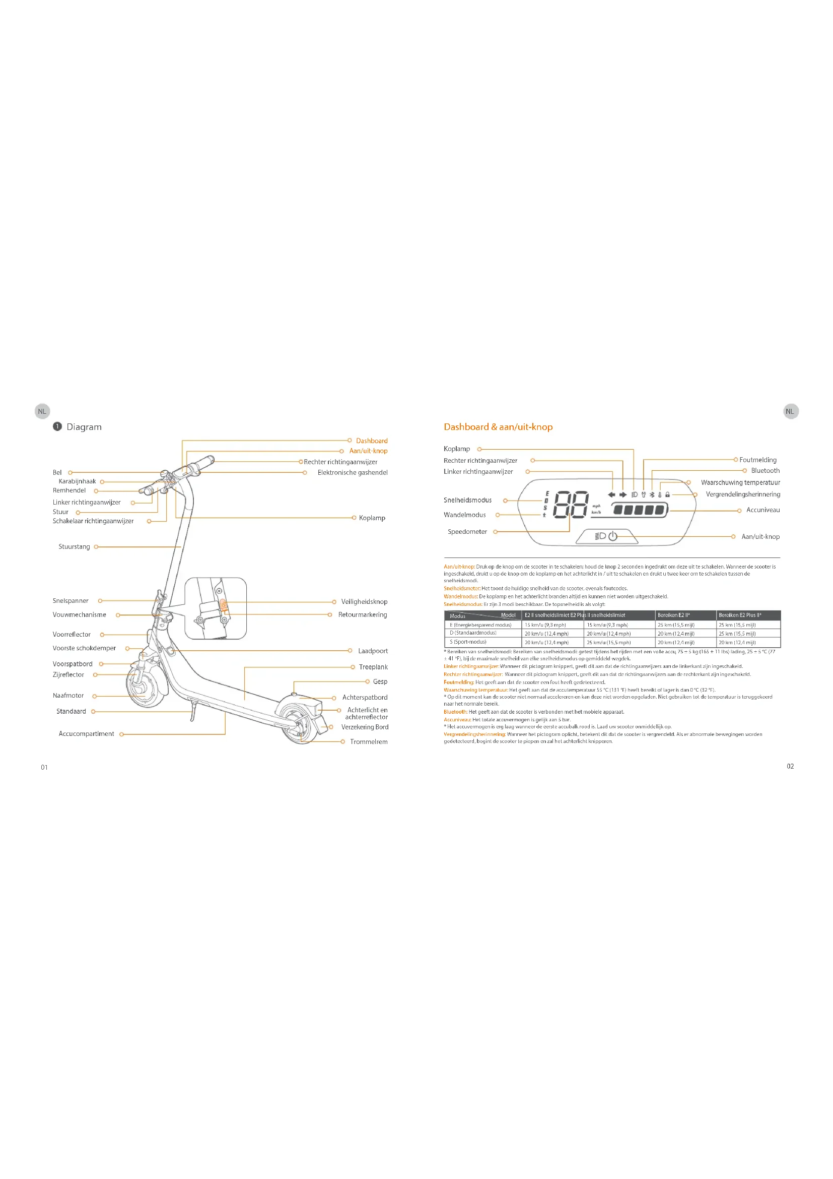 Dashboard & aan/uit-knop Speedometer Waarschuwing temperatuur Vergrendelingsherinnering Bluetooth Snelheidsmodus Wandelmodus Koplamp Foutmelding Accuniveau Aan/uit-knop Model Modus E2 II snelheidslimiet E2 Plus II snelheidslimiet 15 km/u (9,3 mph) 20 km/u (12,4 mph) 20 km/u (12,4 mph) 15 km/u (9,3 mph) 20 km/u (12,4 mph) 25 km/u (15,5 mph) Bereiken E2 Plus II* 25 km (15,5 mijl) 25 km (15,5 mijl) 20 km (12,4 mijl) Bereiken E2 II* 25 km (15,5 mijl) 20 km (12,4 mijl) 20 km (12,4 mijl) D (Standaardmodus) E (Energiebesparend modus) S (Sport-modus) Bel Stuur Elektronische gashendel Schakelaar richtingaanwijzer Linker richtingaanwijzer Rechter richtingaanwijzer Karabijnhaak Dashboard Remhendel Koplamp Stuurstang Veiligheidsknop Retourmarkering Vouwmechanisme Snelspanner Voorspatbord Voorste schokdemper Naafmotor Laadpoort Treeplank Gesp Achterspatbord Trommelrem Zijreector Voorreector Standaard Accucompartiment Aan/uit-knop Linker richtingaanwijzer Rechter richtingaanwijzer Achterlicht en achterreector Verzekering Bord NLNL