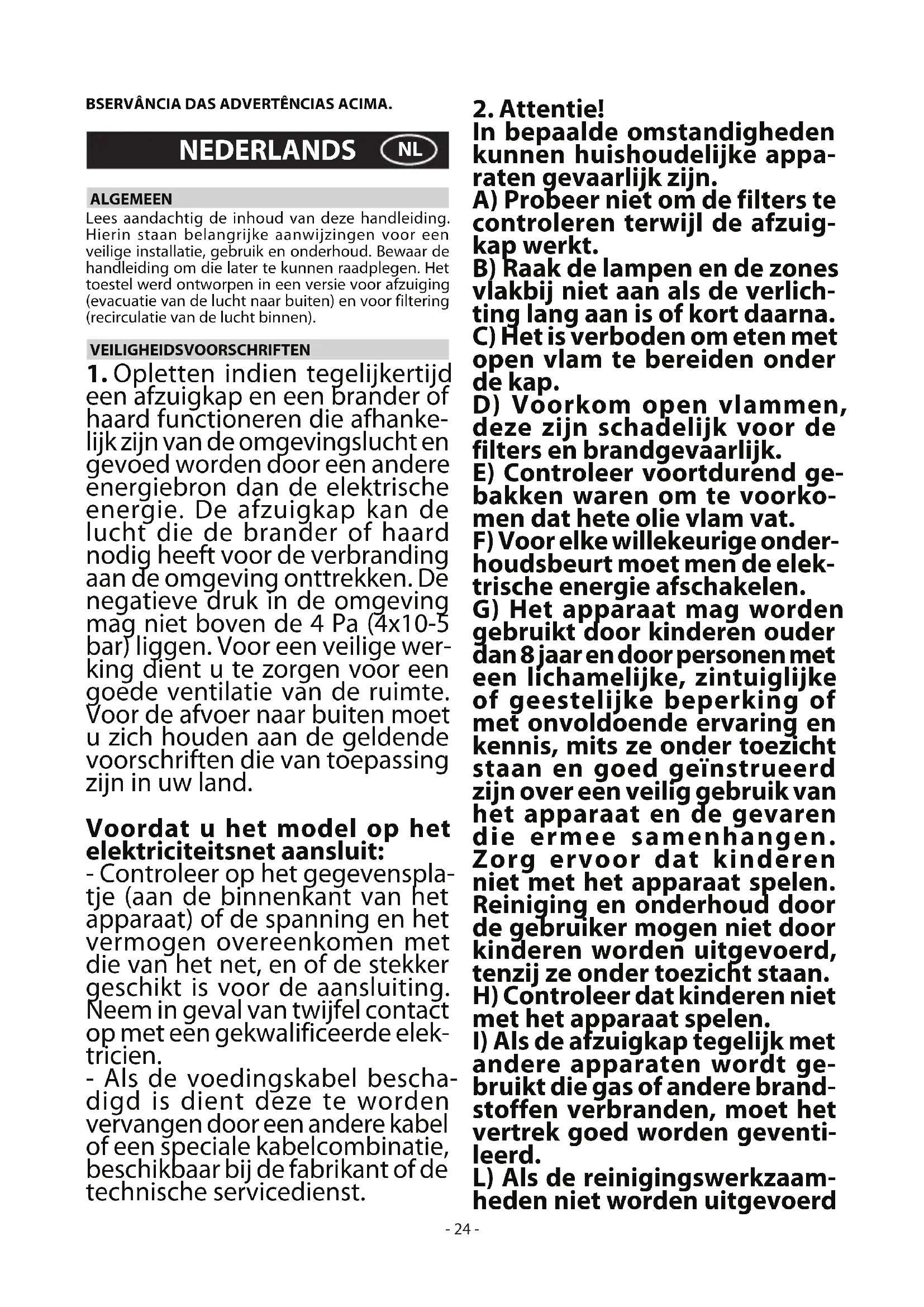 In bepaalde omstandigheden kunnen huishoudelijke appa- raten gevaarlijk zijn. A) Probeer niet om de filters te controleren terwijl de afzuig- kap werkt. B) Raak de lampen en de zones vlakbij niet aan als de verlich- ting lang aan is of kort daarna. C) Het is verboden om eten met open vlam te bereiden onder de kap. D) Voorkom open vlammen, deze zijn schadelijk voor de filters en brandgevaarlijk. E) Controleer voortdurend ge- bakken waren om te voorko- men dat hete olie vlam vat. F) Voor elke willekeurige onder- houdsbeurt moet men de elek- trische energie afschakelen. G) Het apparaat mag worden gebruikt door kinderen ouder dan 8 jaar en door personen met een lichamelijke, zintuiglijke of geestelijke beperking of met onvoldoende ervaring en kennis, mits ze onder toezicht staan en goed geïnstrueerd zijn over een veilig gebruik van het apparaat en de gevaren die ermee samenhangen. Zorg ervoor dat kinderen niet met het apparaat spelen. Reiniging en onderhoud door de gebruiker mogen niet door kinderen worden uitgevoerd, tenzij ze onder toezicht staan. H) Controleer dat kinderen niet met het apparaat spelen.