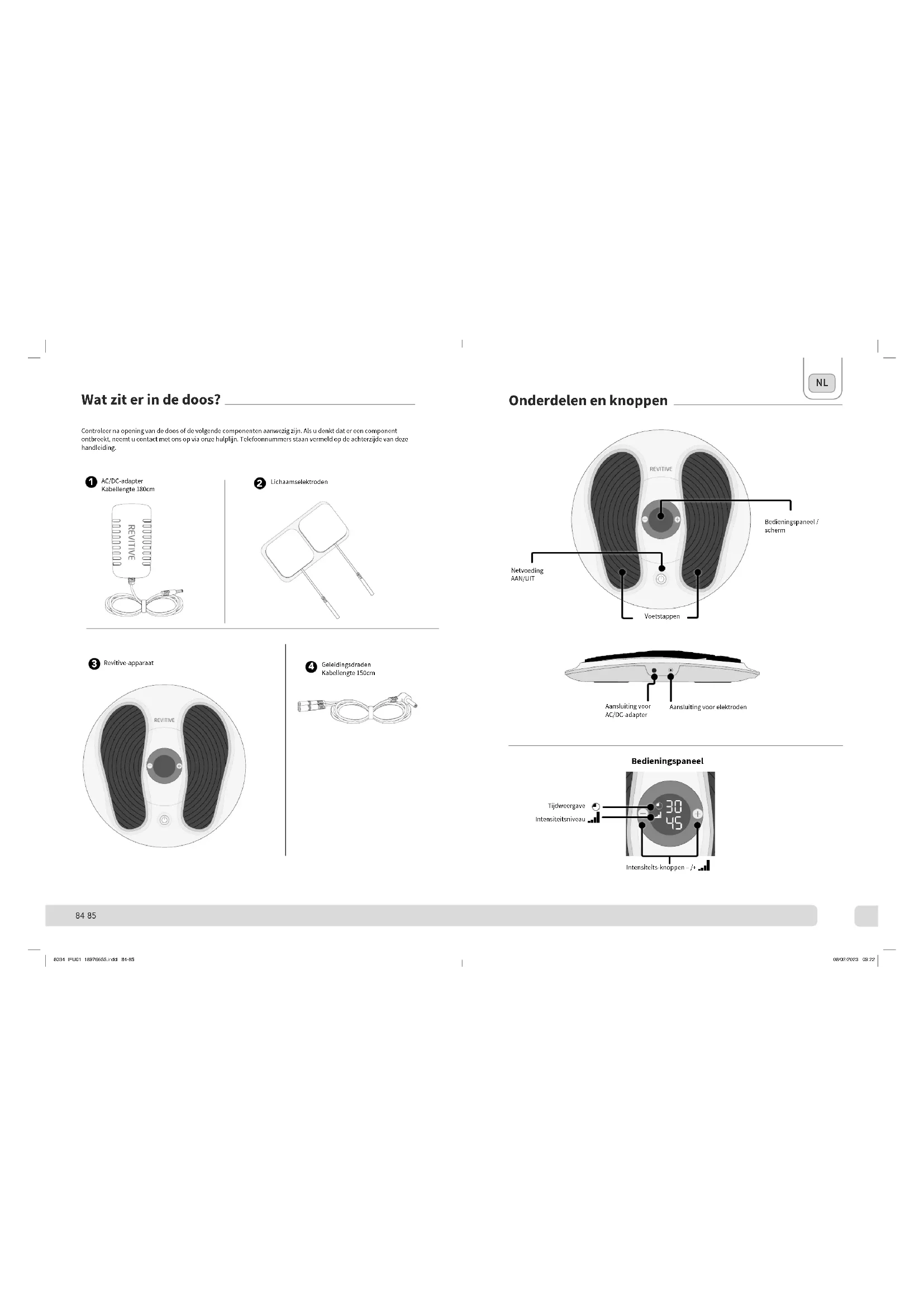 REVITIVE Bedieningspanel / schem Netvoeding AAN/UIT Voetstappen Aansluiting voor AC/DC. adapter Aansluiting voor elektroden
