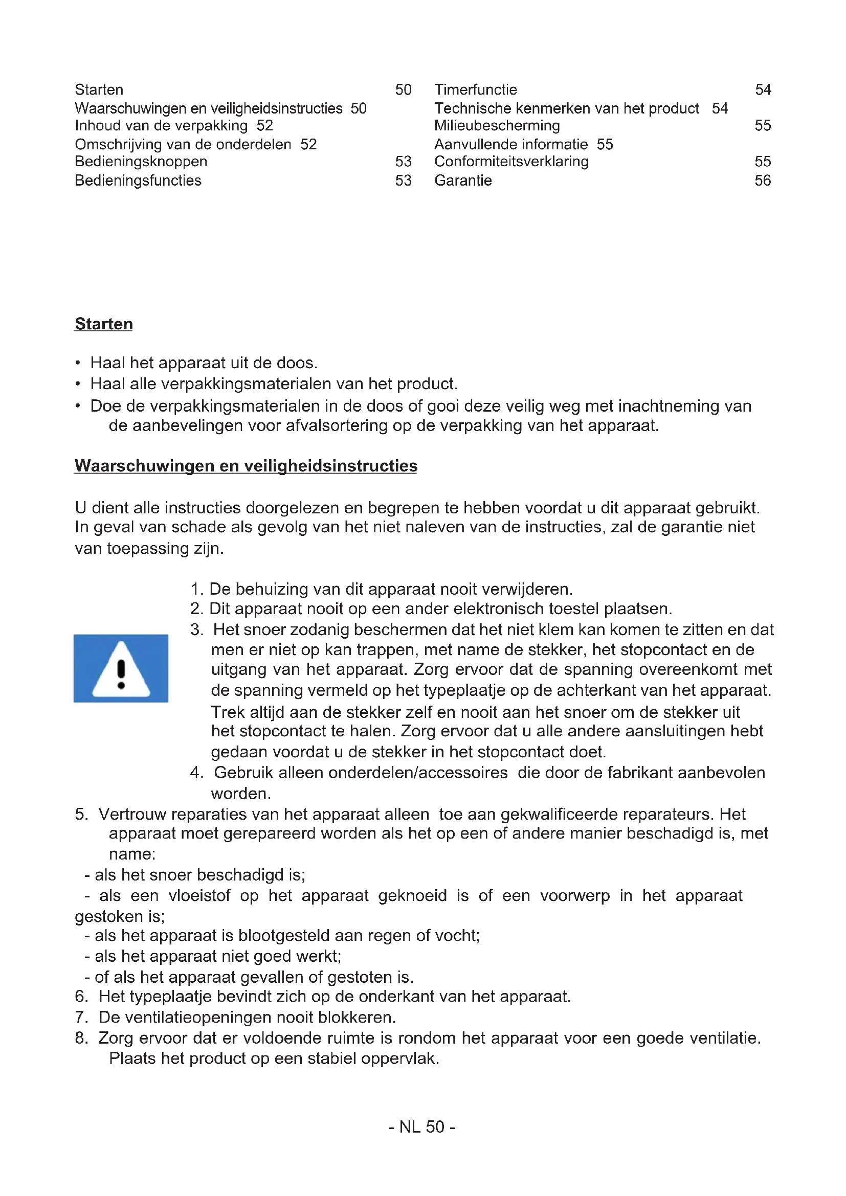 Plaats het product op een abiel oppervlak. Starten 50 Waarschuwingen en veiligheidsinstructies 50 Inhoud van de verpakking 52 Omschrijving van de onderdelen 52 Bedieningsknoppen 53 Bedieningsfuncties 53 Timerfunctie 54 Technische kenmerken van het product 54 Milieubescherming 55 Aanvullende informatie 55 Conformiteitsverklaring 55 Garantie 56- NL 51 -