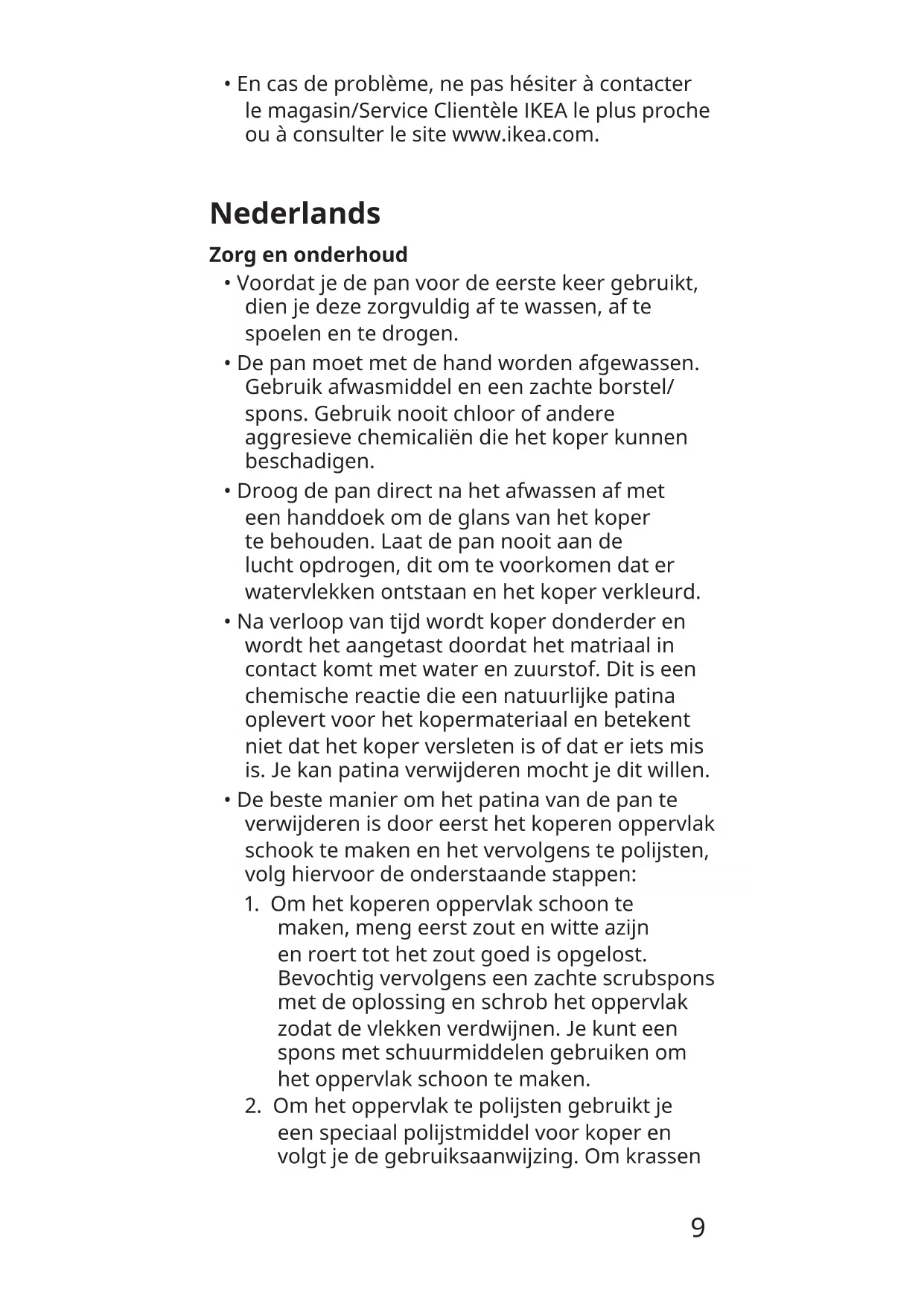 - Bij gebruik in een oven of op een gasfornuis kan de pan verkleuren. Om de koperkleur terug te krijgen, reinig en polijst je het oppervlak volgens de stappen hierboven.