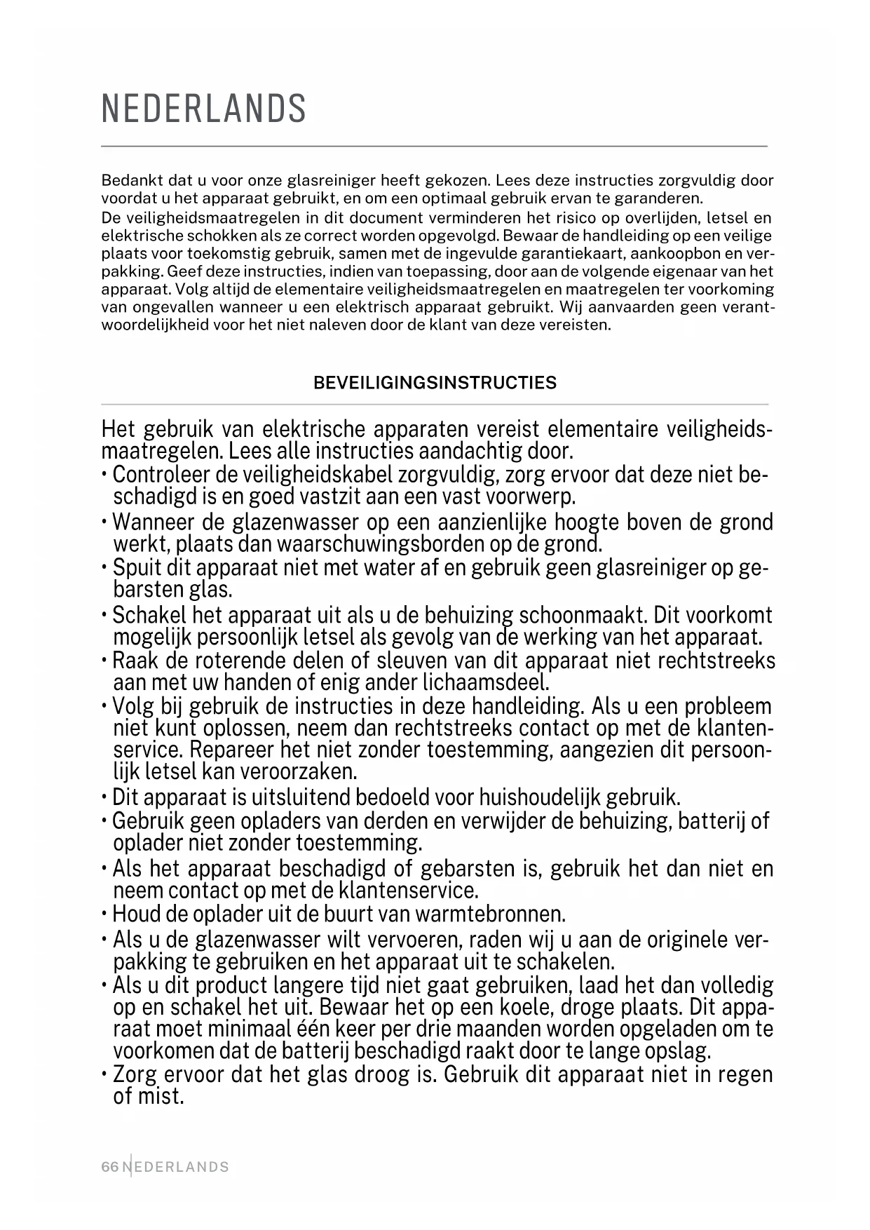 - Wenn kein Sand oder Staub vorhanden ist, sprühen Sie mehrmals leicht sauberes Wasser oder Reinigungsmittel auf den Mopp oder das Glas, ohne es zu stark zu befeuchten.66 NEDERLANDS NEDERLANDS Bedankt dat u voor onze glasreiniger heeft gekozen. Lees deze instructies zorgvuldig door voordat u het apparaat gebruikt, en om een optimaal gebruik ervan te garanderen. De veiligheidsmaatregelen in dit document verminderen het risico op overlijden, letsel en elektrische schokken als ze correct worden opgevolgd. Bewaar de handleiding op een veilige plaats voor toekomstig gebruik, samen met de ingevulde garantiekaart, aankoopbon en ver- pakking. Geef deze instructies, indien van toepassing, door aan de volgende eigenaar van het apparaat. Volg altijd de elementaire veiligheidsmaatregelen en maatregelen ter voorkoming van ongevallen wanneer u een elektrisch apparaat gebruikt. Wij aanvaarden geen verant- woordelijkheid voor het niet naleven door de klant van deze vereisten. BEVEILIGINGSINSTRUCTIES Het gebruik van elektrische apparaten vereist elementaire veiligheids- maatregelen. Lees alle instructies aandachtig door.
