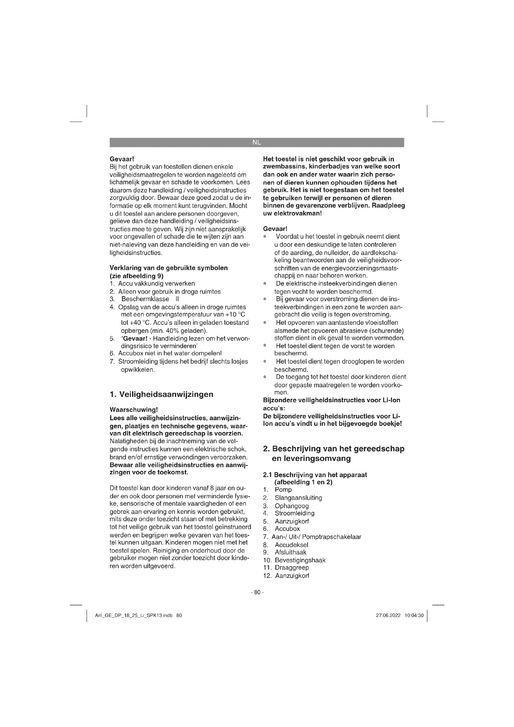 Om de pomp uit te schakelen drukt u zo op de keuzeschakelaar voor de pompmodus, dat deze zich in de positie ‘0’ bevindt. Pomp inschakelen: De pomp bezit een niveauschakelaar (7) aan de accubox (6). Schakelaarstand 0: Uit Schakelaarstand I: Pompniveau 1 (ECO) Schakelaarstand II: Pompniveau 2 (BOOST) Opgelet! Door pompniveau 2 te kiezen wordt de maximale transportdruk en -hoeveelheid verhoogd, maar de maximale looptijd van de accu verlaagd. Droogloopbeveiliging: De pomp bezit een droogloopbeveiliging en schakelt bij uitblijvende transportvloeistof na ca. 20 seconden uit. Schakel de pomp via de Aan/ Uit-schakelaar (7) uit of neem de accu eruit om de geactiveerde droogloopbeveiliging te resetten. Daarna is de pomp weer klaar voor inzet. Let bij de inbedrijfstelling van de pomp op de minimum waterstand. Anl_GE_DP_18_25_Li_SPK13.indb 83Anl_GE_DP_18_25_Li_SPK13.indb 83 27.06.2022 10:04:3127.06.2022 10:04:31NL