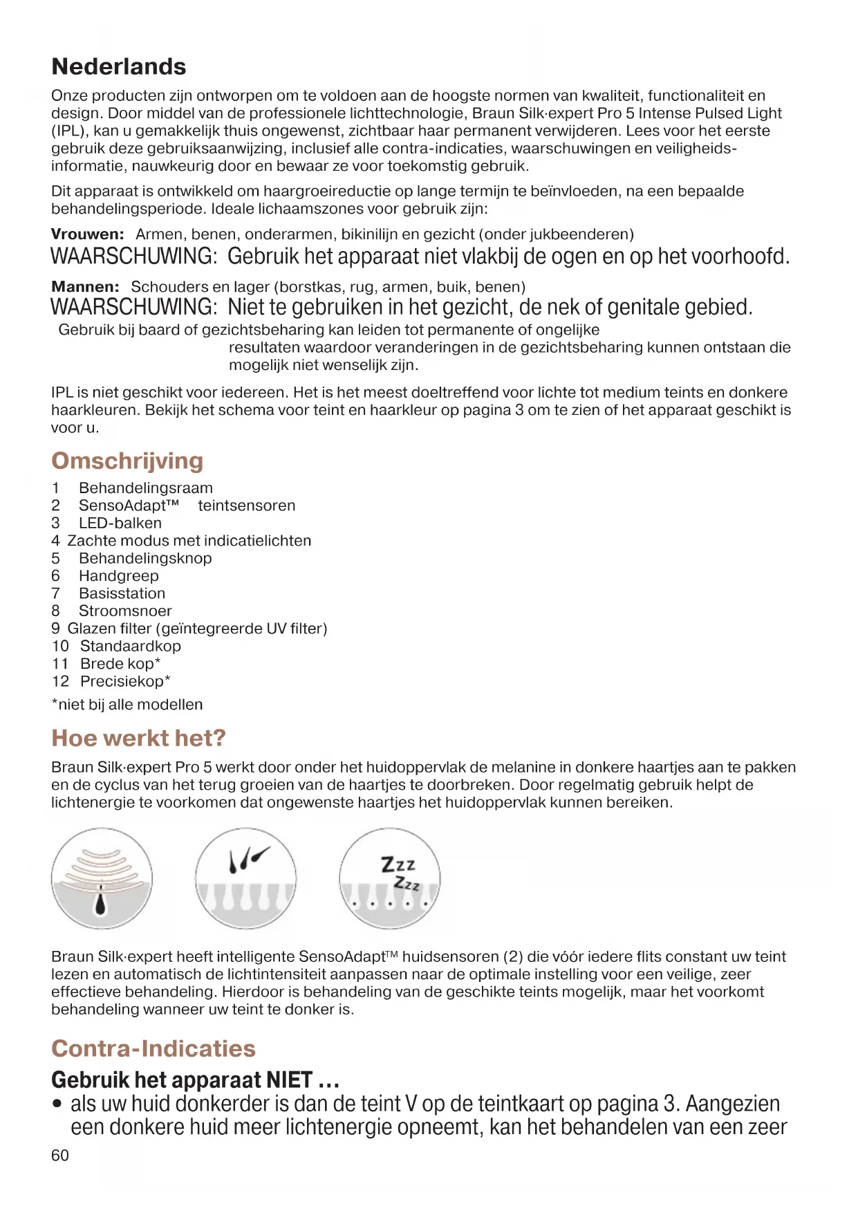 huidsensoren (2) die vóór iedere flits constant uw teint lezen en automatisch de lichtintensiteit aanpassen naar de optimale instelling voor een veilige, zeer effectieve behandeling. Hierdoor is behandeling van de geschikte teints mogelijk, maar het voorkomt behandeling wanneer uw teint te donker is. Contra-Indicaties Gebruik het apparaat NIET ...