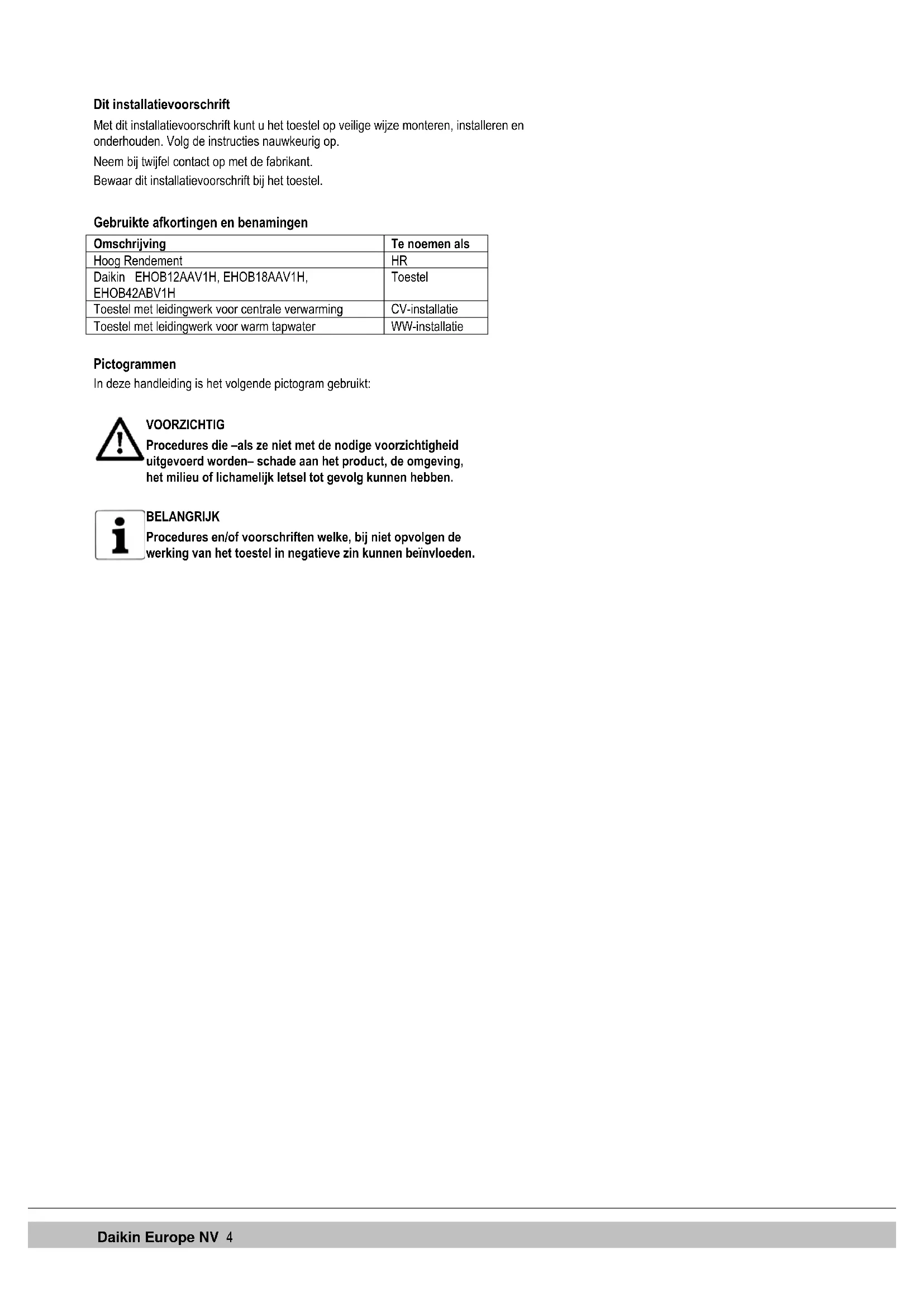 Vermogen in kilowatt BE, FR, IT, PL Bestemmingslanden (EN 437) II2H3P, II2Esi3P, I2E(S), I2E3P Toegestane toestel categorie (EN 437) G20-20 mbar G25-25 mbar Gssoort en voordruk (fabrieksinstelling, EN 437) B23, …. C93(x) Toegestane rookgascategorie (EN 15502) Tmax Max. aanvoertemperatuur in °C IPX4D Electrische beschermingsklasse 1 VEILIGHEIDSVOORSCHRIFTEN BELANGRIJK Dit product is uitsluitend voor huishoudelijk gebruik bestemd. De fabrikant Daikin Europe NV aanvaardt geen enkele aansprakelijkheid voor schade of letsel veroorzaakt door het niet (strikt) naleven van de veiligheidsvoorschriften en - instructies, dan wel door onachtzaamheid tijdens het installeren van de Daikin EHOB**A*V1H gaswandketel en de eventueel bijbehorende accessoires. Dit apparaat is niet bedoeld voor gebruik door personen (inclusief kinderen) met verminderde lichamelijke, zintuiglijke of geestelijke vermogens, of gebrek aan ervaring en kennis, tenzij zij toezicht of instructie over het gebruik van het apparaat door een persoon die verantwoordelijk is voor hun veiligheid is gegeven. De gehele installatie moet voldoen aan de geldende lokale technische en (veiligheids)voorschriften van toepassing en dit zowel voor de gasinstallatie, de elektrische installatie, rookgasafvoerinstallatie, dinkwaterinstallatie en CV- installatie. Afhankelijk van het bouwjaar kan een Daikin EHOB**A*V1H een onderdeel bevatten waarin keramische vezels zijn verwerkt. Dit kan van toepassing zijn op de kijkglaspakking en op de isolatiepakking van de voorplaat. Gebruik altijd de aanbevolen persoonlijke beschermingsmiddelen bij het werken met keramische vezels.Daikin Europe NV 6 2 TOESTELOMSCHRIJVING