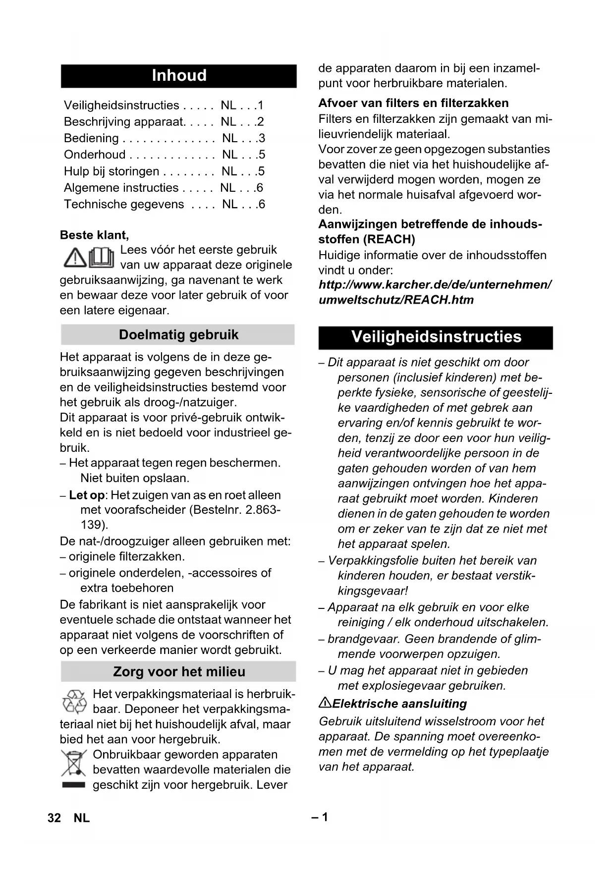 - J 1 30 IT– 6 Per il montaggio inserire prima il galleg- giante e successivamente inserire e bloccare il cesto a galleggiante. Se la potenza di aspirazione dell'apparec- chio diminuisce, controllare i seguenti punti: Accessori, tubo flessibile di aspirazione o tubo rigido di aspirazione otturati, si pre- ga di eliminare le otturazioni. Il filtro plissettato piatto è sporco: Per apparecchi senza pulizia del filtro ExPress: Smontare e pulire il filtro plis- settato piatto (vedi capitolo "Pulire il filtro plissettato piatto"). Per apparecchi con pulizia del filtro ExPress: Premere 3 volte il tasto per la pulizia del filtro ed event. ripetere la puli- zia con il tubo flessibile di aspirazione chiuso (vedi capitolo „Pulire il filtro plis- settato piatto“). All'occorrenza pulire il filtro sotto acqua corrente. Sostituire i filtri plissettati piatti danneg- giati. Il sacchetto filtrante è pieno: Inserire un sacchetto filtro nuovo (N. d'ordine vedi li- sta pezzi di ricambio alla fine delle pre- senti istruzioni). 몇 Attenzione Non gettare l'alloggiamento del sacchetto fil- tro! In tutti i paesi sono valide le condizioni di ga- ranzia pubblicate dalla nostra società di ven- dita competente. Entro il termine di garanzia eliminiamo gratuitamente eventuali guasti all’apparecchio, se causati da un difetto di materiale o di produzione. Nei casi previsti dalla garanzia si prega di rivolgersi al proprio rivenditore, oppure al più vicino centro di as- sistenza autorizzato, esibendo lo scontrino di acquisto. (Indirizzo vedi retro) In caso di domande o anomalie la filiale KÄRCHER è felice di poterla aiutare. (Indirizzo vedi retro) La lista dei pezzi di ricambio più comuni è ri- portata alla fine del presente manuale d'uso. I ricambi e gli accessori sono reperibili pres- so il rivenditore di fiducia o una filiale KÄR- CHER. (Indirizzo vedi retro) I dati tecnici sono riportati sulle aperture. Di seguito la spiegazione dei simboli usati. Con riserva di modifiche tecniche! Diminuzione della potenza di aspi- razione Avvertenze generali Garanzia Servizio assistenza Ordinare ricambi e accessori spe- ciali Dati tecnici Tensione Potenza P nom Potenza P max Potenza di collegamento max. della presa dell'apparecchio Protezione rete (fusibile ritardato) Capacità vano raccolta Assorbimento di acqua con impu- gnatura Assorbimento di acqua con boc- chetta per pavimenti Cavo di alimentazione Pressione acustica (EN 60704-2-1) Peso (senza accessori) 31IT– 1 Beste klant, Lees vóór het eerste gebruik van uw apparaat deze originele gebruiksaanwijzing, ga navenant te werk en bewaar deze voor later gebruik of voor een latere eigenaar. Het apparaat is volgens de in deze ge- bruiksaanwijzing gegeven beschrijvingen en de veiligheidsinstructies bestemd voor het gebruik als droog-/natzuiger. Dit apparaat is voor privé-gebruik ontwik- keld en is niet bedoeld voor industrieel ge- bruik. – Het apparaat tegen regen beschermen. Niet buiten opslaan. – Let op: Het zuigen van as en roet alleen met voorafscheider (Bestelnr. 2.863- 139). De nat-/droogzuiger alleen gebruiken met: – originele filterzakken. – originele onderdelen, -accessoires of extra toebehoren De fabrikant is niet aansprakelijk voor eventuele schade die ontstaat wanneer het apparaat niet volgens de voorschriften of op een verkeerde manier wordt gebruikt. Het verpakkingsmateriaal is herbruik- baar. Deponeer het verpakkingsma- teriaal niet bij het huishoudelijk afval, maar bied het aan voor hergebruik. Onbruikbaar geworden apparaten bevatten waardevolle materialen die geschikt zijn voor hergebruik. Lever de apparaten daarom in bij een inzamel- punt voor herbruikbare materialen. Filters en filterzakken zijn gemaakt van mi- lieuvriendelijk materiaal. Voor zover ze geen opgezogen substanties bevatten die niet via het huishoudelijke af- val verwijderd mogen worden, mogen ze via het normale huisafval afgevoerd wor- den. Aanwijzingen betreffende de inhouds- stoffen (REACH) Huidige informatie over de inhoudsstoffen vindt u onder: http://www.karcher.de/de/unternehmen/ umweltschutz/REACH.htm – Dit apparaat is niet geschikt om door personen (inclusief kinderen) met be- perkte fysieke, sensorische of geestelij- ke vaardigheden of met gebrek aan ervaring en/of kennis gebruikt te wor- den, tenzij ze door een voor hun veilig- heid verantwoordelijke persoon in de gaten gehouden worden of van hem aanwijzingen ontvingen hoe het appa- raat gebruikt moet worden. Kinderen dienen in de gaten gehouden te worden om er zeker van te zijn dat ze niet met het apparaat spelen. – Verpakkingsfolie buiten het bereik van kinderen houden, er bestaat verstik- kingsgevaar! – Apparaat na elk gebruik en voor elke reiniging / elk onderhoud uitschakelen. – brandgevaar. Geen brandende of glim- mende voorwerpen opzuigen. – U mag het apparaat niet in gebieden met explosiegevaar gebruiken. 몇 Elektrische aansluiting Gebruik uitsluitend wisselstroom voor het apparaat. De spanning moet overeenko- men met de vermelding op het typeplaatje van het apparaat. Inhoud Veiligheidsinstructies