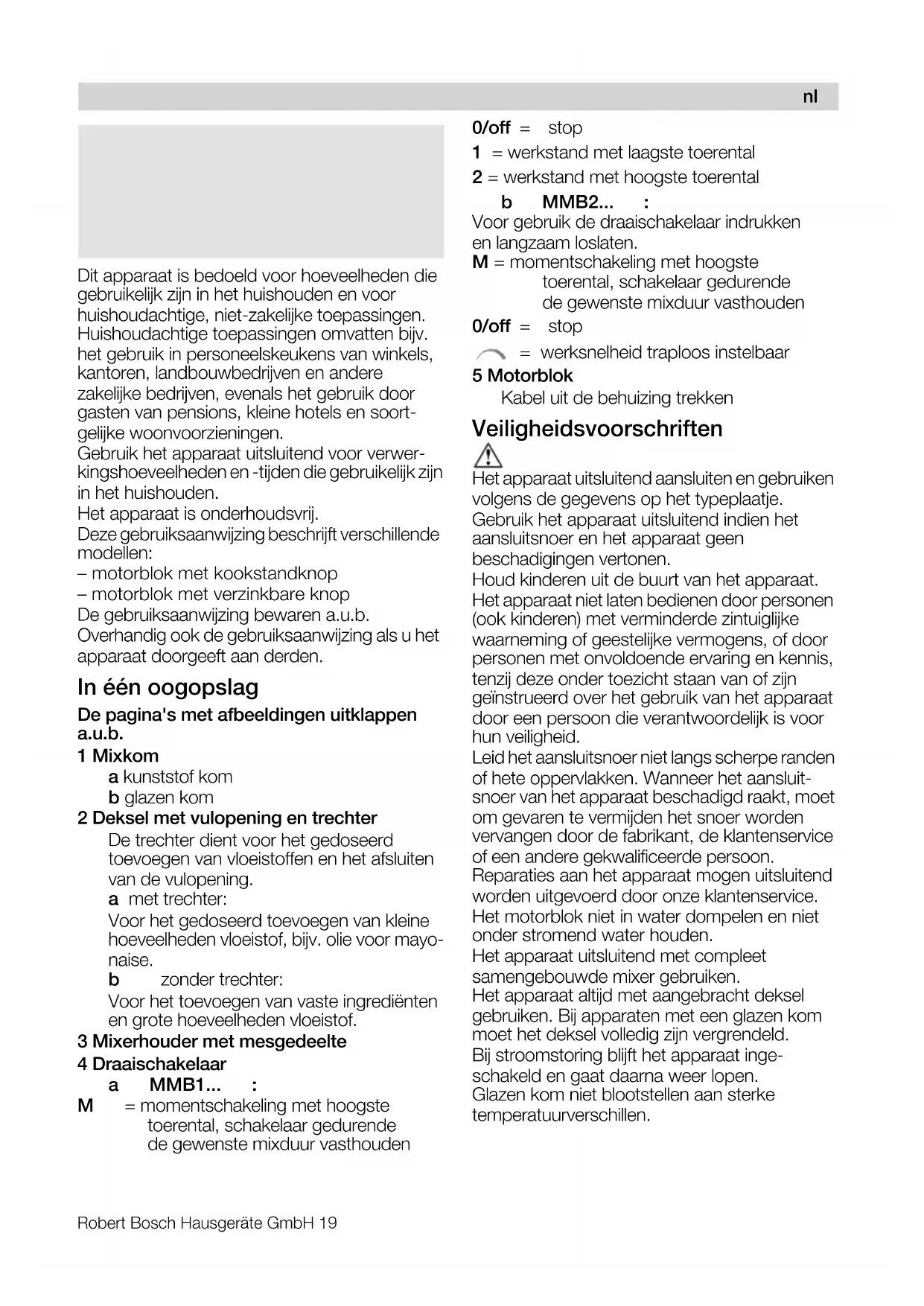 Con riserva di modifiche.Robert Bosch Hausgeräte GmbH 19 Dit apparaat is bedoeld voor hoeveelheden die gebruikelijk zijn in het huishouden en voor huishoudachtige, niet-zakelijke toepassingen. Huishoudachtige toepassingen omvatten bijv. het gebruik in personeelskeukens van winkels, kantoren, landbouwbedrijven en andere zakelijke bedrijven, evenals het gebruik door gasten van pensions, kleine hotels en soort- gelijke woonvoorzieningen. Gebruik het apparaat uitsluitend voor verwer- kingshoeveelheden en -tijden die gebruikelijk zijn in het huishouden. Het apparaat is onderhoudsvrij. Deze gebruiksaanwijzing beschrijft verschillende modellen: – motorblok met kookstandknop – motorblok met verzinkbare knop De gebruiksaanwijzing bewaren a.u.b. Overhandig ook de gebruiksaanwijzing als u het apparaat doorgeeft aan derden. In één oogopslag De pagina's met afbeeldingen uitklappen a.u.b. 1 Mixkom a kunststof kom b glazen kom 2 Deksel met vulopening en trechter De trechter dient voor het gedoseerd toevoegen van vloeistoffen en het afsluiten van de vulopening. a met trechter: Voor het gedoseerd toevoegen van kleine hoeveelheden vloeistof, bijv. olie voor mayo- naise. b zonder trechter: Voor het toevoegen van vaste ingrediënten en grote hoeveelheden vloeistof. 3 Mixerhouder met mesgedeelte 4 Draaischakelaar a MMB1... : M = momentschakeling met hoogste toerental, schakelaar gedurende de gewenste mixduur vasthouden 0/off = stop 1 = werkstand met laagste toerental 2 = werkstand met hoogste toerental b MMB2... : Voor gebruik de draaischakelaar indrukken en langzaam loslaten. M = momentschakeling met hoogste toerental, schakelaar gedurende de gewenste mixduur vasthouden 0/off = stop = werksnelheid traploos instelbaar 5 Motorblok Kabel uit de behuizing trekken Veiligheidsvoorschriften dÉî~~ê=î~å=ÉÉå=ÉäÉâíêáëÅÜÉ=ëÅÜçâ> Het apparaat uitsluitend aansluiten en gebruiken volgens de gegevens op het typeplaatje. Gebruik het apparaat uitsluitend indien het aansluitsnoer en het apparaat geen beschadigingen vertonen. Houd kinderen uit de buurt van het apparaat. Het apparaat niet laten bedienen door personen (ook kinderen) met verminderde zintuiglijke waarneming of geestelijke vermogens, of door personen met onvoldoende ervaring en kennis, tenzij deze onder toezicht staan van of zijn geïnstrueerd over het gebruik van het apparaat door een persoon die verantwoordelijk is voor hun veiligheid. Leid het aansluitsnoer niet langs scherpe randen of hete oppervlakken. Wanneer het aansluit- snoer van het apparaat beschadigd raakt, moet om gevaren te vermijden het snoer worden vervangen door de fabrikant, de klantenservice of een andere gekwalificeerde persoon. Reparaties aan het apparaat mogen uitsluitend worden uitgevoerd door onze klantenservice. Het motorblok niet in water dompelen en niet onder stromend water houden. Het apparaat uitsluitend met compleet samengebouwde mixer gebruiken. Het apparaat altijd met aangebracht deksel gebruiken. Bij apparaten met een glazen kom moet het deksel volledig zijn vergrendeld. Bij stroomstoring blijft het apparaat inge- schakeld en gaat daarna weer lopen. Glazen kom niet blootstellen aan sterke temperatuurverschillen.