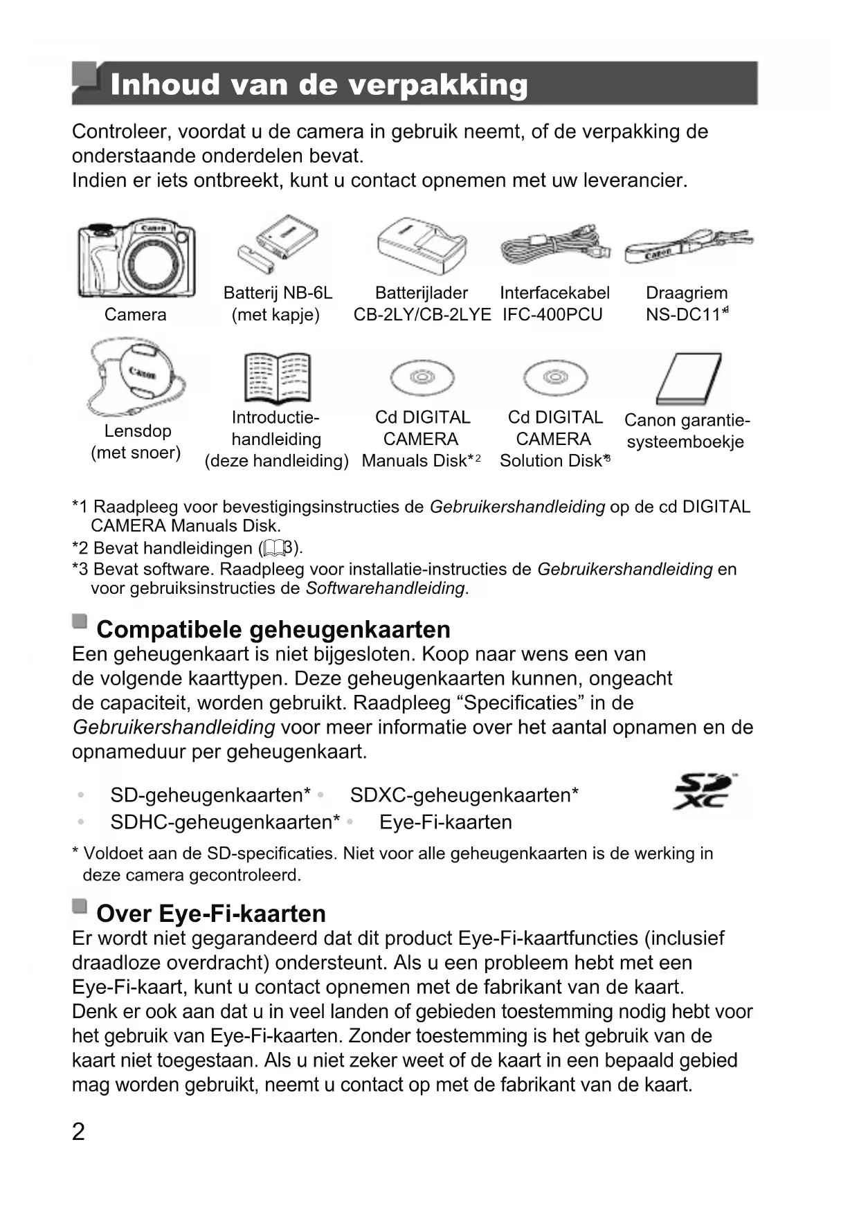 Canon garantie- systeemboekje *1 Raadpleeg voor bevestigingsinstructies de Gebruikershandleiding op de cd DIGITAL CAMERA Manuals Disk. *2 Bevat handleidingen (= 3). *3 Bevat software. Raadpleeg voor installatie-instructies de Gebruikershandleiding en voor gebruiksinstructies de Softwarehandleiding. Compatibele geheugenkaarten Een geheugenkaart is niet bijgesloten. Koop naar wens een van de volgende kaarttypen. Deze geheugenkaarten kunnen, ongeacht de capaciteit, worden gebruikt. Raadpleeg “Specicaties” in de Gebruikershandleiding voor meer informatie over het aantal opnamen en de opnameduur per geheugenkaart.