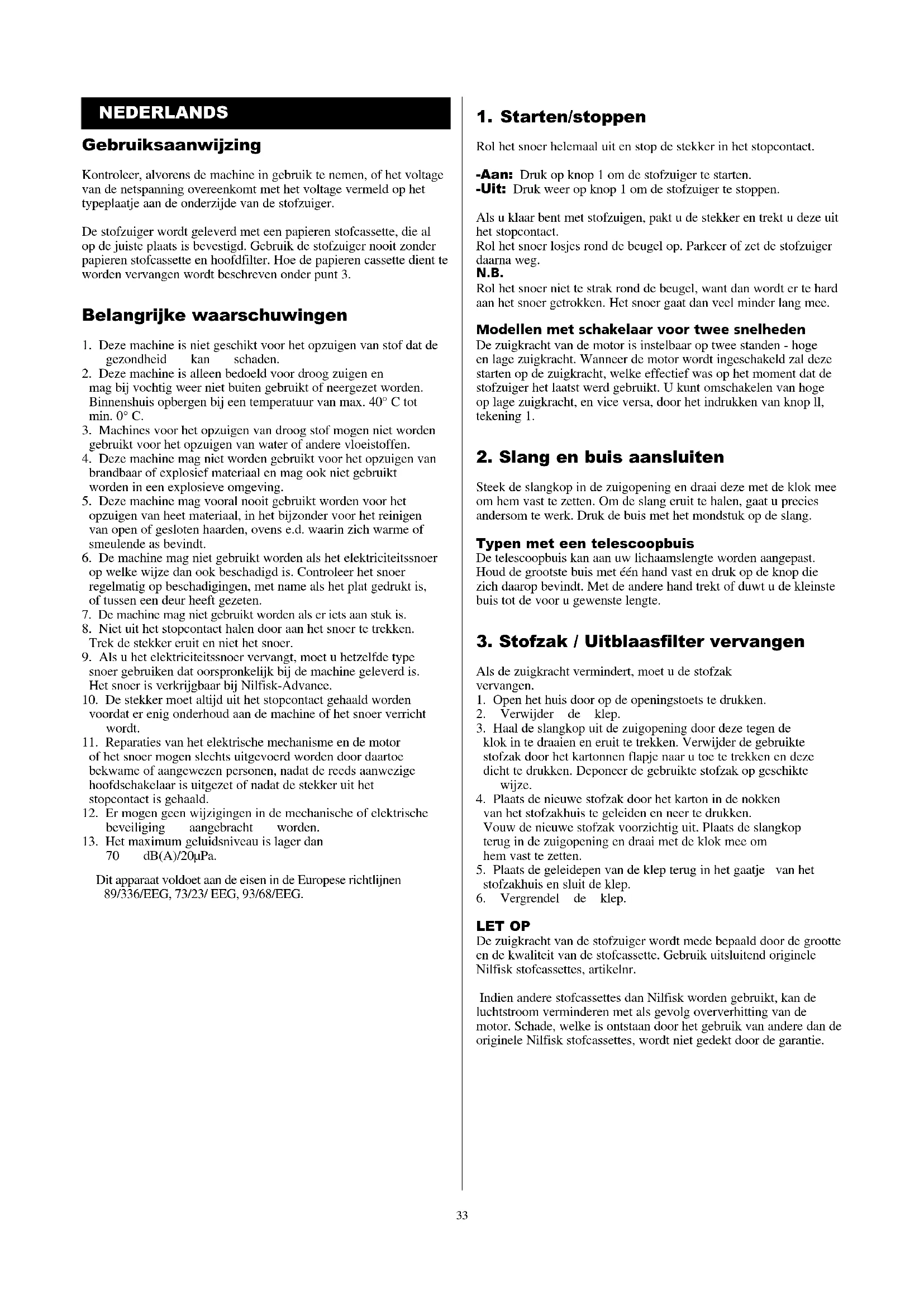 LET OP De zuigkracht van de stofzuiger wordt mede bepaald door de grootte en de kwaliteit van de stofcassette. Gebruik uitsluitend originele Nilfisk stofcassettes, artikelnr. Indien andere stofcassettes dan Nilfisk worden gebruikt, kan de luchtstroom verminderen met als gevolg oververhitting van de motor. Schade, welke is ontstaan door het gebruik van andere dan de originele Nilfisk stofcassettes, wordt niet gedekt door de garantie. NEDERLANDS Dit apparaat voldoet aan de eisen in de Europese richtlijnen