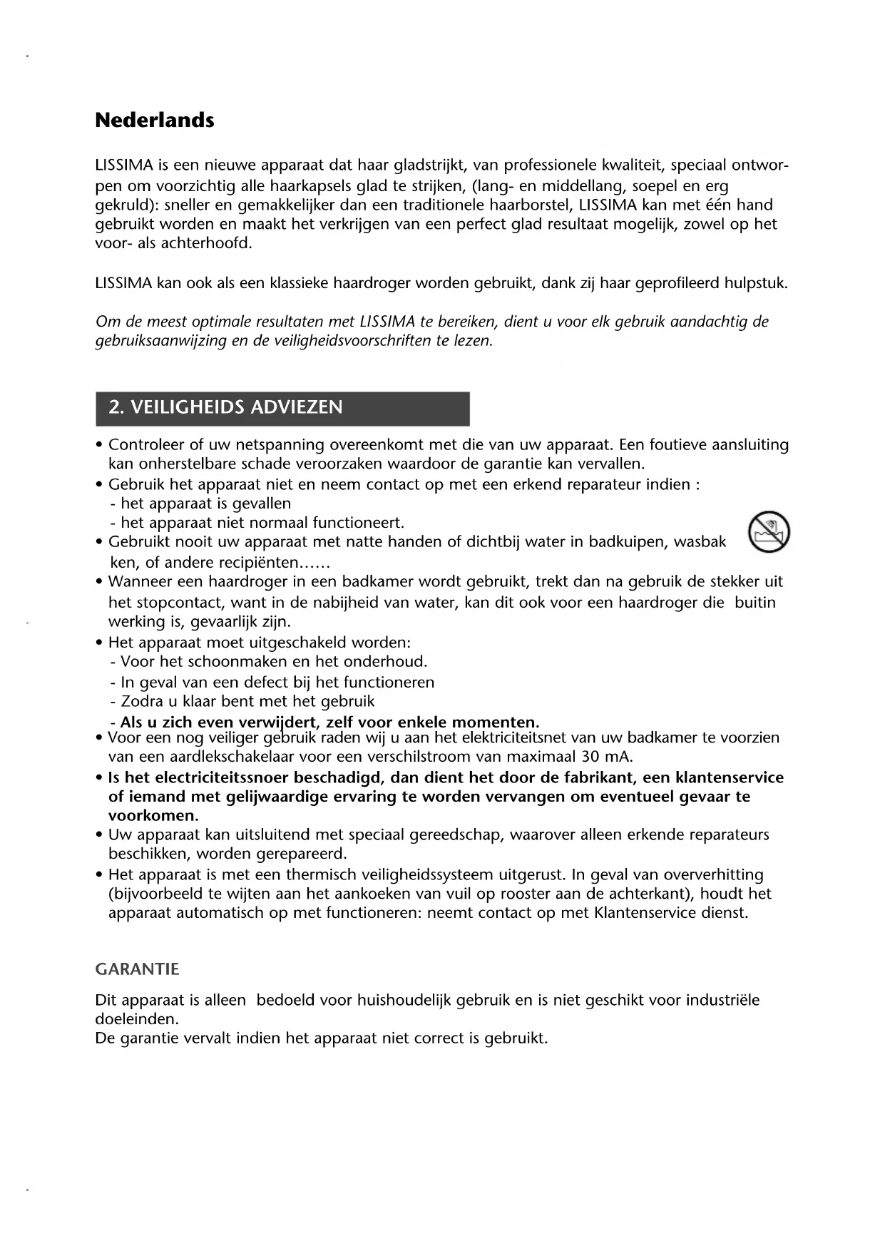 Français Nederlands 030138 LISSIMA 31/07/03 12:38 Page 2030138 LISSIMA 31/07/03 12:38 Page 3Nederlands LISSIMA is een nieuwe apparaat dat haar gladstrijkt, van professionele kwaliteit, speciaal ontwor- pen om voorzichtig alle haarkapsels glad te strijken, (lang- en middellang, soepel en erg gekruld): sneller en gemakkelijker dan een traditionele haarborstel, LISSIMA kan met één hand gebruikt worden en maakt het verkrijgen van een perfect glad resultaat mogelijk, zowel op het voor- als achterhoofd. LISSIMA kan ook als een klassieke haardroger worden gebruikt, dank zij haar geprofileerd hulpstuk. Om de meest optimale resultaten met LISSIMA te bereiken, dient u voor elk gebruik aandachtig de gebruiksaanwijzing en de veiligheidsvoorschriften te lezen.