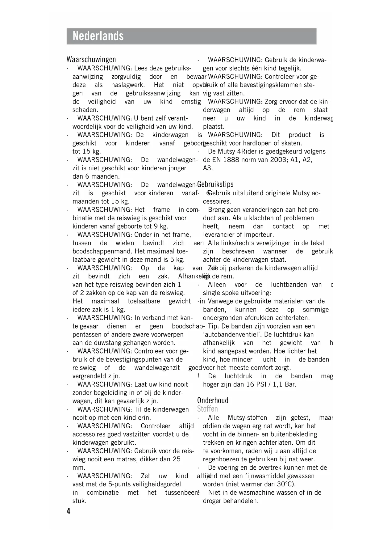 WAARSCHUWING: De kinderwagen is WAARSCHUWING: Dit product is geschikt voor kinderen vanaf geboortgeschikt voor hardlopen of skaten. tot 15 kg. De Mutsy 4Rider is goedgekeurd volgens