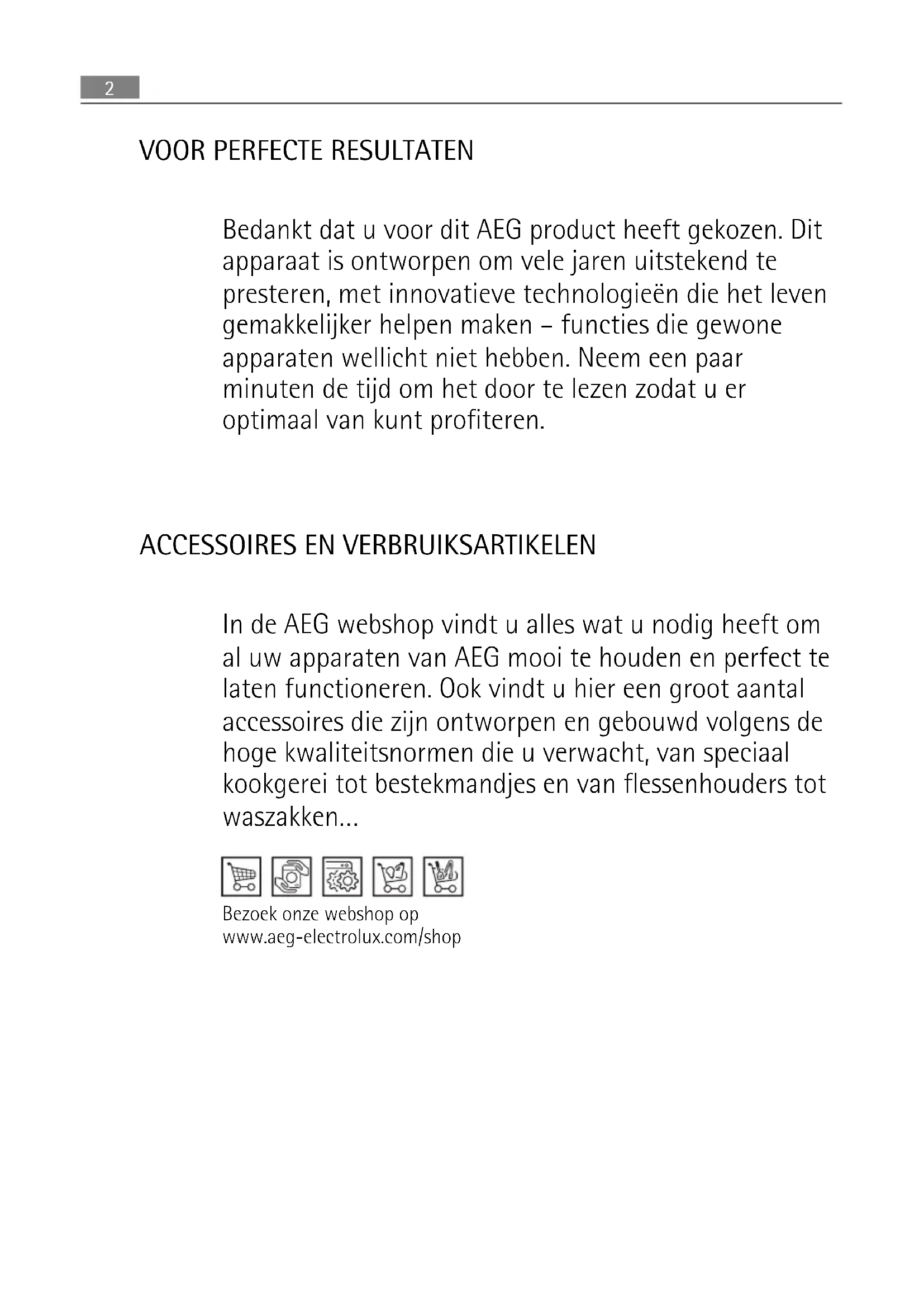 Bedankt dat u voor dit AEG product heeft gekozen. Dit apparaat is ontworpen om vele jaren uitstekend te presteren, met innovatieve technologieën die het leven gemakkelijker helpen maken – functies die gewone apparaten wellicht niet hebben. Neem een paar minuten de tijd om het door te lezen zodat u er optimaal van kunt profiteren.