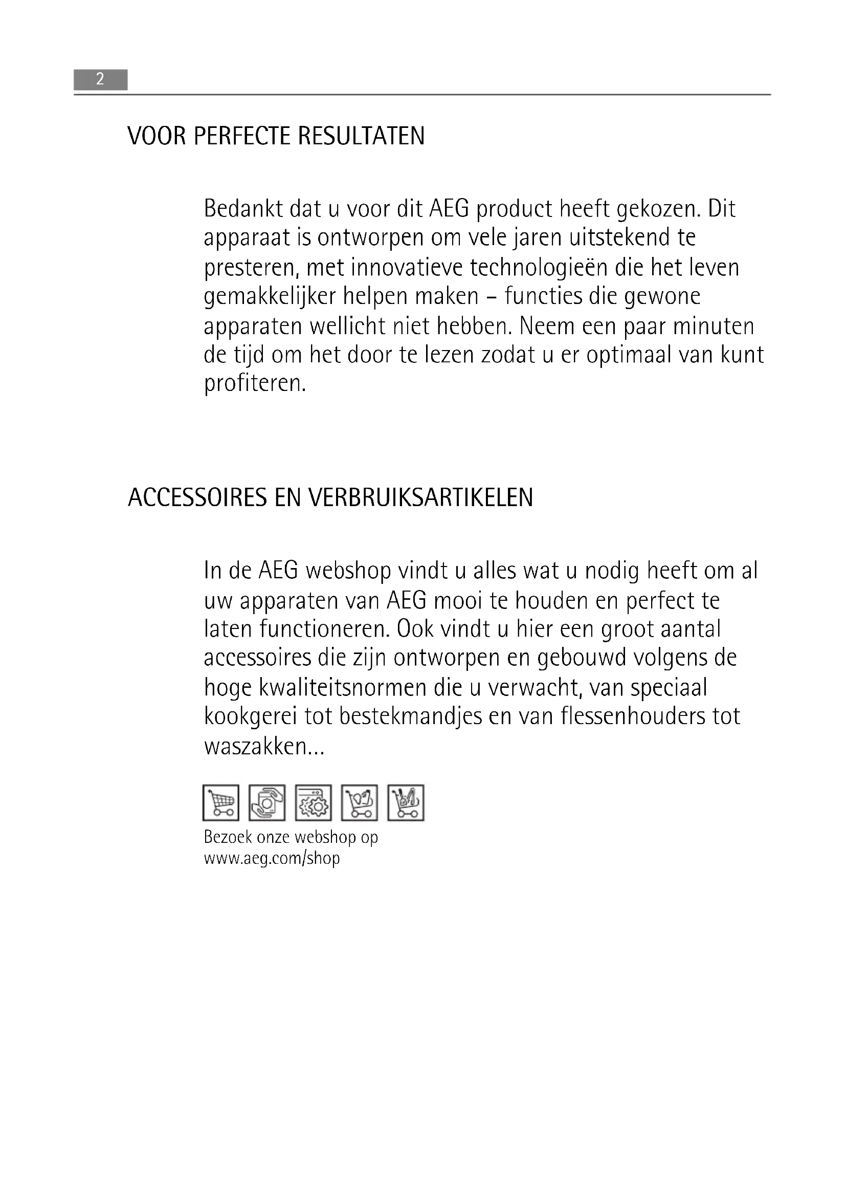 Bedankt dat u voor dit AEG product heeft gekozen. Dit apparaat is ontworpen om vele jaren uitstekend te presteren, met innovatieve technologieën die het leven gemakkelijker helpen maken – functies die gewone apparaten wellicht niet hebben. Neem een paar minuten de tijd om het door te lezen zodat u er optimaal van kunt profiteren.