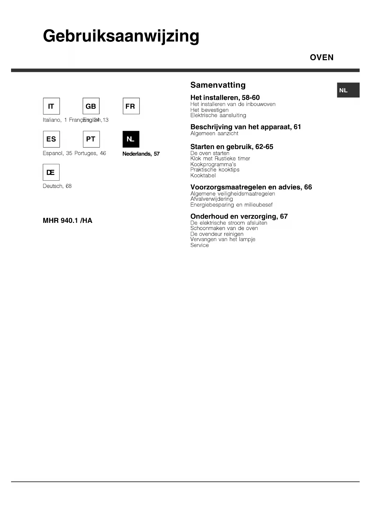 - o número de série (S/N); Estas últimas informações encontram-se na placa de identificação situada no aparelho.NL Gebruiksaanwijzing MHR 940.1 /HA Samenvatting Het installeren, 58-60 Het installeren van de inbouwoven Het bevestigen Elektrische aansluiting Beschrijving van het apparaat, 61 Algemeen aanzicht Starten en gebruik, 62-65 De oven starten Klok met Rustieke timer Kookprogramma’s Praktische kooktips Kooktabel Voorzorgsmaatregelen en advies, 66 Algemene veiligheidsmaatregelen Afvalverwijdering Energiebesparing en milieubesef Onderhoud en verzorging, 67 De elektrische stroom afsluiten Schoonmaken van de oven De ovendeur reinigen Vervangen van het lampje Service OVEN Italiano, 1 Français, 24 Espanol, 35 Portuges, 46 English,13
