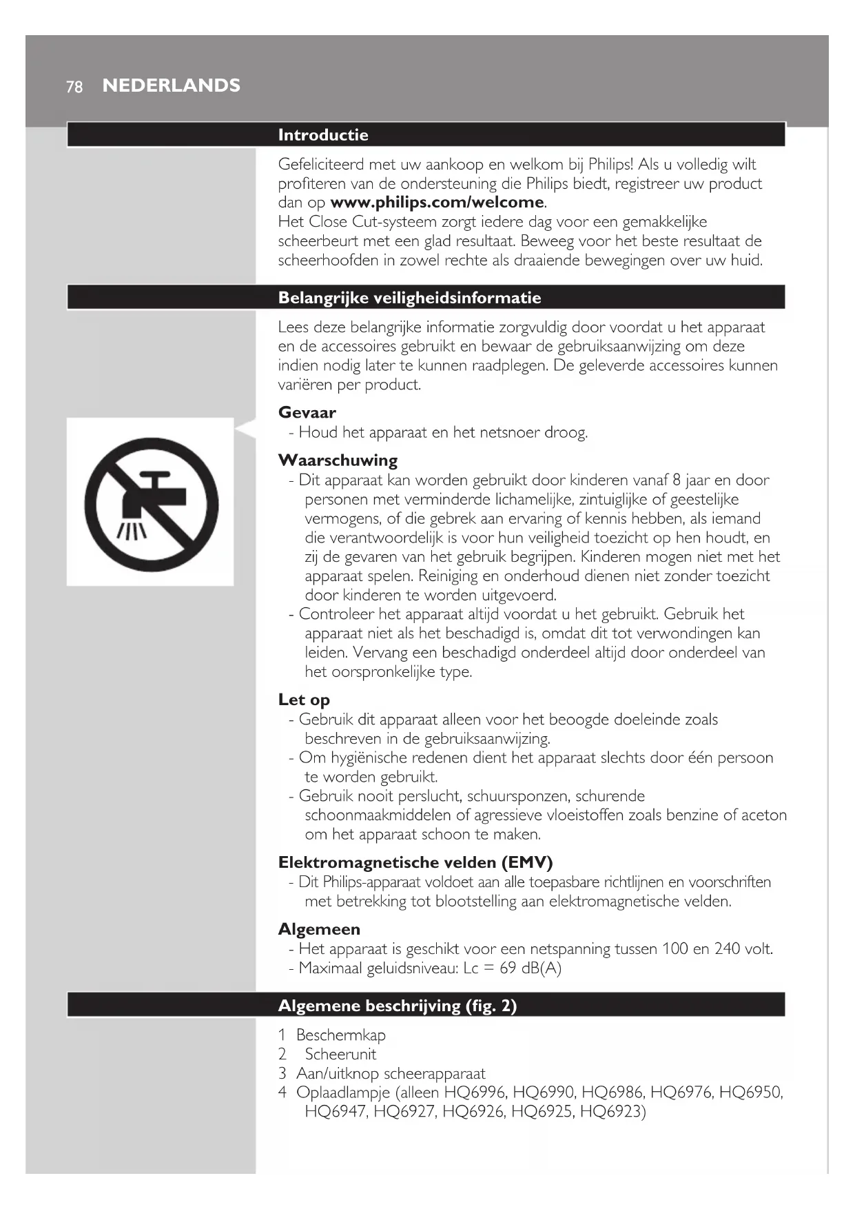 NEDERLANDS84Accessoires bestellen Ga naar www.shop.philips.com/service om accessoires en reserveonderdelen te kopen of ga naar uw Philips-dealer. U kunt ook contact opnemen met het Philips Consumer Care Centre in uw land (zie het ‘worldwide guarantee’-vouwblad voor contactgegevens). De volgende accessoires zijn verkrijgbaar: - HQ56 Philips-scheerhoofden - HQ110 Philips-scheerhoofdreinigingsspray Recycling - Dit symbool op een product betekent dat het product voldoet aan EU-richtlijn 2012/19/EU. - Dit symbool betekent dat het product een ingebouwde accu bevat die valt onder de EU-richtlijn 2006/66/EG en niet mag worden weggegooid bij het gewone huishoudelijke afval. We raden u sterk aan om uw product naar een ofcieel inzamelpunt of een Philips-servicecentrum te brengen om een vakman de accu te laten verwijderen. - Stel uzelf op de hoogte van de lokale wetgeving over gescheiden inzameling van afval van elektrische en elektronische producten en accu’s. Volg de lokale regels op en werp het product en de accu’s nooit samen met ander huisvuil weg. Als u oude producten en accu’s correct verwijdert, voorkomt u negatieve gevolgen voor het milieu en de volksgezondheid. De accu verwijderen Verwijder de accu alleen wanneer u het scheerapparaat afdankt. Zorg ervoor dat de accu helemaal leeg is wanneer u deze verwijdert. 1 Schakel het scheerapparaat uit. Haal de stekker uit het stopcontact en trek het apparaatstekkertje uit het scheerapparaat. 2 Laat het scheerapparaat lopen totdat het vanzelf stopt. 3 Verwijder de schroeven aan de achterkant van het scheerapparaat en maak het apparaat open. 4 Snijd de accustrips door met een mesje en trek de accu los van de gelijmde strip. De metalen accustrips zijn zeer scherp. Sluit het scheerapparaat niet meer aan op netspanning nadat u de accu hebt verwijderd. NEDERLANDS 85Garantie en ondersteuning Als u informatie of ondersteuning nodig hebt, ga dan naar www.philips.com/ support of lees het ‘worldwide guarantee’-vouwblad. Garantiebeperkingen De scheerhoofden (mesjes en kapjes) vallen niet onder de voorwaarden van de internationale garantie omdat deze onderhevig zijn aan slijtage. Problemen oplossen Dit hoofdstuk behandelt in het kort de problemen die u kunt tegenkomen tijdens het gebruik van het apparaat. Als u het probleem niet kunt oplossen met de informatie hieronder, ga dan naar www.philips.com/support voor een lijst met veelgestelde vragen of neem contact op met het Consumer Care Centre in uw land. Probleem Mogelijke oorzaak Oplossing Het scheerresultaat gaat achteruit. De scheerhoofden zijn vuil. U hebt het scheerapparaat niet goed genoeg schoongemaakt of u hebt het lange tijd niet schoongemaakt. Maak het apparaat grondig schoon voordat u zich er weer mee gaat scheren. Zie hoofdstuk ‘Schoonmaken en onderhoud’. Er zitten lange haren in de scheerhoofden. Maak de mesjes en kapjes schoon met het bijgeleverde schoonmaakborsteltje. Zie ‘Iedere maand: scheerhoofden’ in hoofdstuk ‘Schoonmaken en onderhoud’. De scheerhoofden zijn beschadigd of versleten. Vervang de scheerhoofden om de 2 jaar voor optimale scheerresultaten. Zie hoofdstuk ‘Vervangen’. Het scheerapparaat werkt niet wanneer ik de aan/ uitknop omhoog schuif. De accu is leeg. Laad de accu op. Zie hoofdstuk ‘Opladen’. Het scheerapparaat is niet op netspanning aangesloten. Steek de stekker in het stopcontact. Huidirritatie. Uw huid heeft tijd nodig om te wennen aan het Philips- scheersysteem. Tijdens de eerste 2-3 weken dat u het apparaat gebruikt is huidirritatie normaal. Na deze periode verdwijnt de huidirritatie meestal. NEDERLANDS8687 Innledning Gratulerer med kjøpet og velkommen til Philips! Du får best mulig nytte av støtten som Philips tilbyr, hvis du registrerer produktet ditt på www.philips.com/welcome. Close Cut-systemet sørger for en tett og enkel barbering hver dag. Du oppnår best resultat hvis du beveger skjærehodene over huden med både rette og sirkulære bevegelser. Viktig sikkerhetsinformasjon Les denne viktige informasjonen nøye før du bruker apparatet og tilbehøret, og ta vare på den for senere referanse. Tilbehøret som følger med, kan variere fra produkt til produkt. Fare - Sørg for å holde apparatet og ledningen tørre. Advarsel - Dette apparatet kan brukes av barn over 8 år og av personer som har nedsatt sanseevne eller fysisk eller psykisk funksjonsevne, eller personer med manglende erfaring eller kunnskap, dersom de får tilsyn eller instruksjoner om bruk av apparatet på en sikker måte og forstår risikoen. Barn ikke skal leke med apparatet. Rengjøring og brukervedlikehold skal ikke utføres av barn uten tilsyn. - Kontroller alltid apparatet før du bruker det. Ikke bruk apparatet hvis det er skadet. Det kan føre til personskade. Bytt alltid ut en ødelagt del med tilsvarende originaldel. Forsiktig - Bruk bare dette apparatet til beregnet formål som vist i brukerhåndboken. - Apparatet bør bare brukes av én person av hygieniske årsaker. - Ikke bruk trykkluft, skurebørster, skuremidler eller væsker som bensin eller aceton for å rengjøre apparatet. Elektromagnetiske felt (EMF) - Dette Philips apparatet overholder alle aktuelle standarder og forskrifter for eksponering for elektromagnetiske felt. Generelt - Apparatet kan brukes med nettspenninger fra 100 til 240 volt. - Maksimalt støynivå: Lc = 69 dB(A) Generell beskrivelse (g. 2) 1 Beskyttelsesdeksel 2 Skjæreenhet 3 Av/på-bryter for barbermaskin 4 Ladelampe (kun HQ6996, HQ6990, HQ6986, HQ6976, HQ6950, HQ6947, HQ6927, HQ6926, HQ6925, HQ6923) 5 Trimmer (kun HQ6996, HQ6990, HQ6976, HQ6950, HQ6946) 6 Trimmerbryter (kun HQ6996, HQ6990, HQ6976, HQ6950, HQ6946) 7 Rengjøringsbørste 8 Ledning med støpsel 9 Apparatstøpsel NORSKLading Lad barbermaskinen - før første gangs bruk og når du ikke har brukt den på en stund - når motoren stanser eller begynner å gå saktere Slik får du den beste batterikapasiteten når du har ladet barbermaskinen for første gang, og når den 