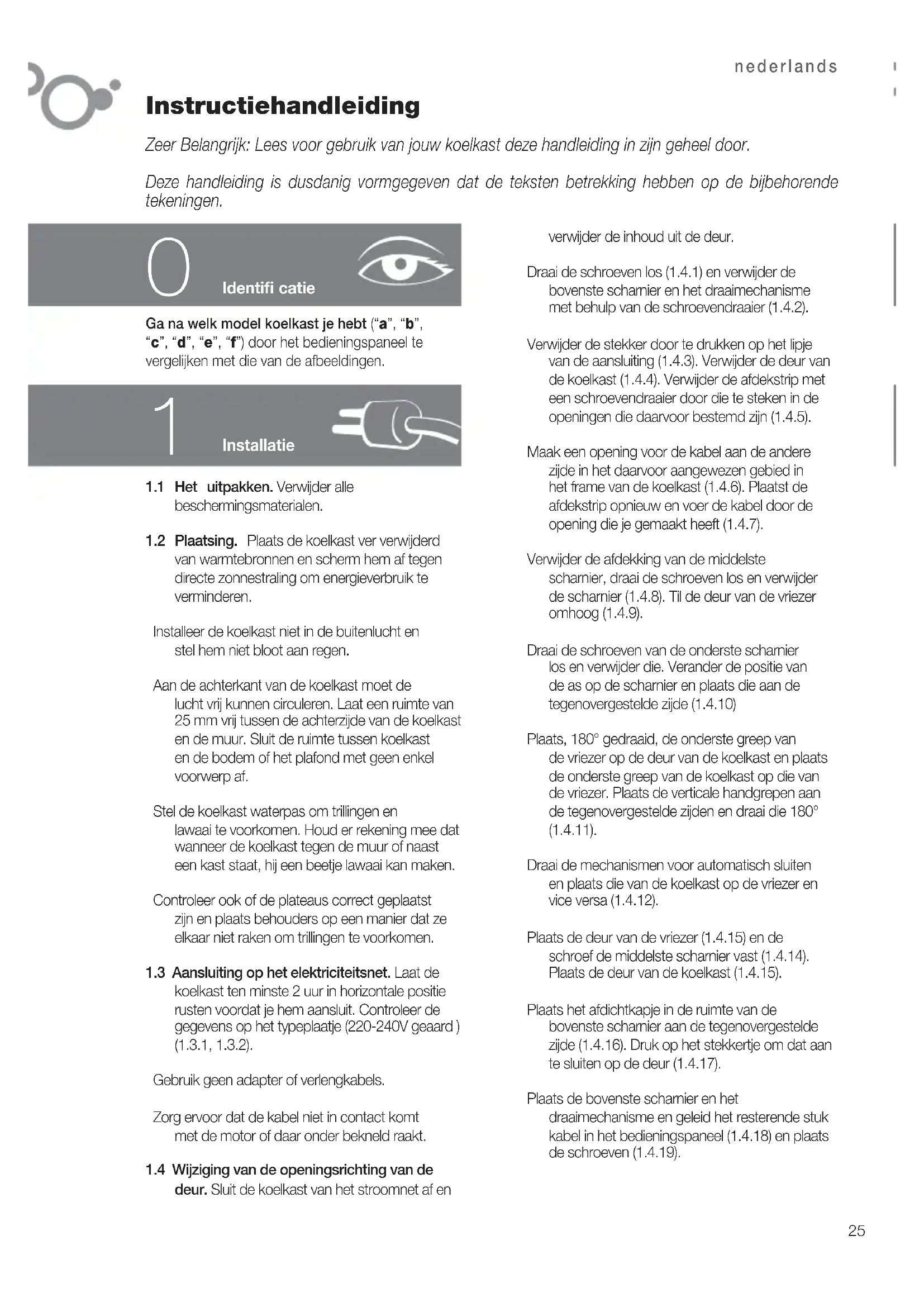 Identifi catie verwijder de inhoud uit de deur. Draai de schroeven los (1.4.1) en verwijder de bovenste scharnier en het draaimechanisme met behulp van de schroevendraaier (1.4.2). Verwijder de stekker door te drukken op het lipje van de aansluiting (1.4.3). Verwijder de deur van de koelkast (1.4.4). Verwijder de afdekstrip met een schroevendraaier door die te steken in de openingen die daarvoor bestemd zijn (1.4.5). Maak een opening voor de kabel aan de andere zijde in het daarvoor aangewezen gebied in het frame van de koelkast (1.4.6). Plaatst de afdekstrip opnieuw en voer de kabel door de opening die je gemaakt heeft (1.4.7). Verwijder de afdekking van de middelste scharnier, draai de schroeven los en verwijder de scharnier (1.4.8). Til de deur van de vriezer omhoog (1.4.9). Draai de schroeven van de onderste scharnier los en verwijder die. Verander de positie van de as op de scharnier en plaats die aan de tegenovergestelde zijde (1.4.10) Plaats, 180° gedraaid, de onderste greep van de vriezer op de deur van de koelkast en plaats de onderste greep van de koelkast op die van de vriezer. Plaats de verticale handgrepen aan de tegenovergestelde zijden en draai die 180° (1.4.11). Draai de mechanismen voor automatisch sluiten en plaats die van de koelkast op de vriezer en vice versa (1.4.12). Plaats de deur van de vriezer (1.4.15) en de schroef de middelste scharnier vast (1.4.14). Plaats de deur van de koelkast (1.4.15). Plaats het afdichtkapje in de ruimte van de bovenste scharnier aan de tegenovergestelde zijde (1.4.16). Druk op het stekkertje om dat aan te sluiten op de deur (1.4.17). Plaats de bovenste scharnier en het draaimechanisme en geleid het resterende stuk kabel in het bedieningspaneel (1.4.18) en plaats de schroeven (1.4.19).nederlands