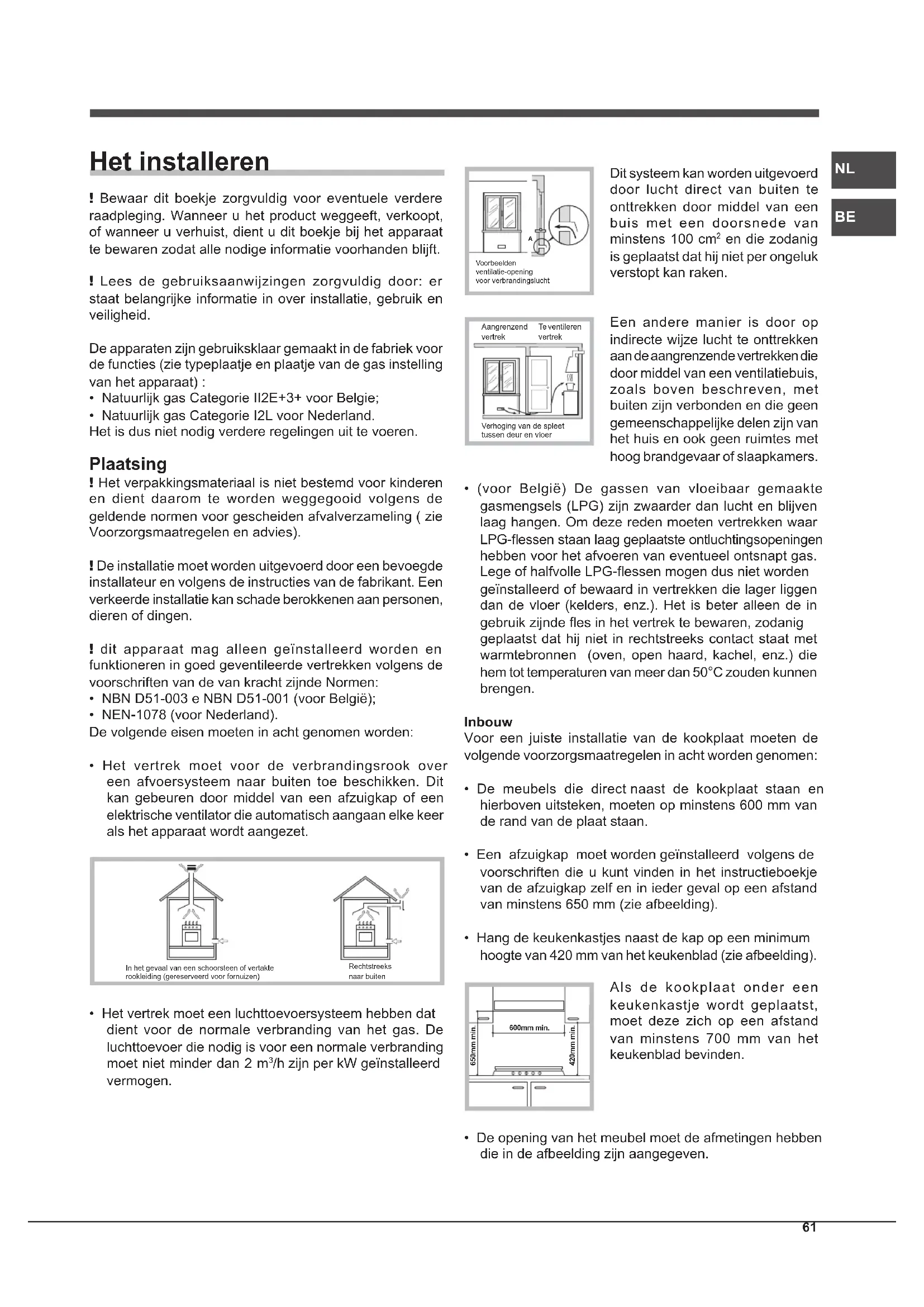 - (voor België) De gassen van vloeibaar gemaakte gasmengsels (LPG) zijn zwaarder dan lucht en blijven laag hangen. Om deze reden moeten vertrekken waar LPG-essen staan laag geplaatste ontluchtingsopeningen hebben voor het afvoeren van eventueel ontsnapt gas. Lege of halfvolle LPG-essen mogen dus niet worden geïnstalleerd of bewaard in vertrekken die lager liggen dan de vloer (kelders, enz.). Het is beter alleen de in gebruik zijnde es in het vertrek te bewaren, zodanig geplaatst dat hij niet in rechtstreeks contact staat met warmtebronnen (oven, open haard, kachel, enz.) die hem tot temperaturen van meer dan 50°C zouden kunnen brengen. Inbouw Voor een juiste installatie van de kookplaat moeten de volgende voorzorgsmaatregelen in acht worden genomen: