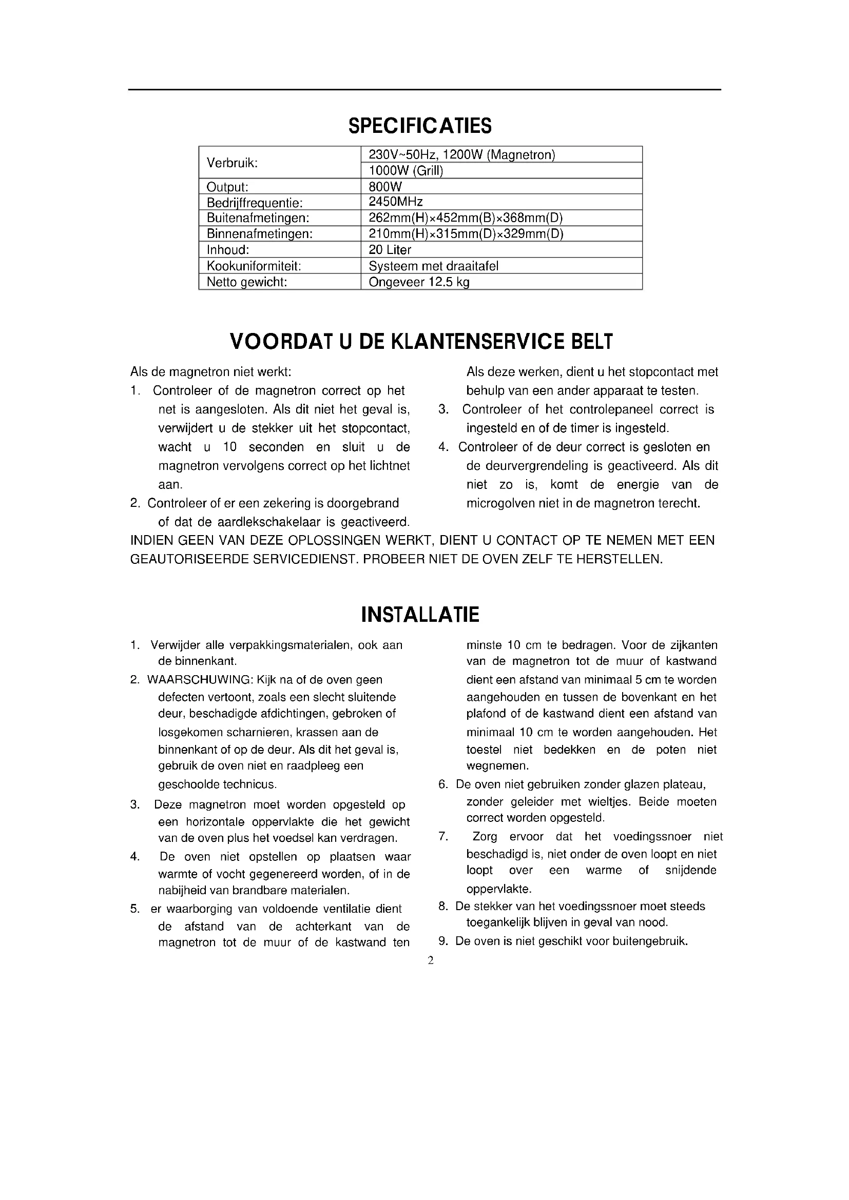 de deurvergrendeling is geactiveerd. Als dit niet zo is, komt de energie van de microgolven niet in de magnetron terecht. INDIEN GEEN VAN DEZE OPLOSSINGEN WERKT, DIENT U CONTACT OP TE NEMEN MET EEN GEAUTORISEERDE SERVICEDIENST. PROBEER NIET DE OVEN ZELF TE HERSTELLEN. INSTALLATIE