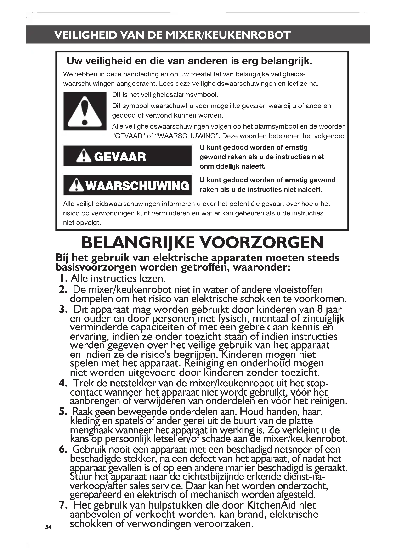 PRObLEEmOPLOSSING ..................................................................................... 63 GaRaNTIE EN SERVICE Garantie voor KitchenAid mixer/keukenrobot ................................................. 64 Klantencontact .................................................................................................. 64 Inhoudstafel W10648168A_05_NL.indd 53 1/29/14 3:14 PM54 VEILIGHEID VAN DE MIXER/KEUKENROBOTVEILIGHEID VAN DE MIXER/KEUKENROBOT Uw veiligheid en die van anderen is erg belangrijk. We hebben in deze handleiding en op uw toestel tal van belangrijke veiligheids- waarschuwingen aangebracht. Lees deze veiligheidswaarschuwingen en leef ze na. Dit is het veiligheidsalarmsymbool. Dit symbool waarschuwt u voor mogelijke gevaren waarbij u of anderen gedood of verwond kunnen worden. Alle veiligheidswaarschuwingen volgen op het alarmsymbool en de woorden “GEVAAR” of “WAARSCHUWING”. Deze woorden betekenen het volgende: U kunt gedood worden of ernstig gewond raken als u de instructies niet onmiddellijk naleeft. U kunt gedood worden of ernstig gewond raken als u de instructies niet naleeft. Alle veiligheidswaarschuwingen informeren u over het potentiële gevaar, over hoe u het risico op verwondingen kunt verminderen en wat er kan gebeuren als u de instructies niet opvolgt. GEVAAR WAARSCHUWING BELANGRIJKE VOORZORGEN Bij het gebruik van elektrische apparaten moeten steeds basisvoorzorgen worden getroffen, waaronder: