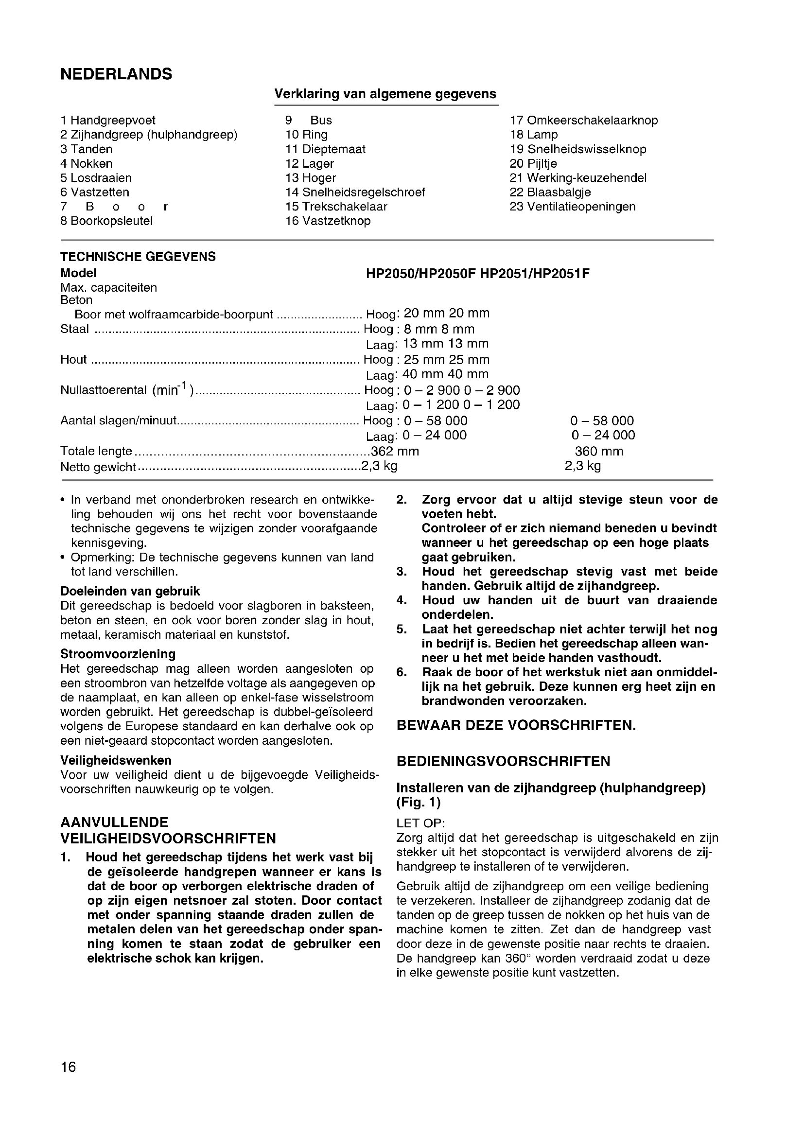 lijk na het gebruik. Deze kunnen erg heet zijn en brandwonden veroorzaken. BEWAAR DEZE VOORSCHRIFTEN. BEDIENINGSVOORSCHRIFTEN Installeren van de zijhandgreep (hulphandgreep) (Fig. 1) LET OP: Zorg altijd dat het gereedschap is uitgeschakeld en zijn stekker uit het stopcontact is verwijderd alvorens de zij- handgreep te installeren of te verwijderen. Gebruik altijd de zijhandgreep om een veilige bediening te verzekeren. Installeer de zijhandgreep zodanig dat de tanden op de greep tussen de nokken op het huis van de machine komen te zitten. Zet dan de handgreep vast door deze in de gewenste positie naar rechts te draaien. De handgreep kan 360° worden verdraaid zodat u deze in elke gewenste positie kunt vastzetten.17 Installeren of verwijderen van de boor (Fig. 2 en 3) LET OP: Controleer altijd of het gereedschap is uitgeschakeld en zijn stekker uit het stopcontact is verwijderd alvorens de boor aan te brengen of te verwijderen. Voor HP2050 en HP2050F Om de boor te installeren, steekt u deze zo ver mogelijk in de boorkop. Draai de boorkop met de hand vast. Steek dan de boorkopsleutel in elk van de drie gaten en draai naar rechts vast. Zorg ervoor dat u de drie boorkopgaten gelijkmatig aandraait. Om de boor te verwijderen, draait u de boorkopsleutel in één van de gaten naar links en dan draait u de boorkop verder los met de hand. Breng de boorkopsleutel na gebruik weer in zijn oorspronkelijke positie aan. Voor HP2051 en HP2051F Houd de ring op zijn plaats en draai de bus naar links om de boorkopklauwen te openen. Steek de boor zo ver mogelijk in de boorkop. Houd daarna de ring stevig op zijn plaats en draai de bus naar rechts om de boorkop vast te zetten. Om de boor te verwijderen, houdt u de ring op zijn plaats en draait u de bus naar links. Diepteaanslag (Fig. 4) De diepteaanslag is handig voor het boren van gaten van gelijke diepte. Maak de zijhandgreep los en steek de diepteaanslag in het gat in de handgreepvoet. Stel de diepteaanslag af op de gewenste diepte en zet de zij- handgreep vast. OPMERKING: De diepteaanslag kan niet worden gebruikt in de positie waarbij deze tegen het tandwielhuis aanstoot. Werking van de trekschakelaar (Fig. 5) LET OP: Alvorens de machine op een stopcontact aan te sluiten, moet u altijd controleren of de trekschakelaar juist werkt en bij het loslaten naar de “OFF” positie terugkeert. Om de machine te starten, drukt u gewoon de trekscha- kelaar in. Hoe dieper de trekschakelaar wordt ingedrukt, hoe sneller de machine draait. Om de machine uit te schakelen, de trekschakelaar loslaten. Voor continuë werking, drukt u de trekschakelaar in en dan drukt u de vastzetknop in. Om de machine vanuit deze vergren- delde stand te stoppen, de trekschakelaar volledig indrukken en deze dan loslaten. Een snelheidsregelschroef is voorzien zodat de maxi- male draaisnelheid (variabel) kan worden beperkt. Draai deze schroef naar rechts voor een hogere snelheid, of naar links voor een lagere snelheid. Aanzetten van de lampen (HP2050F en HP2051F) LET OP: Kijk niet direct in het licht of de lichtbron. Druk de trekker in om de lamp aan te zetten. Laat de trekker los om de lamp uit te doen. OPMERKING: Gebruik een droge doek om vuil op de lamplens eraf te vegen. Let op dat u geen krassen maakt op de lamplens, aangezien de verlichtingssterkte daardoor zal verminde- ren. Werking van de omkeerschakelaar (Fig. 6) Dit gereedschap heeft een omkeerschakelaar voor het veranderen van de draairichting. Schuif de omkeerscha- kelaar naar de positie
