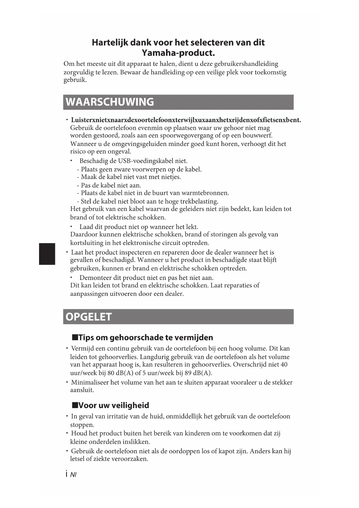 Hartelijk dank voor het selecteren van dit Yamaha-product. Om het meeste uit dit apparaat te halen, dient u deze gebruikershandleiding zorgvuldig te lezen. Bewaar de handleiding op een veilige plek voor toekomstig gebruik. WAARSCHUWING x Luisterxnietxnaarxdexoortelefoonxterwijlxuxaanxhetxrijdenxofxfietsenxbent. Gebruik de oortelefoon evenmin op plaatsen waar uw gehoor niet mag worden gestoord, zoals aan een spoorwegovergang of op een bouwwerf. Wanneer u de omgevingsgeluiden minder goed kunt horen, verhoogt dit het risico op een ongeval. x Beschadig de USB-voedingskabel niet. - Plaats geen zware voorwerpen op de kabel. - Maak de kabel niet vast met nietjes. - Pas de kabel niet aan. - Plaats de kabel niet in de buurt van warmtebronnen. - Stel de kabel niet bloot aan te hoge trekbelasting. Het gebruik van een kabel waarvan de geleiders niet zijn bedekt, kan leiden tot brand of tot elektrische schokken. x Laad dit product niet op wanneer het lekt. Daardoor kunnen elektrische schokken, brand of storingen als gevolg van kortsluiting in het elektronische circuit optreden. x Laat het product inspecteren en repareren door de dealer wanneer het is gevallen of beschadigd. Wanneer u het product in beschadigde staat blijft gebruiken, kunnen er brand en elektrische schokken optreden. x Demonteer dit product niet en pas het niet aan. Dit kan leiden tot brand en elektrische schokken. Laat reparaties of aanpassingen uitvoeren door een dealer. OPGELET ■ Tips om gehoorschade te vermijden x Vermijd een continu gebruik van de oortelefoon bij een hoog volume. Dit kan leiden tot gehoorverlies. Langdurig gebruik van de oortelefoon als het volume van het apparaat hoog is, kan resulteren in gehoorverlies. Overschrijd niet 40 uur/week bij 80 dB(A) of 5 uur/week bij 89 dB(A). x Minimaliseer het volume van het aan te sluiten apparaat vooraleer u de stekker aansluit. ■ Voor uw veiligheid x In geval van irritatie van de huid, onmiddellijk het gebruik van de oortelefoon stoppen. x Houd het product buiten het bereik van kinderen om te voorkomen dat zij kleine onderdelen inslikken. x Gebruik de oortelefoon niet als de oordoppen los of kapot zijn. Anders kan hij letsel of ziekte veroorzaken.ii