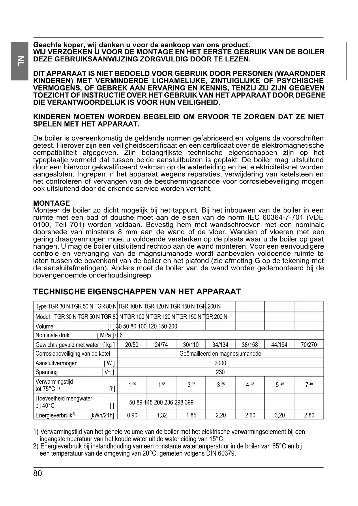 Geachte koper, wij danken u voor de aankoop van ons product. WIJ VERZOEKEN U VOOR DE MONTAGE EN HET EERSTE GEBRUIK VAN DE BOILER DEZE GEBRUIKSAANWIJZING ZORGVULDIG DOOR TE LEZEN. DIT APPARAAT IS NIET BEDOELD VOOR GEBRUIK DOOR PERSONEN (WAARONDER KINDEREN) MET VERMINDERDE LICHAMELIJKE, ZINTUIGLIJKE OF PSYCHISCHE VERMOGENS, OF GEBREK AAN ERVARING EN KENNIS, TENZIJ ZIJ ZIJN GEGEVEN TOEZICHT OF INSTRUCTIE OVER HET GEBRUIK VAN HET APPARAAT DOOR DEGENE DIE VERANTWOORDELIJK IS VOOR HUN VEILIGHEID. KINDEREN MOETEN WORDEN BEGELEID OM ERVOOR TE ZORGEN DAT ZE NIET SPELEN MET HET APPARAAT. De boiler is overeenkomstig de geldende normen gefabriceerd en volgens de voorschriften getest. Hierover zijn een veiligheidscertifi caat en een certifi caat over de elektromagnetische compatibiliteit afgegeven. Zijn belangrijkste technische eigenschappen zijn op het typeplaatje vermeld dat tussen beide aansluitbuizen is geplakt. De boiler mag uitsluitend door een hiervoor gekwalifi ceerd vakman op de waterleiding en het elektriciteitsnet worden aangesloten. Ingrepen in het apparaat wegens reparaties, verwijdering van ketelsteen en het controleren of vervangen van de beschermingsanode voor corrosiebeveiliging mogen ook uitsluitend door de erkende service worden verricht. MONTAGE Monteer de boiler zo dicht mogelijk bij het tappunt. Bij het inbouwen van de boiler in een ruimte met een bad of douche moet aan de eisen van de norm IEC 60364-7-701 (VDE 0100, Teil 701) worden voldaan. Bevestig hem met wandschroeven met een nominale doorsnede van minstens 8 mm aan de wand of de vloer. Wanden of vloeren met een gering draagvermogen moet u voldoende versterken op de plaats waar u de boiler op gaat hangen. U mag de boiler uitsluitend rechtop aan de wand monteren. Voor een eenvoudigere controle en vervanging van de magnsiumanode wordt aanbevolen voldoende ruimte te laten tussen de bovenkant van de boiler en het plafond (zie afmeting G op de tekening met de aansluitafmetingen). Anders moet de boiler van de wand worden gedemonteerd bij de bovengenoemde onderhoudsingreep.