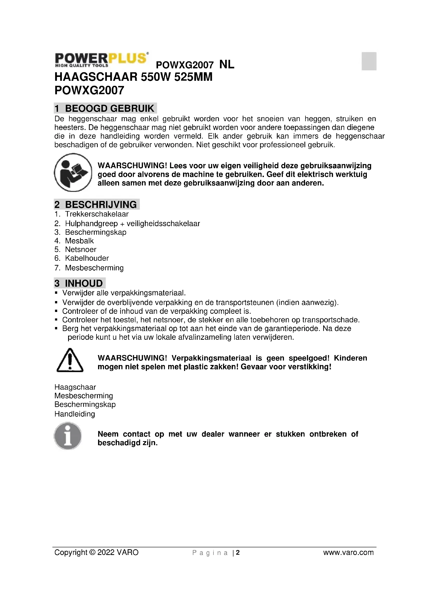 - Berg het verpakkingsmateriaal op tot aan het einde van de garantieperiode. Na deze periode kunt u het via uw lokale afvalinzameling laten verwijderen. WAARSCHUWING! Verpakkingsmateriaal is geen speelgoed! Kinderen mogen niet spelen met plastic zakken! Gevaar voor verstikking! Haagschaar Mesbescherming Beschermingskap Handleiding Neem contact op met uw dealer wanneer er stukken ontbreken of beschadigd zijn.POWXG2007 NL Copyright © 2022 VARO P a g i n a | 3 www.varo.com