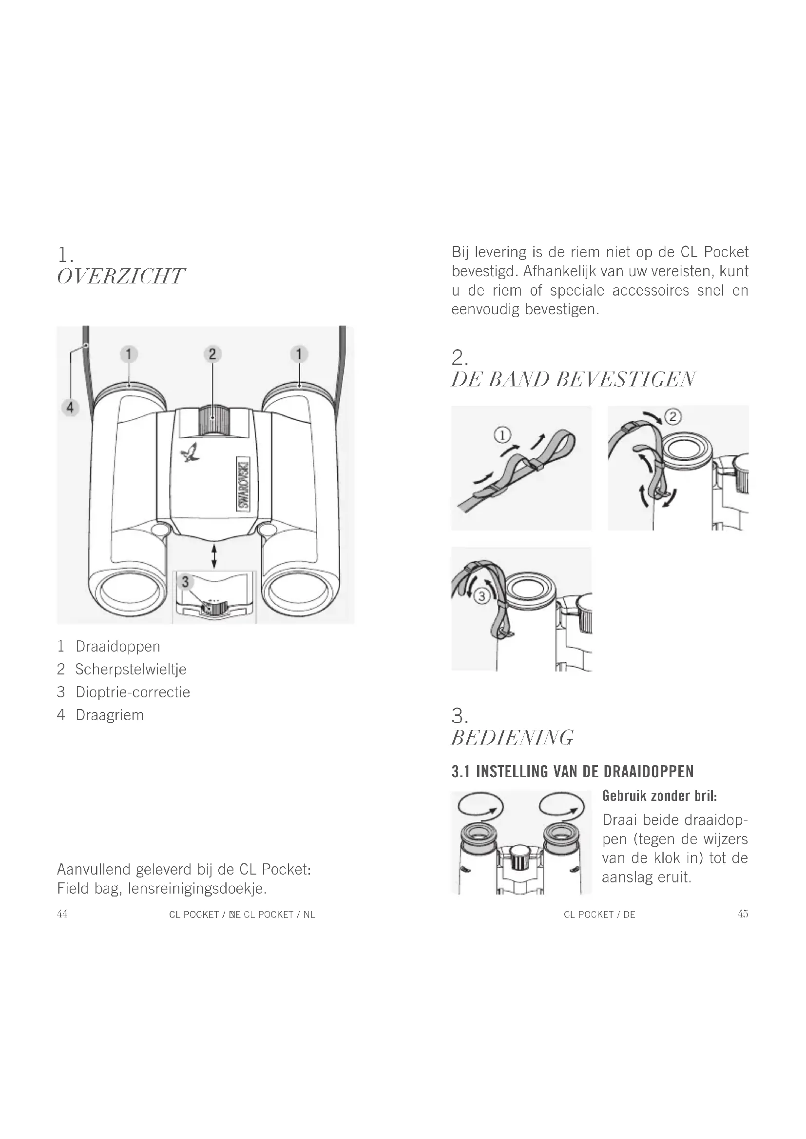 BEDIENING 1 Draaidoppen 2 Scherpstelwieltje 3 Dioptrie-correctie 4 Draagriem
