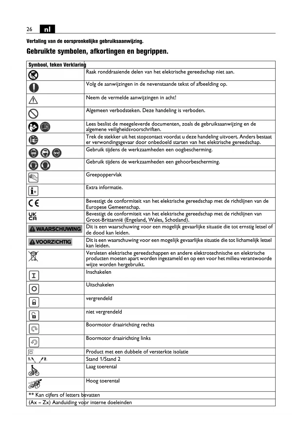 Vertaling van de oorspronkelijke gebruiksaanwijzing. Gebruikte symbolen, afkortingen en begrippen. Symbool, teken Verklaring Raak ronddraaiende delen van het elektrische gereedschap niet aan. Volg de aanwijzingen in de nevenstaande tekst of afbeelding op. Neem de vermelde aanwijzingen in acht! Algemeen verbodsteken. Deze handeling is verboden. Lees beslist de meegeleverde documenten, zoals de gebruiksaanwijzing en de algemene veiligheidsvoorschriften. Trek de stekker uit het stopcontact voordat u deze handeling uitvoert. Anders bestaat er verwondingsgevaar door onbedoeld starten van het elektrische gereedschap. Gebruik tijdens de werkzaamheden een oogbescherming. Gebruik tijdens de werkzaamheden een gehoorbescherming. Greepoppervlak Extra informatie. Bevestigt de conformiteit van het elektrische gereedschap met de richtlijnen van de Europese Gemeenschap. Bevestigt de conformiteit van het elektrische gereedschap met de richtlijnen van Groot-Brittannië (Engeland, Wales, Schotland). Dit is een waarschuwing voor een mogelijk gevaarlijke situatie die tot ernstig letsel of de dood kan leiden. Dit is een waarschuwing voor een mogelijk gevaarlijke situatie die tot lichamelijk letsel kan leiden. Versleten elektrische gereedschappen en andere elektrotechnische en elektrische producten moeten apart worden ingezameld en op een voor het milieu verantwoorde wijze worden hergebruikt. Inschakelen Uitschakelen vergrendeld niet vergrendeld Boormotor draairichting rechts Boormotor draairichting links Product met een dubbele of versterkte isolatie Stand 1/Stand 2 Laag toerental Hoog toerental ** Kan cijfers of letters bevatten (Ax – Zx) Aanduiding voor interne doeleinden27