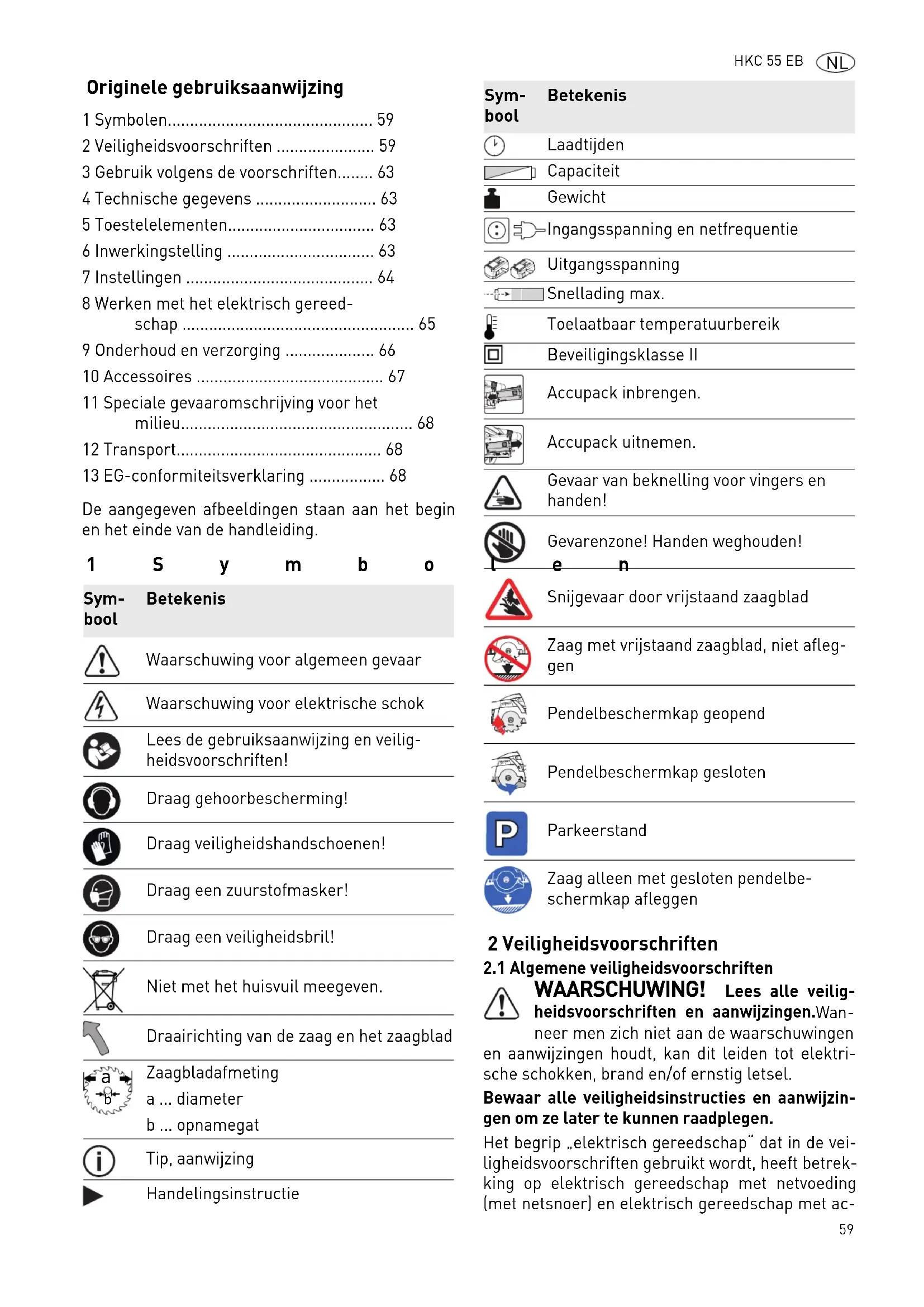 - 13 EG-conformiteitsverklaring Sym- bool Betekenis Waarschuwing voor algemeen gevaar Waarschuwing voor elektrische schok Lees de gebruiksaanwijzing en veilig- heidsvoorschriften! Draag gehoorbescherming! Draag veiligheidshandschoenen! Draag een zuurstofmasker! Draag een veiligheidsbril! Niet met het huisvuil meegeven. Draairichting van de zaag en het zaagblad Zaagbladafmeting a diameter b opnamegat Tip, aanwijzing Handelingsinstructie p. 68