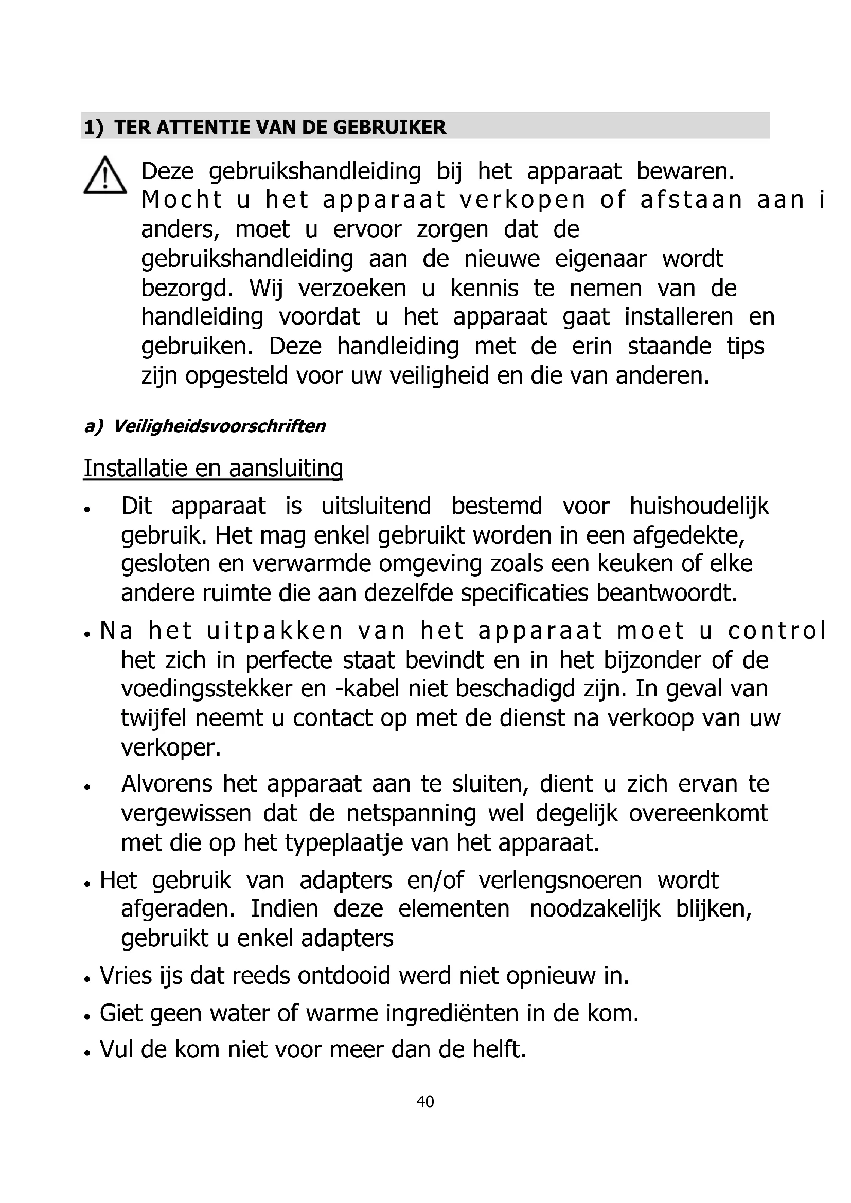 Deze gebruikshandleiding bij het apparaat bewaren. Mocht u het apparaat verkopen of afstaan aan iemand anders, moet u ervoor zorgen dat de gebruikshandleiding aan de nieuwe eigenaar wordt bezorgd. Wij verzoeken u kennis te nemen van de handleiding voordat u het apparaat gaat installeren en gebruiken. Deze handleiding met de erin staande tips zijn opgesteld voor uw veiligheid en die van anderen. a) Veiligheidsvoorschriften Installatie en aansluiting Dit apparaat is uitsluitend bestemd voor huishoudelijk gebruik. Het mag enkel gebruikt worden in een afgedekte, gesloten en verwarmde omgeving zoals een keuken of elke andere ruimte die aan dezelfde specificaties beantwoordt. Na het uitpakken van het apparaat moet u controleren of het zich in perfecte staat bevindt en in het bijzonder of de voedingsstekker en -kabel niet beschadigd zijn. In geval van twijfel neemt u contact op met de dienst na verkoop van uw verkoper. Alvorens het apparaat aan te sluiten, dient u zich ervan te vergewissen dat de netspanning wel degelijk overeenkomt met die op het typeplaatje van het apparaat. Het gebruik van adapters en/of verlengsnoeren wordt afgeraden. Indien deze elementen noodzakelijk blijken, gebruikt u enkel adapters Vries ijs dat reeds ontdooid werd niet opnieuw in. Giet geen water of warme ingrediënten in de kom. Vul de kom niet voor meer dan de helft.41 Van zodra de kom bevroren is, raakt u deze aan met een droge doek. Raak de binnenkant van de bevroren kom niet aan met natte of vochtige handen: uw vingers kunnen aan het metaal plakken. Ter voorkoming van kortsluiting mag u geen ander apparaat met hoog vermogen aansluiten op hetzelfde stopcontact. Het gebruik van accessoires die niet aanbevolen worden door de fabrikant van het apparaat kan tot gevaar of verwondingen leiden. Onderhoud en schoonmaken: Voor het schoonmaken ontkoppelt u het voedingssnoer van het apparaat. Het voedingssnoer mag niet vervangen worden. Indien dit beschadigd is, dient u het apparaat te verwijderen. Om elektrocutie te voorkomen, mag u de basis van het apparaat nooit in water of een andere vloeistof dompelen. Gebruik geen chemische producten, staalwol of schuurmiddelen om de buitenkant van het apparaat schoon te maken, dit kan leiden tot beschadiging. Het apparaat mag niet worden schoongemaakt of onderhouden door kinderen. Onzorgvuldig gebruik: Gebruik dit apparaat uitsluitend voor de in de gebruiksaanwijzing beschreven doeleinden. De fabrikant wijst iedere aansprakelijkheid van de hand in geval van onzorgvuldig gebruik.42 Dit apparaat is uitsluitend bestemd voor huishoudelijk gebruik in privéwoningen. Het gebruik van dit product in gemeenschappelijke of professionele lokalen zoals koffieruimtes op kantoren of werkplaatsen, campings, hotels enz. beantwoordt niet aan een zorgvuldig gebruik zoals bepaald door de fabrikant. b) Technische gegevens Model SOR15E Voeding 220V-240 V/50 Hz Verbruik 9,5 W Afmetingen B208 mm x D200 mm x H234 mm Netto gewicht 2,80Kg c) Milieubescherming Aan het einde van de levensduur mag dit product niet samen met ander huishoudelijk afval weggegooid worden. Lever het in in een containerpark of bij uw verkoper. Dat maakt het mogelijk om de schadelijke gevolgen voor het milieu en de gezondheid te vermijden en materialen te recyclen waardoor er heel wat energie en middelen kunnen worden bespaard. Het product bevat een logo dat u eraan herinnert dat u het product niet mag weggooien met het huishoudelijk afval. Voor meer informatie neemt u contact op met uw gemeente of de winkel waar u dit product gekocht heeft.43