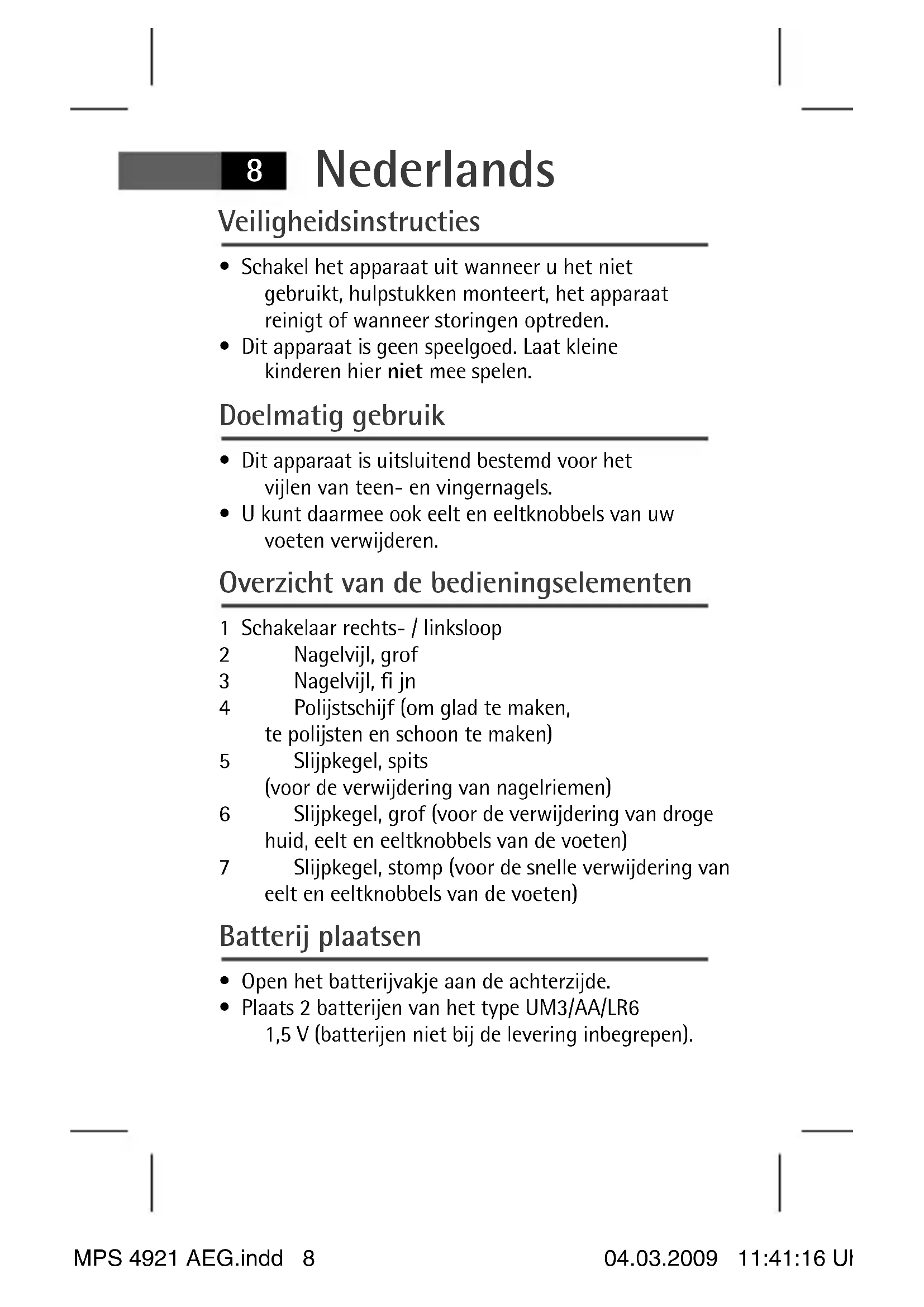 Download de handleiding voor uw Manicure- en pedicureset in PDF-formaat gratis! Vind uw handleiding MPS 4921 - AEG en neem uw elektronisch apparaat weer in handen. Op deze pagina staan alle documenten die nodig zijn voor het gebruik van uw apparaat. MPS 4921 van het merk AEG.