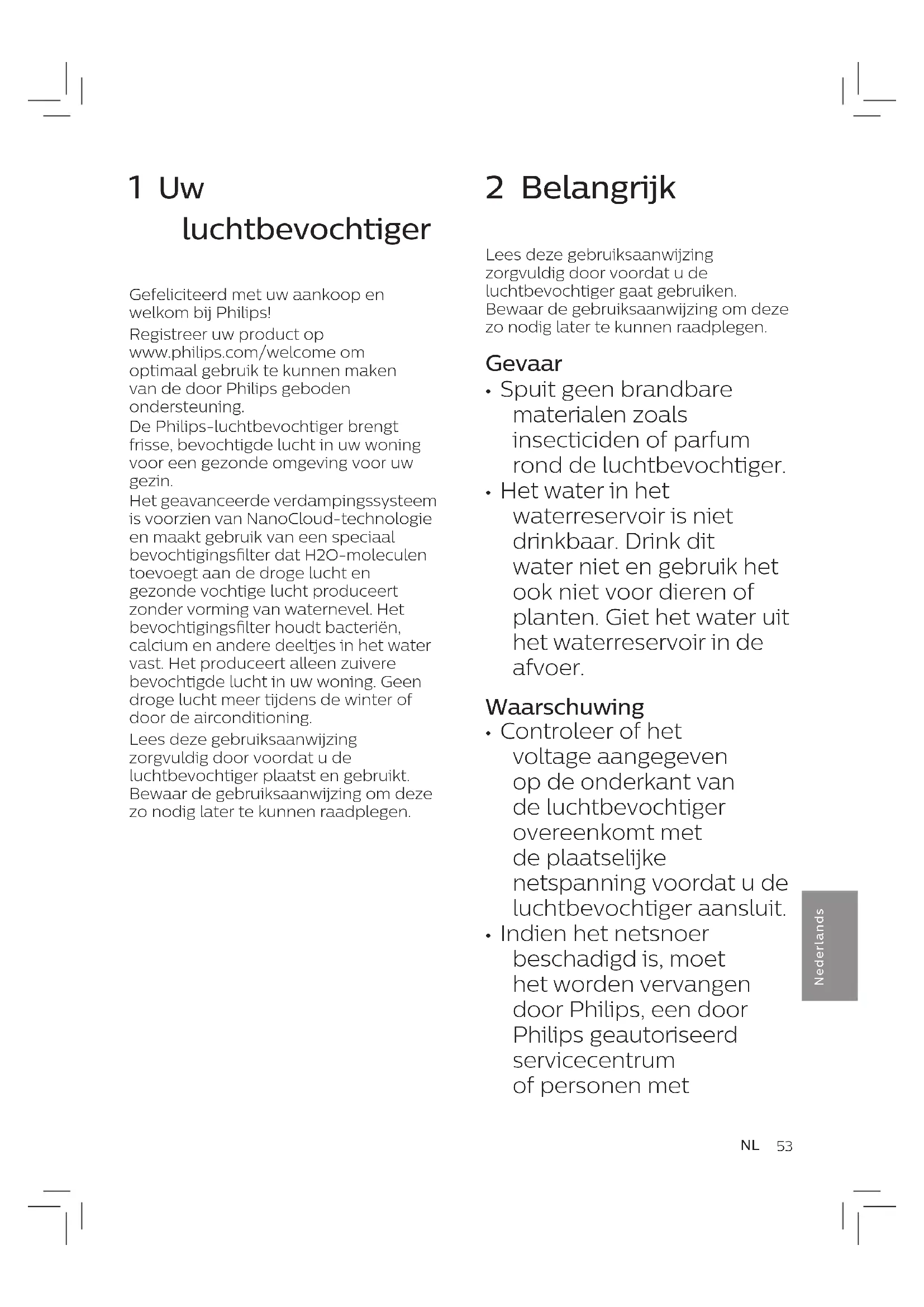 Nederlands 1 Uw luchtbevochtiger Gefeliciteerd met uw aankoop en welkom bij Philips! Registreer uw product op www.philips.com/welcome om optimaal gebruik te kunnen maken van de door Philips geboden ondersteuning. De Philips-luchtbevochtiger brengt frisse, bevochtigde lucht in uw woning voor een gezonde omgeving voor uw gezin. Het geavanceerde verdampingssysteem is voorzien van NanoCloud-technologie en maakt gebruik van een speciaal bevochtigingslter dat H2O-moleculen toevoegt aan de droge lucht en gezonde vochtige lucht produceert zonder vorming van waternevel. Het bevochtigingslter houdt bacteriën, calcium en andere deeltjes in het water vast. Het produceert alleen zuivere bevochtigde lucht in uw woning. Geen droge lucht meer tijdens de winter of door de airconditioning. Lees deze gebruiksaanwijzing zorgvuldig door voordat u de luchtbevochtiger plaatst en gebruikt. Bewaar de gebruiksaanwijzing om deze zo nodig later te kunnen raadplegen. 2 Belangrijk Lees deze gebruiksaanwijzing zorgvuldig door voordat u de luchtbevochtiger gaat gebruiken. Bewaar de gebruiksaanwijzing om deze zo nodig later te kunnen raadplegen. Gevaar