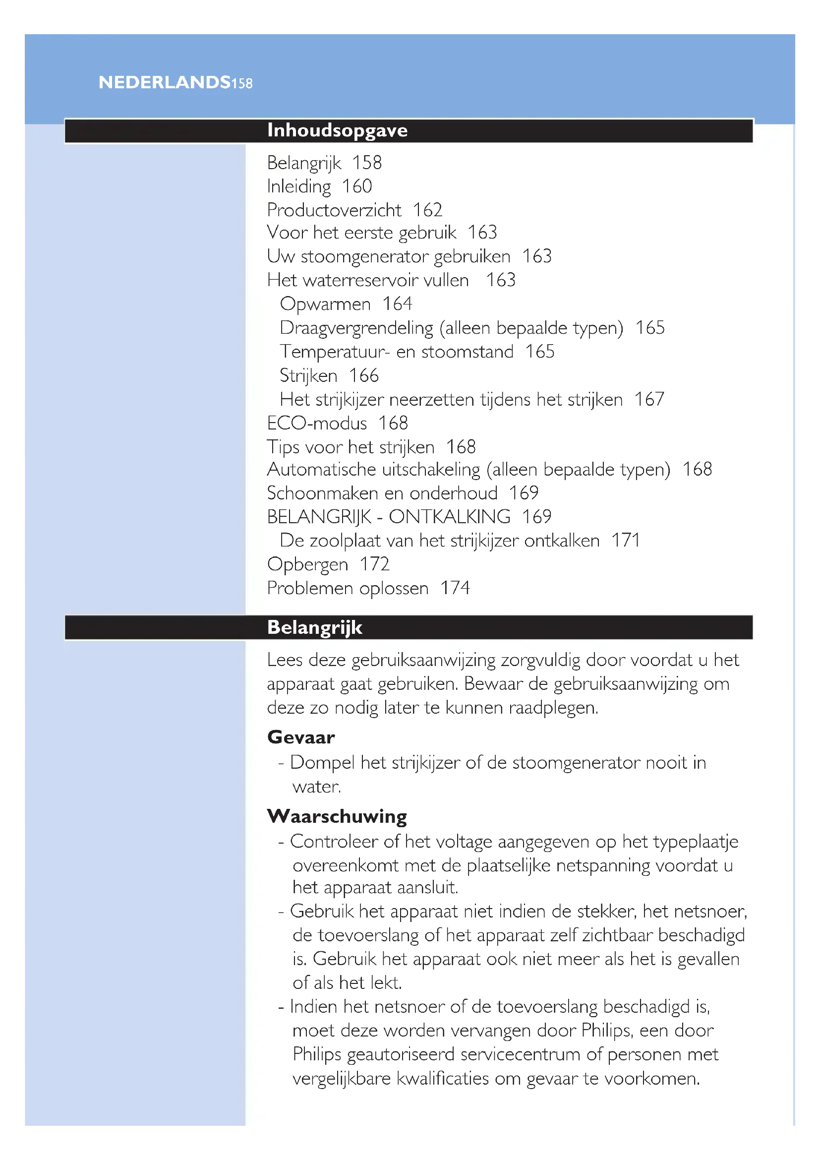 De zoolplaat van het strijkijzer ontkalken 171 Opbergen 172 Problemen oplossen 174 Belangrijk Lees deze gebruiksaanwijzing zorgvuldig door voordat u het apparaat gaat gebruiken. Bewaar de gebruiksaanwijzing om deze zo nodig later te kunnen raadplegen. Gevaar - Dompel het strijkijzer of de stoomgenerator nooit in water. Waarschuwing - Controleer of het voltage aangegeven op het typeplaatje overeenkomt met de plaatselijke netspanning voordat u het apparaat aansluit. - Gebruik het apparaat niet indien de stekker, het netsnoer, de toevoerslang of het apparaat zelf zichtbaar beschadigd is. Gebruik het apparaat ook niet meer als het is gevallen of als het lekt. - Indien het netsnoer of de toevoerslang beschadigd is, moet deze worden vervangen door Philips, een door Philips geautoriseerd servicecentrum of personen met vergelijkbare kwalicaties om gevaar te voorkomen. nEDErlanDs158159 - Laat het apparaat nooit onbeheerd achter terwijl het op netspanning is aangesloten. - Dit apparaat kan worden gebruikt door kinderen van 8 jaar en ouder en door personen met verminderde lichamelijke, zintuiglijke of geestelijke vermogens, of die gebrek aan ervaring of kennis hebben, als zij instructies hebben ontvangen over hoe het apparaat veilig kan worden gebruikt of als iemand toezicht op hen houdt en als iemand hen op de gevaren heeft gewezen. - Laat kinderen niet met het apparaat spelen. - Houd het strijkijzer en het netsnoer buiten het bereik van kinderen van 8 jaar en jonger wanneer het apparaat ingeschakeld of aan het afkoelen is. - Kinderen mogen alleen onder toezicht het apparaat schoonmaken en de Calc-Clean-procedure uitvoeren. - Voorkom dat het netsnoer of de toevoerslang in aanraking komt met de hete zoolplaat van het strijkijzer. - Als er stoom of hete waterdruppels van onder de EASY DE-CALC-knop ontsnappen tijdens het opwarmen, schakel het apparaat dan uit en laat het 2 uur afkoelen. Plaats de EASY DE-CALC-knop dan terug. Als er stoom blijft ontsnappen tijdens het opwarmen, schakel het apparaat dan uit en neem contact op met een door Philips geautoriseerd servicecentrum. - Verwijder de EASY DE-CALC-knop niet van de stoomgenerator als de stoomgenerator nog heet is of nog onder druk staat. - Gebruik geen andere kap op de stoomgenerator dan de bij het apparaat geleverde EASY DE-CALC-knop. let op - Sluit het apparaat uitsluitend aan op een geaard stopcontact. - Plaats en gebruik de stoomgenerator altijd op een stabiele, vlakke en horizontale ondergrond. - Controleer regelmatig of het netsnoer en de toevoerslang niet beschadigd zijn. - Wikkel het netsnoer volledig af voordat u de stekker in het stopcontact steekt. - Het strijkijzerplateau en de zoolplaat van het strijkijzer kunnen zeer heet worden en bij aanraking brandwonden nEDErlanDsnEDErlanDs 159veroorzaken. Als u de stoomgenerator wilt verplaatsen, raak dan het strijkijzerplateau niet aan. - Schakel altijd het apparaat uit en verwijder de stekker uit het stopcontact wanneer u klaar bent met strijken. - Zet het strijkijzer terug op het strijkijzerplateau, schakel het apparaat uit en verwijder de stekker uit het stopcontact: - a. wanneer u klaar bent met strijken - b. wanneer u het apparaat schoonmaakt - b. wanneer u het waterreservoir vult of leegt - c. wanneer u van het strijkijzer wegloopt, zelfs wanneer het alleen voor even is - Ontkalk de stoomgenerator regelmatig zoals beschreven in hoofdstuk ‘Schoonmaken en onderhoud’. - Dit apparaat is uitsluitend bedoeld voor huishoudelijk gebruik binnenshuis. Elektromagnetische velden (EMV) Dit Philips-apparaat voldoet aan alle richtlijnen met betrekking tot elektromagnetische velden (EMV). Mits het apparaat op de juiste wijze en volgens de instructies in deze gebruiksaanwijzing wordt gebruikt, is het veilig te gebruiken volgens het nu beschikbare wetenschappelijke bewijs. Het apparaat afdanken - Gooi het apparaat aan het einde van zijn levensduur niet weg met het normale huisvuil, maar lever het in op een door de overheid aangewezen inzamelpunt om het te laten recyclen. Op die manier levert u een bijdrage aan een schonere leefomgeving. - Om recyclen mogelijk te maken, zijn de voor dit apparaat gebruikte plastic onderdelen gecodeerd. De kartonverpakking is van 90% gerecycled materiaal gemaakt en is helemaal herbruikbaar. Inleiding Dank u voor het kopen van deze Philips-stoomgenerator. - De nieuwe Philips PerfectCare biedt u een innovatieve manier om uw kledingstukken te strijken. We kennen allemaal het gedoe met traditionele strijkijzers: de juiste temperatuur kiezen voor uw stugge en jne stof, wachten tot het strijkijzer opwarmt en afkoelt om het risico van beschadigde kleren met een te heet strijkijzer te nEDErlanDs160vermijden. Die problemen behoren tot het verleden met de nieuwe Philips PerfectCare. - In principe worden kreuken verwijderd door het overbrengen van warmte op stof. Vroeger werd dit met een zeer hete zoolplaat gedaan. Dan werd stoom toegevoegd om warmte beter te verplaatsen, waardoor strijken veel sneller ging. Ons onderzoek bevestigde dat de beste manier om doeltreffend kreuken te verwijderen een perfecte combinatie is van intense stoom en een optimale zoolplaattemperatuur. De sleutel tot de doeltreffende verwijdering van kreuken is de stoom, niet de zoolplaattemperatuur. De zoolplaattemperatuur moet net boven de stoomtemperatuur liggen om vocht te verwijderen. Dit is de optimale temperatuur. - In het verleden zou een hoge hoeveelheid stoom bij deze optimale temperatuur tot lekkage hebben geleid. Wij ontwikkelden een unieke gepatenteerde cyclonische kamer om hogedrukstoom te handhaven die diep in de stof doordringt, voor snel strijkwerk zonder risico op lekkage. - Strijken is nu werkelijk eenvoudig: geen temperatuuraanpassing, geen schroeiplekken, geen wachttijd voor opwarmen en afkoelen. Het is sneller, wie het strijkwerk ook verricht. Met deze OptimalTemp- technologie kan elk kledingstuk doeltreffend en veilig worden gestreken. - Dit strijkijzer is door The Woolmark Company Pty Ltd 