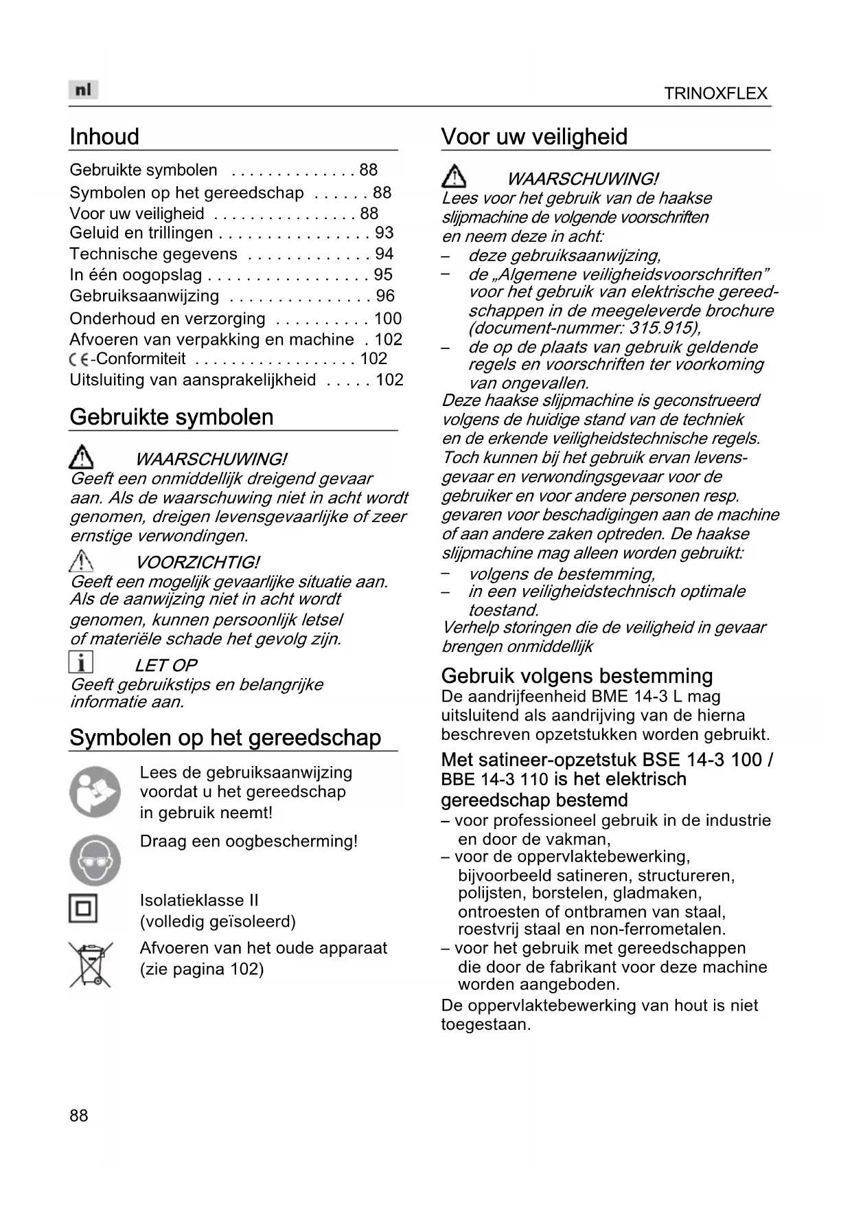 Gebruik volgens bestemming De aandrijfeenheid BME 14-3 L mag uitsluitend als aandrijving van de hierna beschreven opzetstukken worden gebruikt. Met satineer-opzetstuk BSE 14-3 100 / BBE 14-3 110 is het elektrisch gereedschap bestemd – voor professioneel gebruik in de industrie en door de vakman,– voor de oppervlaktebewerking, bijvoorbeeld satineren, structureren, polijsten, borstelen, gladmaken, ontroesten of ontbramen van staal, roestvrij staal en non-ferrometalen.– voor het gebruik met gereedschappen die door de fabrikant voor deze machine worden aangeboden.De oppervlaktebewerking van hout is niet toegestaan.TRINOXFLEX