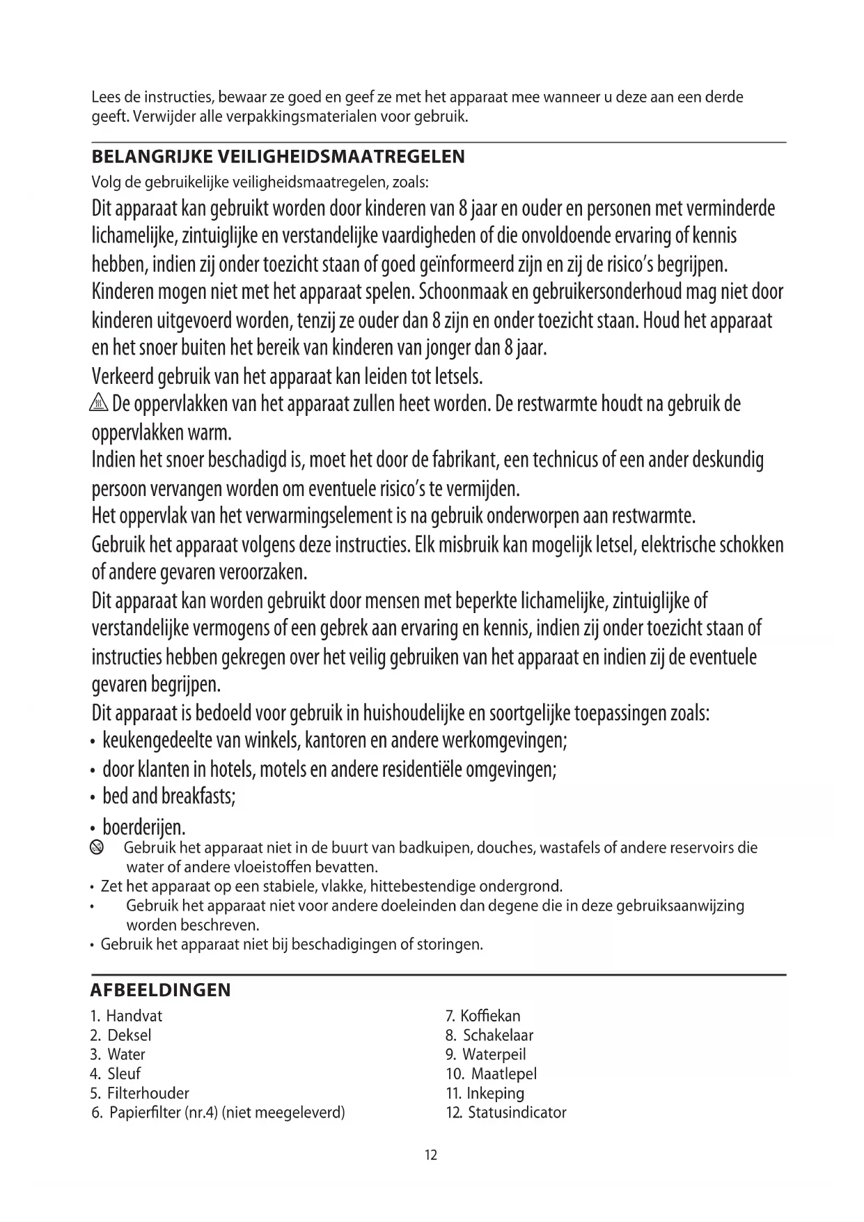 AE12 Lees de instructies, bewaar ze goed en geef ze met het apparaat mee wanneer u deze aan een derde geeft. Verwijder alle verpakkingsmaterialen voor gebruik. BELANGRIJKE VEILIGHEIDSMAATREGELEN Volg de gebruikelijke veiligheidsmaatregelen, zoals: Dit apparaat kan gebruikt worden door kinderen van 8 jaar en ouder en personen met verminderde lichamelijke, zintuiglijke en verstandelijke vaardigheden of die onvoldoende ervaring of kennis hebben, indien zij onder toezicht staan of goed geïnformeerd zijn en zij de risico’s begrijpen. Kinderen mogen niet met het apparaat spelen. Schoonmaak en gebruikersonderhoud mag niet door kinderen uitgevoerd worden, tenzij ze ouder dan 8 zijn en onder toezicht staan. Houd het apparaat en het snoer buiten het bereik van kinderen van jonger dan 8 jaar. Verkeerd gebruik van het apparaat kan leiden tot letsels. h De oppervlakken van het apparaat zullen heet worden. De restwarmte houdt na gebruik de oppervlakken warm. Indien het snoer beschadigd is, moet het door de fabrikant, een technicus of een ander deskundig persoon vervangen worden om eventuele risico’s te vermijden. Het oppervlak van het verwarmingselement is na gebruik onderworpen aan restwarmte. Gebruik het apparaat volgens deze instructies. Elk misbruik kan mogelijk letsel, elektrische schokken of andere gevaren veroorzaken. Dit apparaat kan worden gebruikt door mensen met beperkte lichamelijke, zintuiglijke of verstandelijke vermogens of een gebrek aan ervaring en kennis, indien zij onder toezicht staan of instructies hebben gekregen over het veilig gebruiken van het apparaat en indien zij de eventuele gevaren begrijpen. Dit apparaat is bedoeld voor gebruik in huishoudelijke en soortgelijke toepassingen zoals: