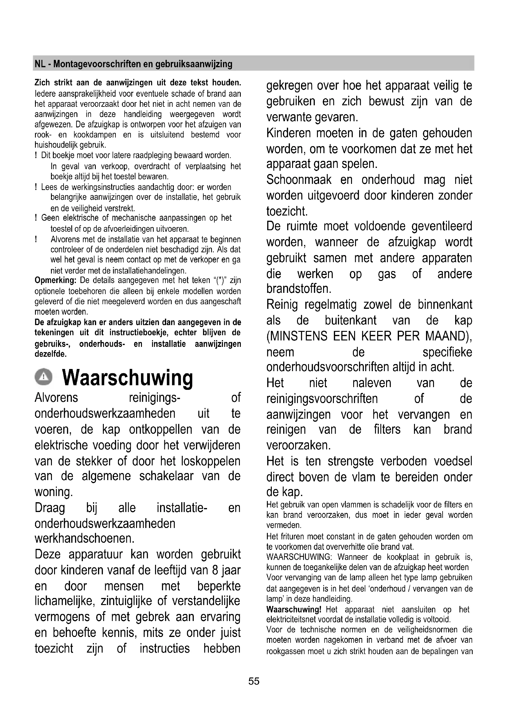 NETTOYAGE ! Éviter l'usage de produits abrasifs, NE PAS UTILISER D'ALCOOL! Filtre anti-gras Fig. 28-29-30 Il retient les particules de graisse issues de la cuisson. Il doit être nettoyé au moins une fois par mois (ou lorsque le système d'indication de saturation des filtres -si prévu sur le modèle acheté- signale cette nécessité), avec des détergents non agressifs, dans un lave-vaisselle à basse température et en cycle court (Tmax : 70 ° C) Avec le lavage dans un lave-vaisselle les éléments métalliques peuvent se décolorer. Le filtre doit être séché au four à une température de maximum 100 ° C pendant une heure. Si le filtre est encore humide, il faut recommencer l'opération. Remplacer le filtre au moins tous les 2 ans. Attention ! Après avoir effectué l'entretien du filtre, installer dans le conteneur spécifique D'ABORD le filtre à graisse, PUIS le filtre à charbon. Ce dernier est reconnaissable car il est scellé à l'intérieur d'une gaine. Vérifier, lorsque le conteneur est repositionné, que seul le filtre à graisse est visible. Filtre à charbon actif (uniquement pour version recyclage) Fig. 28-29-30 Retient les odeurs désagréables de cuisson. Attention ! Le filtre à charbons actifs est reconnaissable parce qu'il est scellé à l'intérieur d'une gaine spécifique. Effectuer le démontage, l'entretien et le nettoyage du filtre en le manipulant avec le plus grand soin, afin de ne pas endommager, ni ouvrir las gaine. Le filtre à charbon peut être nettoyé tous les deux mois (ou lorsque le système d’indication de saturation des filtres – si prévu sur le modèle possédé – indique cette nécessité) avec de l’eau chaude et au moyen de détergents appropriés ou dans le lave-vaisselle à 65°C (dans le cas de lavage dans le lave-vaisselle suivre un cycle de lavage complet sans vaisselle à l’intérieur). Enlever l’eau qui excède en faisant attention de ne pas abîmer le filtre, ensuite le mettre dans le four pendant 10 minutes à 100°C pour le sécher définitivement. Remplacer le coussinet tous les 3 ans et chaque fois que le filtre sera abîmé. Attention ! Après avoir effectué l'entretien du filtre, installer dans le conteneur spécifique D'ABORD le filtre à graisse, PUIS le filtre à charbon. Ce dernier est reconnaissable car il est scellé à l'intérieur d'une gaine. Vérifier, lorsque le conteneur est repositionné, que seul le filtre à graisse est visible. Remplacement des lampes Fig. 29 La hotte est dotée d’un système d’éclairage basé sur la technologie LED. Les LEDS garantissent un éclairage optimal, une durée jusqu’à 10 fois supérieures aux ampoules traditionnelles et permettent une épargne de 90% en énergie électrique. Pour l'achat des LED à remplacer, il faut contacter le service après-vente (assistance technique).55 NL - Montagevoorschriften en gebruiksaanwijzing Zich strikt aan de aanwijzingen uit deze tekst houden. Iedere aansprakelijkheid voor eventuele schade of brand aan het apparaat veroorzaakt door het niet in acht nemen van de aanwijzingen in deze handleiding weergegeven wordt afgewezen. De afzuigkap is ontworpen voor het afzuigen van rook- en kookdampen en is uitsluitend bestemd voor huishoudelijk gebruik. ! Dit boekje moet voor latere raadpleging bewaard worden. In geval van verkoop, overdracht of verplaatsing het boekje altijd bij het toestel bewaren. ! Lees de werkingsinstructies aandachtig door: er worden belangrijke aanwijzingen over de installatie, het gebruik en de veiligheid verstrekt. ! Geen elektrische of mechanische aanpassingen op het toestel of op de afvoerleidingen uitvoeren. ! Alvorens met de installatie van het apparaat te beginnen controleer of de onderdelen niet beschadigd zijn. Als dat wel het geval is neem contact op met de verkoper en ga niet verder met de installatiehandelingen. Opmerking: De details aangegeven met het teken “(*)” zijn optionele toebehoren die alleen bij enkele modellen worden geleverd of die niet meegeleverd worden en dus aangeschaft moeten worden. De afzuigkap kan er anders uitzien dan aangegeven in de tekeningen uit dit instructieboekje, echter blijven de gebruiks-, onderhouds- en installatie aanwijzingen dezelfde. Waarschuwing Alvorens reinigings- of onderhoudswerkzaamheden uit te voeren, de kap ontkoppellen van de elektrische voeding door het verwijderen van de stekker of door het loskoppelen van de algemene schakelaar van de woning. Draag bij alle installatie- en onderhoudswerkzaamheden werkhandschoenen. Deze apparatuur kan worden gebruikt door kinderen vanaf de leeftijd van 8 jaar en door mensen met beperkte lichamelijke, zintuiglijke of verstandelijke vermogens of met gebrek aan ervaring en behoefte kennis, mits ze onder juist toezicht zijn of instructies hebben gekregen over hoe het apparaat veilig te gebruiken en zich bewust zijn van de verwante gevaren. Kinderen moeten in de gaten gehouden worden, om te voorkomen dat ze met het apparaat gaan spelen. Schoonmaak en onderhoud mag niet worden uitgevoerd door kinderen zonder toezicht. De ruimte moet voldoende geventileerd worden, wanneer de afzuigkap wordt gebruikt samen met andere apparaten die werken op gas of andere brandstoffen. Reinig regelmatig zowel de binnenkant als de buitenkant van de kap (MINSTENS EEN KEER PER MAAND), neem de specifieke onderhoudsvoorschriften altijd in acht. Het niet naleven van de reinigingsvoorschriften of de aanwijzingen voor het vervangen en reinigen van de filters kan brand veroorzaken. Het is ten strengste verboden voedsel direct boven de vlam te bereiden onder de kap. Het gebruik van open vlammen is schadelijk voor de filters en kan brand veroorzaken, dus moet in ieder geval worden vermeden. Het frituren moet constant in de gaten gehouden worden om te voorkomen dat oververhitte olie brand vat. WAARSCHUWING: Wanneer de kookplaat in gebruik is, kunnen de toegankelijke delen van de afzuigkap heet worden Voor vervanging van de lamp alleen het type lamp gebruik