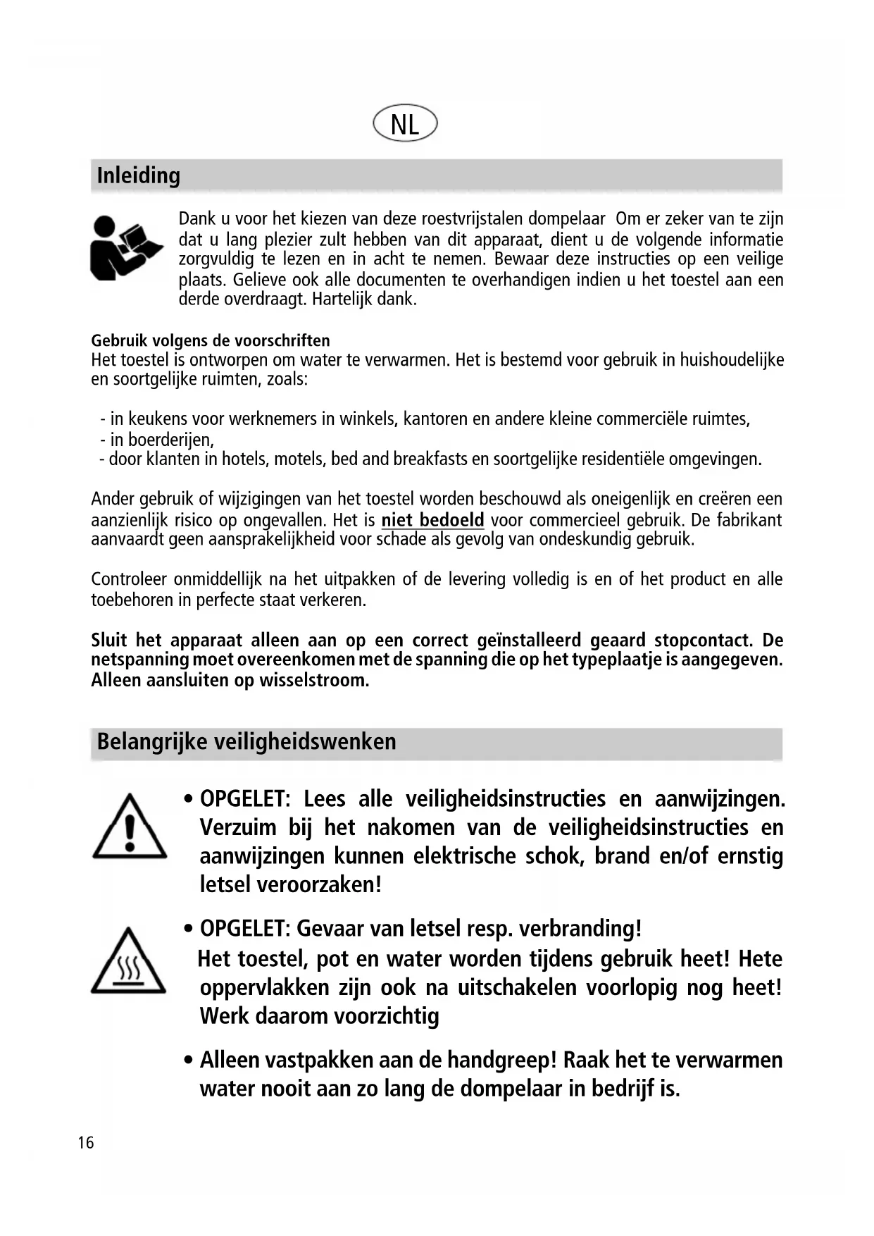 - Alleen vastpakken aan de handgreep! Raak het te verwarmen water nooit aan zo lang de dompelaar in bedrijf is.17 Algemene veiligheidsinstructies: