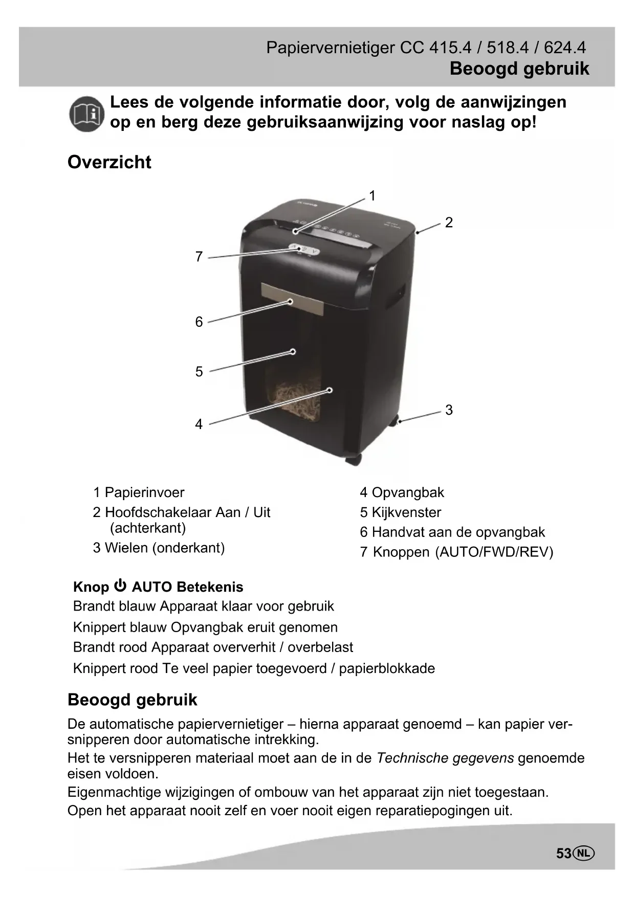 1 Papierinvoer 2 Hoofdschakelaar Aan / Uit (achterkant) 3 Wielen (onderkant) 4 Opvangbak 5 Kijkvenster 6 Handvat aan de opvangbak 7 Knoppen (AUTO/FWD/REV) Knop AUTO Betekenis Brandt blauw Apparaat klaar voor gebruik Knippert blauw Opvangbak eruit genomen Brandt rood Apparaat oververhit / overbelast Knippert rood Te veel papier toegevoerd / papierblokkade Beoogd gebruik De automatische papiervernietiger – hierna apparaat genoemd – kan papier ver snipperen door automatische intrekking. Het te versnipperen materiaal moet aan de in de Technische gegevens genoemde eisen voldoen. Eigenmachtige wijzigingen of ombouw van het apparaat zijn niet toegestaan. Open het apparaat nooit zelf en voer nooit eigen reparatiepogingen uit.Veiligheidsinformatie Papiervernietiger CC 415.4 / 518.4 / 624.4