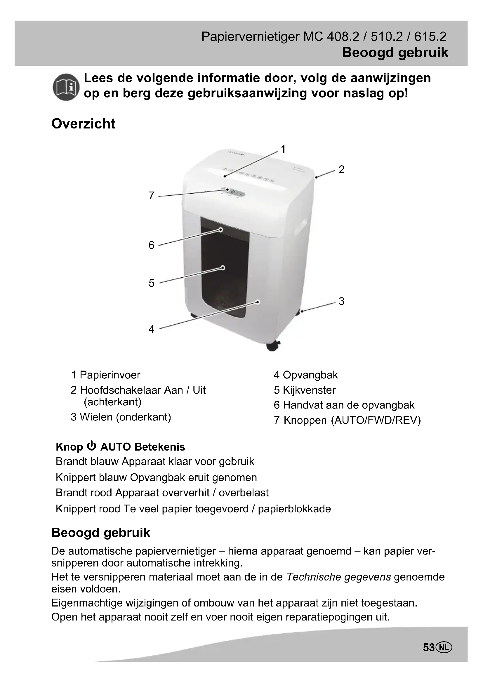 1 Papierinvoer 2 Hoofdschakelaar Aan / Uit (achterkant) 3 Wielen (onderkant) 4 Opvangbak 5 Kijkvenster 6 Handvat aan de opvangbak 7 Knoppen (AUTO/FWD/REV) Knop AUTO Betekenis Brandt blauw Apparaat klaar voor gebruik Knippert blauw Opvangbak eruit genomen Brandt rood Apparaat oververhit / overbelast Knippert rood Te veel papier toegevoerd / papierblokkade Beoogd gebruik De automatische papiervernietiger – hierna apparaat genoemd – kan papier ver snipperen door automatische intrekking. Het te versnipperen materiaal moet aan de in de Technische gegevens genoemde eisen voldoen. Eigenmachtige wijzigingen of ombouw van het apparaat zijn niet toegestaan. Open het apparaat nooit zelf en voer nooit eigen reparatiepogingen uit.Veiligheidsinformatie Papiervernietiger MC 408.2 / 510.2 / 615.2 54 n Niet-beoogd gebruik De automatische papiervernietiger dient niet voor het versnipperen van materiaal, dat niet voldoet aan de eisen die worden genoemd in de Technische gegevens (bijv. karton). Elk ander gebruik dan onder Beoogd gebruik beschreven valt buiten het beoogd gebruik. Veiligheidsinformatie De volgende veiligheidsinstructies zijn geldig voor het hele document. Lees en volg de veiligheidsinstructies om uzelf en het milieu te beschermen.