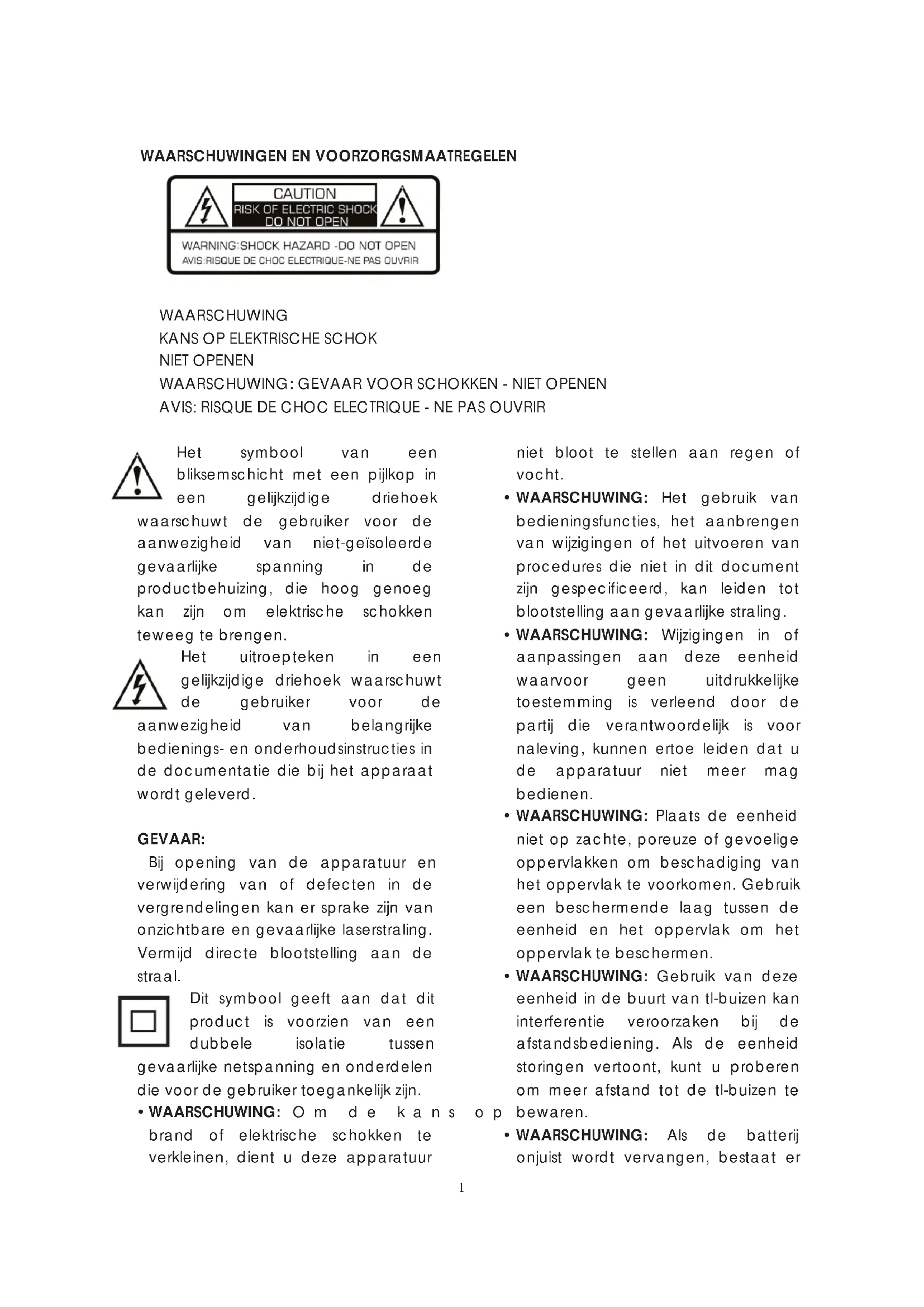 - WAARSCHUWING: Het gebruik van bedieningsfuncties, het aanbrengen van wijzigingen of het uitvoeren van procedures die niet in dit document zijn gespecificeerd, kan leiden tot blootstelling aan gevaarlijke straling.