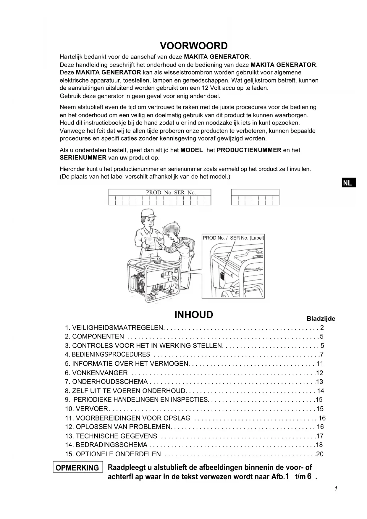 VOORWOORD INHOUD Hartelijk bedankt voor de aanschaf van deze MAKITA GENERATOR. Deze handleiding beschrijft het onderhoud en de bediening van deze MAKITA GENERATOR. Deze MAKITA GENERATOR kan als wisselstroombron worden gebruikt voor algemene elektrische apparatuur, toestellen, lampen en gereedschappen. Wat gelijkstroom betreft, kunnen de aansluitingen uitsluitend worden gebruikt om een 12 Volt accu op te laden.Gebruik deze generator in geen geval voor enig ander doel.Neem alstublieft even de tijd om vertrouwd te raken met de juiste procedures voor de bediening en het onderhoud om een veilig en doelmatig gebruik van dit product te kunnen waarborgen. Houd dit instructieboekje bij de hand zodat u er indien noodzakelijk iets in kunt opzoeken. Vanwege het feit dat wij te allen tijde proberen onze producten te verbeteren, kunnen bepaalde procedures en speci caties zonder kennisgeving vooraf gewijzigd worden. Als u onderdelen bestelt, geef dan altijd het MODEL, het PRODUCTIENUMMER en het SERIENUMMER van uw product op.Hieronder kunt u het productienummer en serienummer zoals vermeld op het product zelf invullen. (De plaats van het label verschilt afhankelijk van de het model.) OPMERKING Raadpleegt u alstublieft de afbeeldingen binnenin de voor- of achterfl ap waar in de tekst verwezen wordt naar Afb.