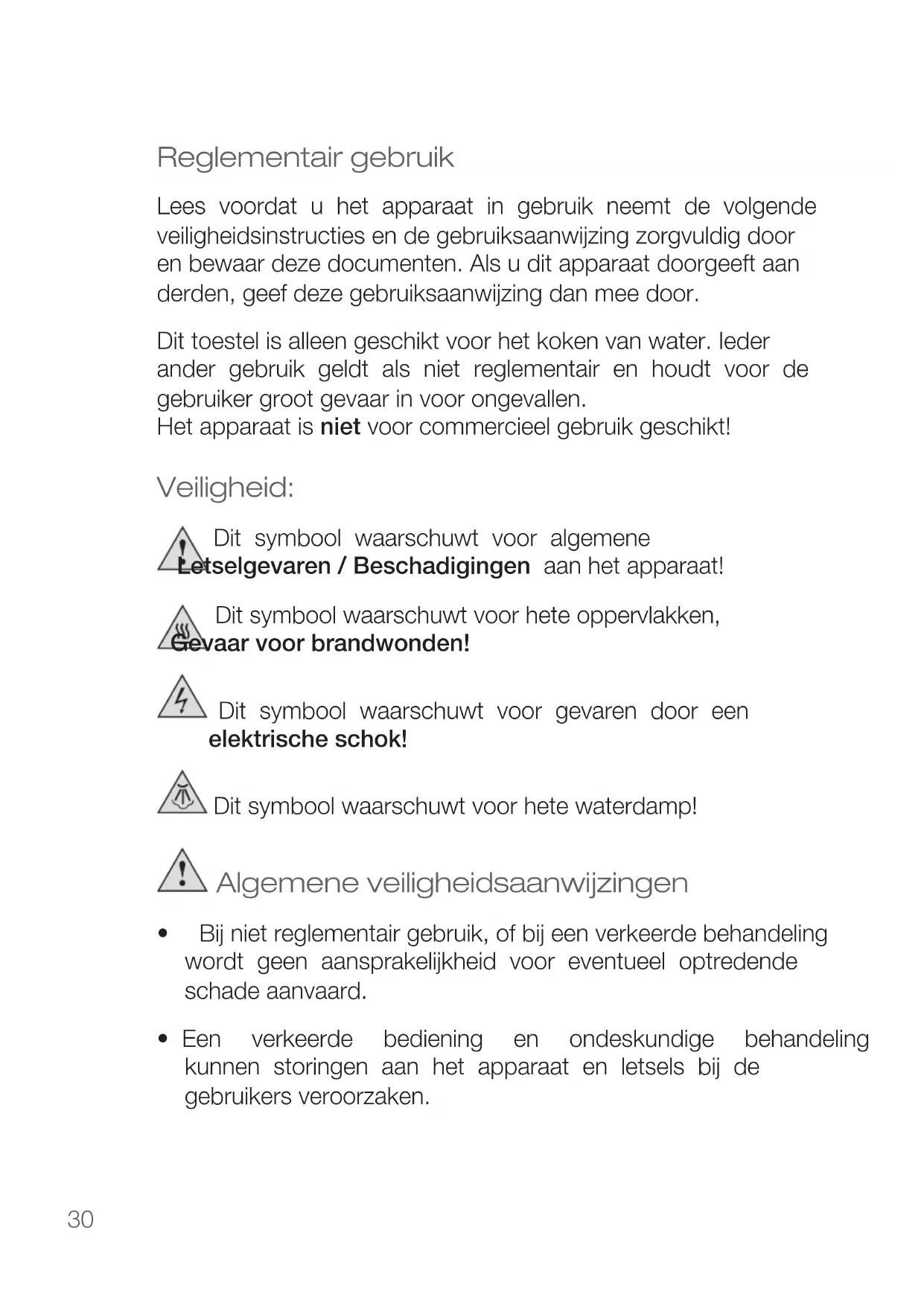 - auxfautescommisesparleclient La garantie ne s'applique que sous réserve de présentation d'une preuve d'achat par le client. Dans le cadre de la garantie, le client dispose du droit de faire réparer ou d’échanger l'appareil dans nos centres de réparation ouceuxquenousavonsagréés.Leclientnepeutprétendreà d'autresdroitssupplémentaires(envertudelagarantie). KORONA electric GmbH, Sundern. Adresse du service : KORONA Service Am Steinbach 8 59872 Meschede-Enste Assistance téléphonique : 02933 90284-80 E-mail: service@korona-electric.de Site web: www.korona-electric.de30 Reglementair gebruik Lees voordat u het apparaat in gebruik neemt de volgende veiligheidsinstructies en de gebruiksaanwijzing zorgvuldig door en bewaar deze documenten. Als u dit apparaat doorgeeft aan derden, geef deze gebruiksaanwijzing dan mee door. Dit toestel is alleen geschikt voor het koken van water. Ieder ander gebruik geldt als niet reglementair en houdt voor de gebruiker groot gevaar in voor ongevallen. Het apparaat is niet voor commercieel gebruik geschikt! Veiligheid: Dit symbool waarschuwt voor algemene Letselgevaren / Beschadigingen aan het apparaat! Dit symbool waarschuwt voor hete oppervlakken, Gevaar voor brandwonden! Dit symbool waarschuwt voor gevaren door een elektrische schok! Dit symbool waarschuwt voor hete waterdamp! Algemene veiligheidsaanwijzingen