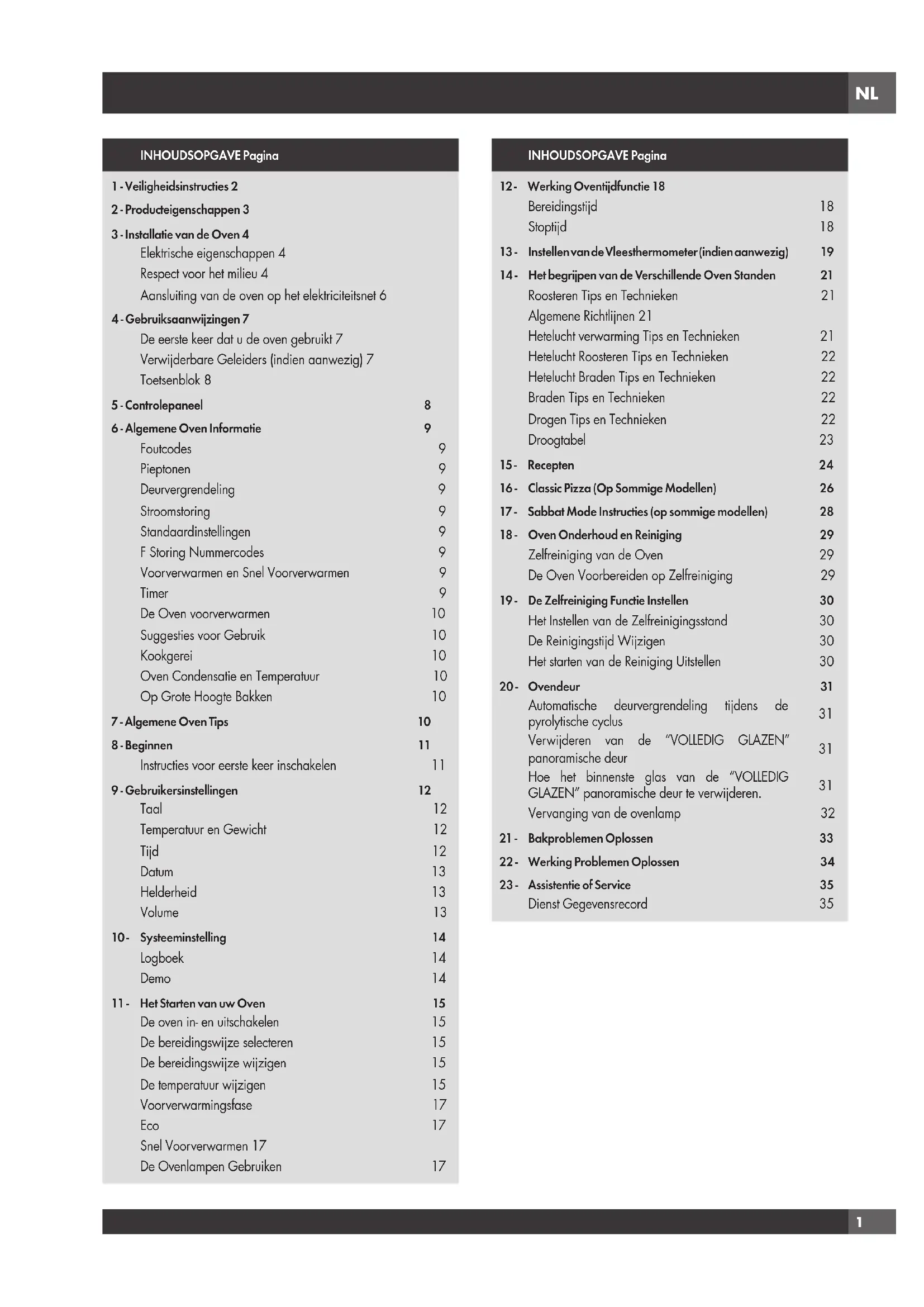 Controleer het volgende, alvorens contact op te nemen met de technische dienst, om onnodige kosten te vermijden. Oven Problemen Stappen voor Oplossen Probleem Foutcode F1030* or F2030* verschijnt op het beeldscherm Er is een probleem met het vergrendelmechanisme. Schakel stroom uit en vervolgens na een paar seconden weer aan. De oven zou dan automatisch een test op de vergrendeling moeten uitvoeren. Noteer de foutcode (in het LOGBOEK) als het probleem zich blijft voordoen en contacteer de technische dienst. Een andere F__ foutcode verschijnt op het beeldscherm. Schakel stroom uit en vervolgens na een paar seconden weer aan. Noteer de foutcode (in het LOGBOEK) als het probleem zich blijft voordoen en contacteer de technische dienst. Het beeldscherm van de oven blijft UIT Schakel de stroom uit op de hoofdelektriciteitsvoorziening (zekering of stroomonderbreker). Schakel de stroomonderbreker weer in. Schakel een geautoriseerde dienst in als het probleem zich blijft voordoen. De koelventilator blijft draaien als de oven uitgeschakeld is De ventilator gaat automatisch uit als de elektronische componenten voldoende afgekoeld zijn. De ovendeur is gesloten en ontgrendelt niet, zelfs niet na afkoelen. Zet de oven uit bij de stroomonderbreker en wacht een paar seconden. Schakel de stroomonderbreker weer in. De oven moet zichzelf opnieuw instellen en zal weer bediend kunnen worden. Oven wordt niet warm Controleer de stroomonderbreker of zekeringkast van uw huis. Zorg ervoor dat de oven juist op het stroom is aangesloten. Zorg ervoor dat de oventemperatuur geselecteerd is. Oven bakt niet gelijkmatig. Raadpleeg bereidingsgrafieken voor de aanbevolen bakplaat positie. Verlaag altijd de temperatuur met 25°F (15°C) bij het bakken in de Hetelucht Bakstand Ovenlamp werkt niet goed Vervang de lamp als deze defect is of draai hem aan als hij lost zit. Zie pagina 32. Vermijd het aanraken van de lamp met uw vingers, aangezien olie van de handen ervoor kan zorgen dat de lampen eerder uitbranden. Ovenlamp blijft aan Controleer of er iets de ovendeur belemmert. Controleer of de scharnier is verbogen of de deur schakelaar kapot is. Oven Zelfreiniging werkt niet goed Laat de oven afkoelen alvorens de Zelfreiniging uit te voeren. Verwijder altijd eerst losse etensresten en gemorste vloeistoffen alvorens de Zelfreiniging uit te voeren. Zet de oven op een vier uur durende Zelfreiniging als deze erg vuil is. Zie voor het voorbereiden van de oven op Zelfreiniging, pagina 30. Klok en timer werken niet goed Zorg ervoor dat de oven juist op het stroom is aangesloten. Zie voor de Klok secties pagina 12. Overmatig vocht Verwarm de oven eerst voor bij gebruik van de Bakstand. Hetelucht Bakken of Hetelucht Roosteren verwijderen al het vocht in de oven (dit is een van de voordelen van hetelucht bereiding). Porselein splinters Til de ovenbakplaten altijd omhoog, bij het erin en eruit halen, en gebruik geen overmatige kracht om porselein splinters te voorkomen.NL