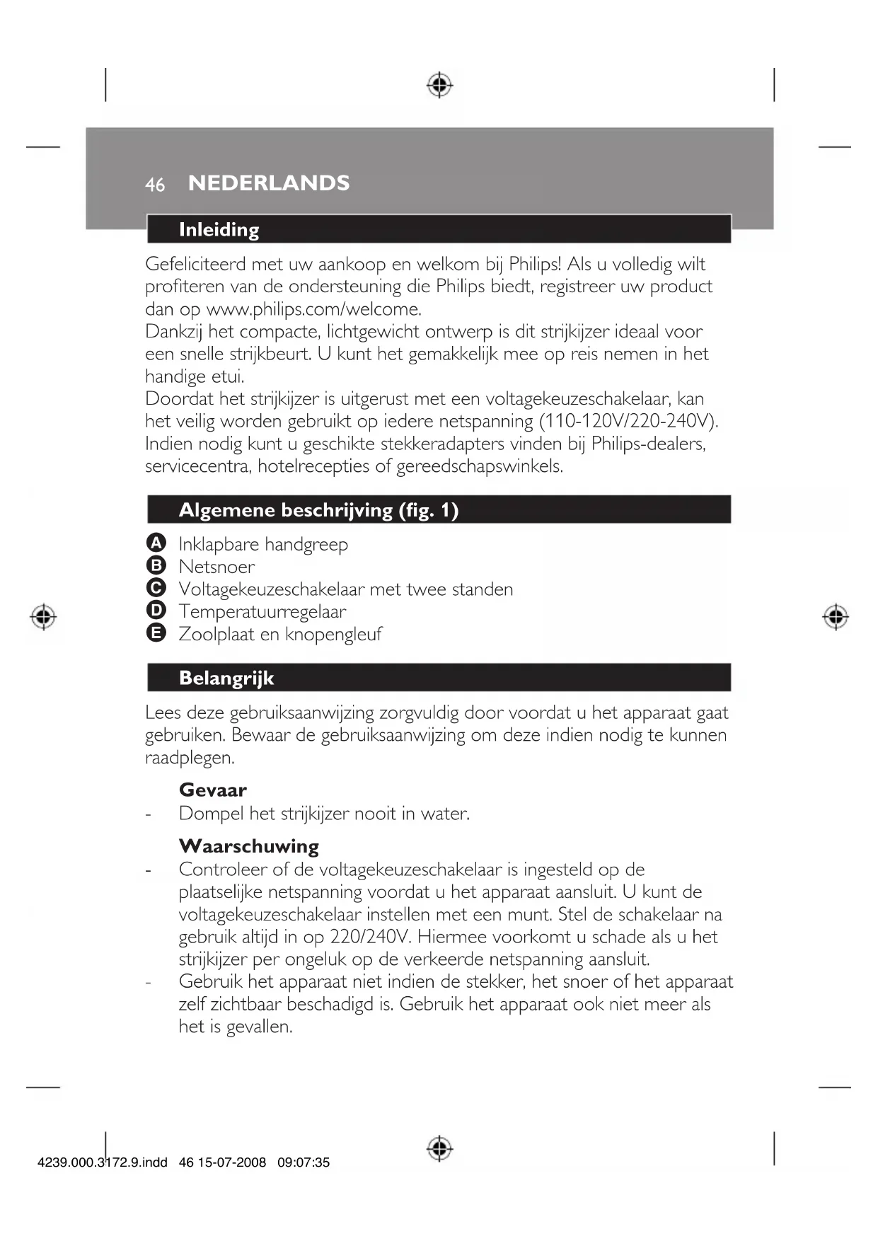 ITALIANO44 4239.000.3172.9.indd 44 15-07-2008 09:07:34Risoluzione dei guasti In questo capitolo vengono riportati i problemi più ricorrenti legati all’uso dell’apparecchio. Se non riuscite a risolvere i problemi con le informazioni seguenti, contattate il Centro Assistenza Clienti Philips del vostro paese. Problema Possibile causa Soluzione Il ferro è collegato alla presa di corrente ma la piastra è fredda. Problema di collegamento. Vericate il cavo di alimentazione, lo spinotto e la presa a muro. Il termostato è impostato sul livello minimo. Impostate il termostato alla temperatura richiesta. ITALIANO 45 4239.000.3172.9.indd 45 15-07-2008 09:07:3546 Inleiding Gefeliciteerd met uw aankoop en welkom bij Philips! Als u volledig wilt proteren van de ondersteuning die Philips biedt, registreer uw product dan op www.philips.com/welcome. Dankzij het compacte, lichtgewicht ontwerp is dit strijkijzer ideaal voor een snelle strijkbeurt. U kunt het gemakkelijk mee op reis nemen in het handige etui. Doordat het strijkijzer is uitgerust met een voltagekeuzeschakelaar, kan het veilig worden gebruikt op iedere netspanning (110-120V/220-240V). Indien nodig kunt u geschikte stekkeradapters vinden bij Philips-dealers, servicecentra, hotelrecepties of gereedschapswinkels. Algemene beschrijving (g. 1) A Inklapbare handgreep B Netsnoer C Voltagekeuzeschakelaar met twee standen D Temperatuurregelaar E Zoolplaat en knopengleuf Belangrijk Lees deze gebruiksaanwijzing zorgvuldig door voordat u het apparaat gaat gebruiken. Bewaar de gebruiksaanwijzing om deze indien nodig te kunnen raadplegen. Gevaar Dompel het strijkijzer nooit in water. Waarschuwing Controleer of de voltagekeuzeschakelaar is ingesteld op de plaatselijke netspanning voordat u het apparaat aansluit. U kunt de voltagekeuzeschakelaar instellen met een munt. Stel de schakelaar na gebruik altijd in op 220/240V. Hiermee voorkomt u schade als u het strijkijzer per ongeluk op de verkeerde netspanning aansluit. Gebruik het apparaat niet indien de stekker, het snoer of het apparaat zelf zichtbaar beschadigd is. Gebruik het apparaat ook niet meer als het is gevallen.