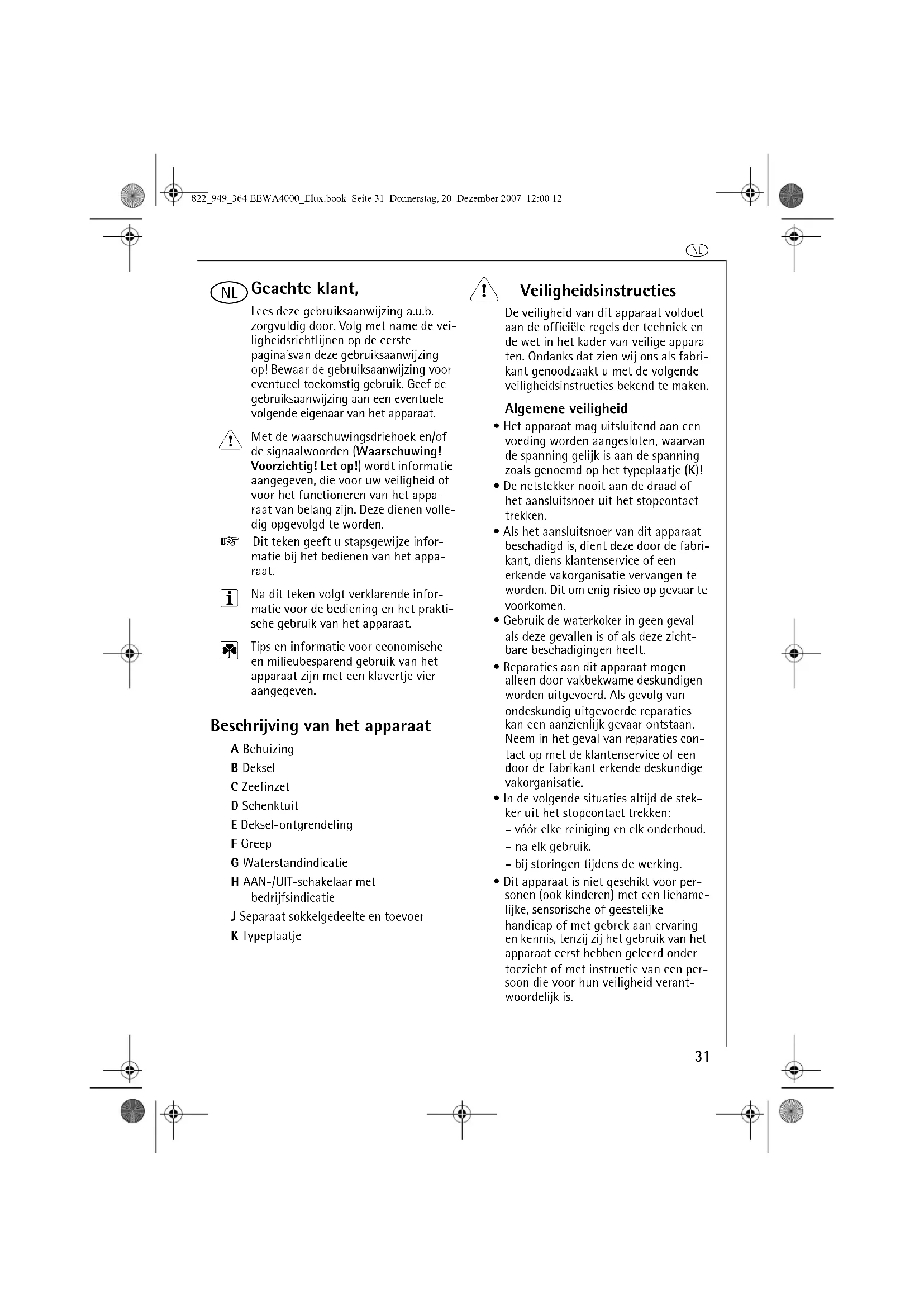 Geachte klant, Lees deze gebruiksaanwijzing a.u.b. zorgvuldig door. Volg met name de vei-ligheidsrichtlijnen op de eerste pagina’svan deze gebruiksaanwijzing op! Bewaar de gebruiksaanwijzing voor eventueel toekomstig gebruik. Geef de gebruiksaanwijzing aan een eventuele volgende eigenaar van het apparaat. Met de waarschuwingsdriehoek en/of de signaalwoorden (Waarschuwing! Voorzichtig! Let op!) wordt informatie aangegeven, die voor uw veiligheid of voor het functioneren van het appa-raat van belang zijn. Deze dienen volle-dig opgevolgd te worden.0 Dit teken geeft u stapsgewijze infor-matie bij het bedienen van het appa-raat. Na dit teken volgt verklarende infor-matie voor de bediening en het prakti-sche gebruik van het apparaat. Tips en informatie voor economische en milieubesparend gebruik van het apparaat zijn met een klavertje vier aangegeven. Beschrijving van het apparaat A BehuizingB DekselC ZeefinzetD SchenktuitE Deksel-ontgrendelingF GreepG WaterstandindicatieH AAN-/UIT-schakelaar met bedrijfsindicatieJ Separaat sokkelgedeelte en toevoerK Typeplaatje 1 Veiligheidsinstructies De veiligheid van dit apparaat voldoet aan de officiële regels der techniek en de wet in het kader van veilige appara-ten. Ondanks dat zien wij ons als fabri-kant genoodzaakt u met de volgende veiligheidsinstructies bekend te maken.Algemene veiligheid• Het apparaat mag uitsluitend aan een voeding worden aangesloten, waarvan de spanning gelijk is aan de spanning zoals genoemd op het typeplaatje (K)!• De netstekker nooit aan de draad of het aansluitsnoer uit het stopcontact trekken.• Als het aansluitsnoer van dit apparaat beschadigd is, dient deze door de fabri-kant, diens klantenservice of een erkende vakorganisatie vervangen te worden. Dit om enig risico op gevaar te voorkomen.• Gebruik de waterkoker in geen geval als deze gevallen is of als deze zicht-bare beschadigingen heeft. • Reparaties aan dit apparaat mogen alleen door vakbekwame deskundigen worden uitgevoerd. Als gevolg van ondeskundig uitgevoerde reparaties kan een aanzienlijk gevaar ontstaan. Neem in het geval van reparaties con-tact op met de klantenservice of een door de fabrikant erkende deskundige vakorganisatie.• In de volgende situaties altijd de stek-ker uit het stopcontact trekken:– vóór elke reiniging en elk onderhoud.– na elk gebruik.– bij storingen tijdens de werking.• Dit apparaat is niet geschikt voor per-sonen (ook kinderen) met een lichame-lijke, sensorische of geestelijke handicap of met gebrek aan ervaring en kennis, tenzij zij het gebruik van het apparaat eerst hebben geleerd onder toezicht of met instructie van een per-soon die voor hun veiligheid verant-woordelijk is.822_949_364 EEWA4000_Elux.book Seite 31 Donnerstag, 20. Dezember 2007 12:00 12l