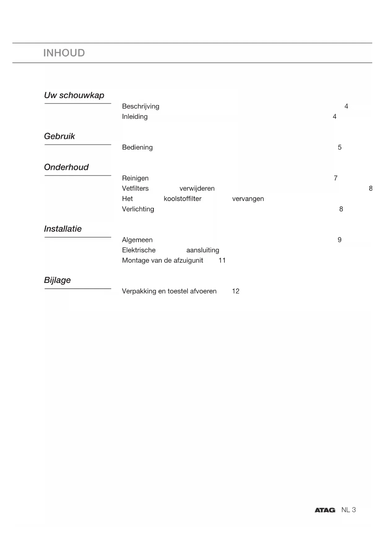 Brugervejledning DK 3 - DK 12 Gebruikte pictogrammen - Pictogrammes utilisés Benutzte Piktogramme - Pictograms used - Anvendte piktogrammer Belangrijk om te weten - Important à savoir Wissenswertes - Important information - Vigtig information Tip - Conseil - Tipp - Tip - TipsNL 3 INHOUD Uw schouwkap Beschrijving 4 Inleiding 4 Gebruik Bediening 5 Onderhoud Reinigen 7 Vetfilters verwijderen 8 Het koolstoffilter vervangen 8 Verlichting 8 Installatie Algemeen 9 Elektrische aansluiting 10 Montage van de afzuigunit 11 Bijlage Verpakking en toestel afvoeren 12NL 4 Beschrijving A In/uitschakelen ventilator B Verlaging afzuigcapaciteit C Verhoging afzuigcapaciteit D Inschakelen intensiefstand E Clean air functie/filterindicatie F Timer functie G In/uitschakelen verlichting H Dimmen verlichting I Display Inleiding Als u deze gebruiksaanwijzing doorleest, bent u snel op de hoogte van alle mogelijk heden die dit toestel u biedt. U vindt informatie voor uw veiligheid en over het onderhoud van het toestel. Bewaar de gebruiksaanwijzing en het installatievoorschrift. Een eventueel volgende gebruiker van dit toestel kan daar zijn voordeel mee doen. Lees voor gebruik eerst de separate veiligheidsinstructies. UW SCHOUWKAP INL 5 Bediening Ventilator in- en uitschakelen