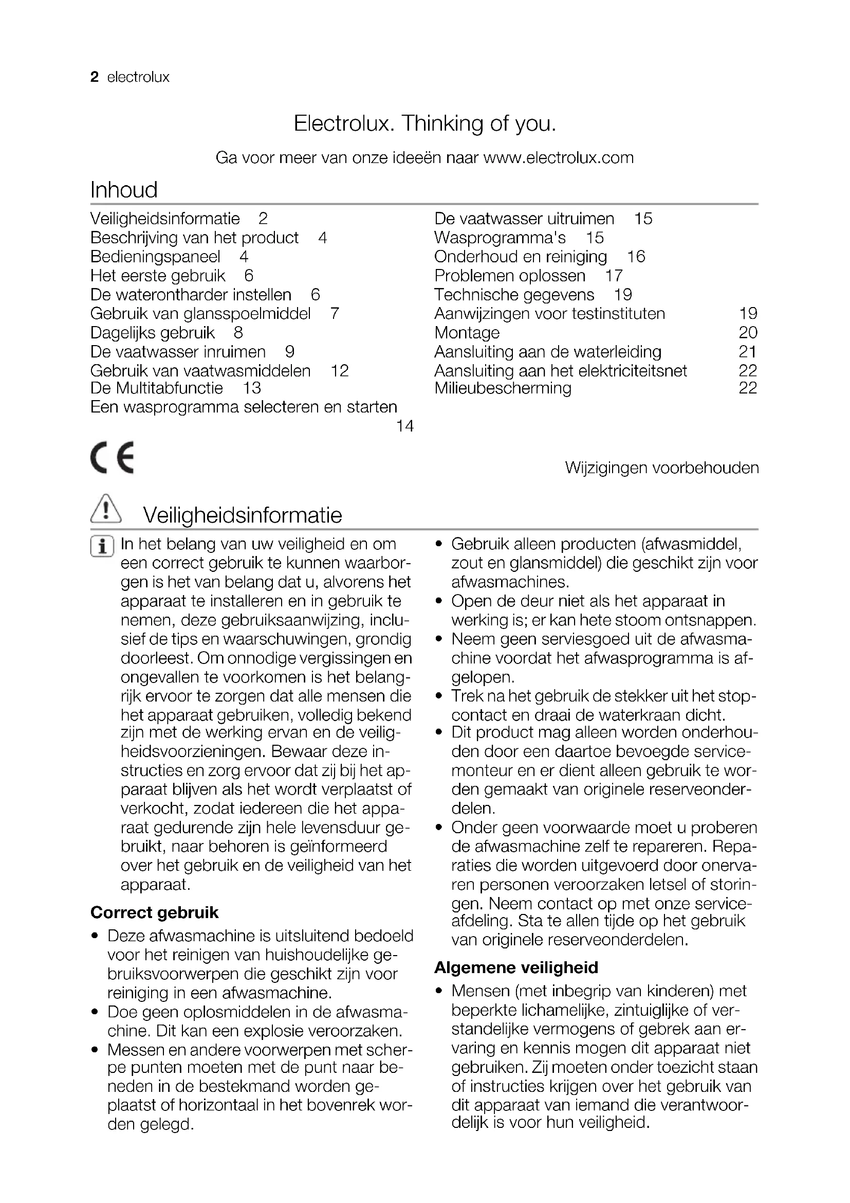 gebruiksaanwijzing notice d'utilisation benutzerinformation Afwasmachine Lave-vaisselle Geschirrspüler ESL 66022Electrolux. Thinking of you. Ga voor meer van onze ideeën naar www.electrolux.com Inhoud Veiligheidsinformatie 2 Beschrijving van het product 4 Bedieningspaneel 4 Het eerste gebruik 6 De waterontharder instellen 6 Gebruik van glansspoelmiddel 7 Dagelijks gebruik 8 De vaatwasser inruimen 9 Gebruik van vaatwasmiddelen 12 De Multitabfunctie 13 Een wasprogramma selecteren en starten