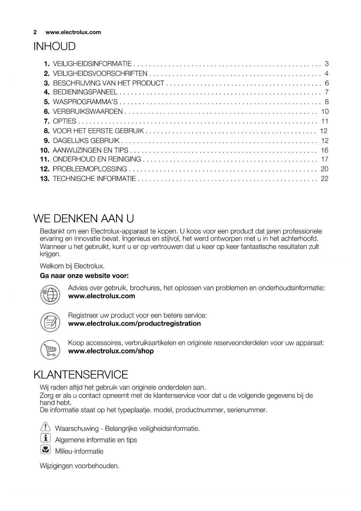 Bedankt om een Electrolux-apparaat te kopen. U koos voor een product dat jaren professionele ervaring en innovatie bevat. Ingenieus en stijlvol, het werd ontworpen met u in het achterhoofd. Wanneer u het gebruikt, kunt u er op vertrouwen dat u keer op keer fantastische resultaten zult krijgen. Welkom bij Electrolux. Ga naar onze website voor: Advies over gebruik, brochures, het oplossen van problemen en onderhoudsinformatie: www.electrolux.com Registreer uw product voor een betere service: www.electrolux.com/productregistration Koop accessoires, verbruiksartikelen en originele reserveonderdelen voor uw apparaat: www.electrolux.com/shop KLANTENSERVICE Wij raden altijd het gebruik van originele onderdelen aan. Zorg er als u contact opneemt met de klantenservice voor dat u de volgende gegevens bij de hand hebt. De informatie staat op het typeplaatje. model, productnummer, serienummer. Waarschuwing - Belangrijke veiligheidsinformatie. Algemene informatie en tips Milieu-informatie Wijzigingen voorbehouden.